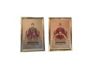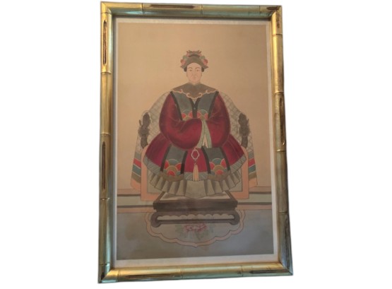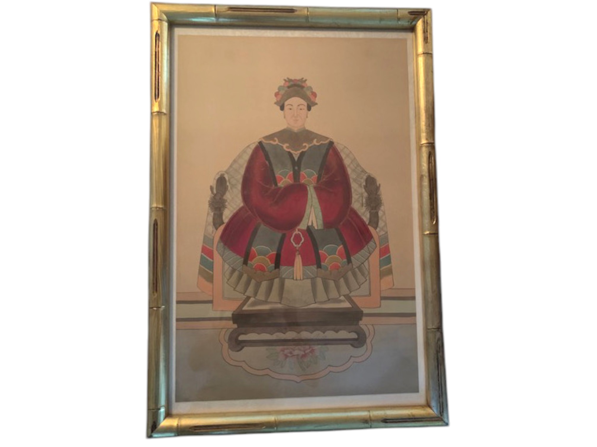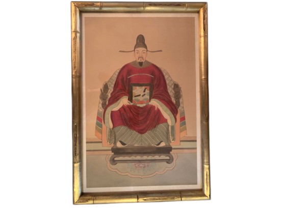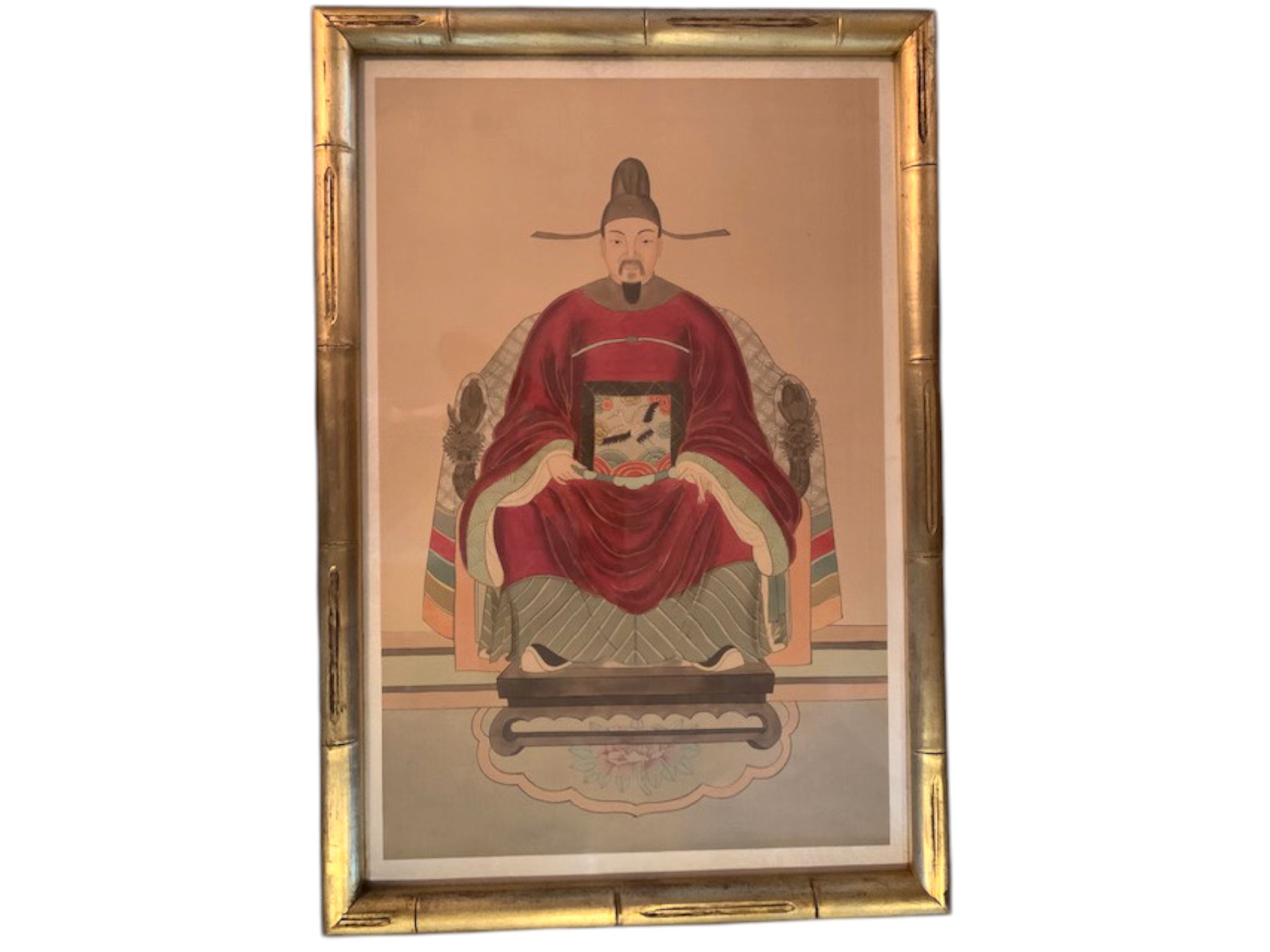 Pair of antique (19th c.) Qing dynasty (1644-1912) ancestor portraits done in ink and color on paper, depicting the Chinese emperor and empress seated on their thrones in traditional garments. Each framed in gold bamboo frames