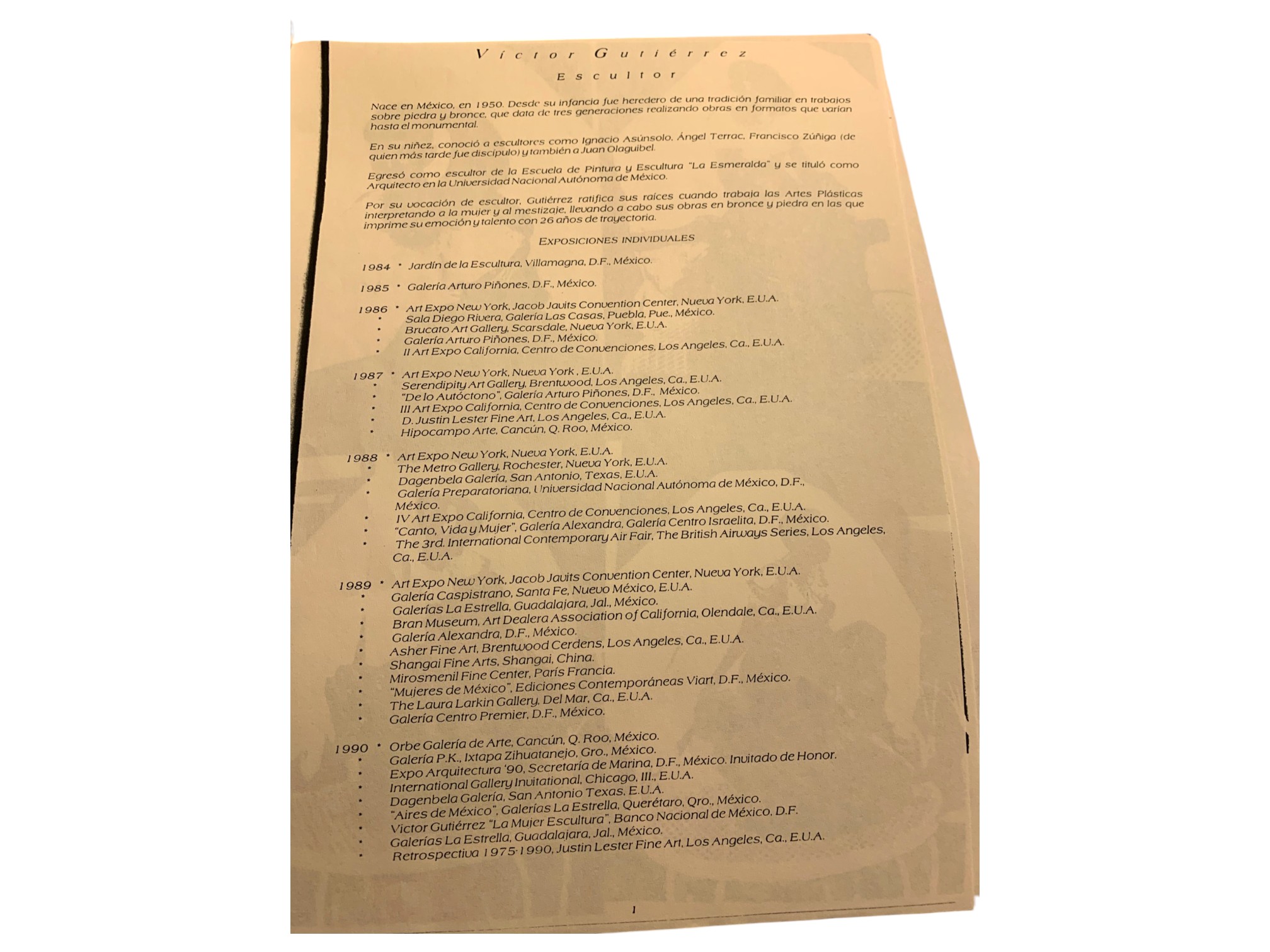 Victor Gutierrez is a Mexican architect‑turned‑artist trained at the Universidad Nacional Autónoma de México, with additional studies at La Esmeralda and the Academia de San Carlos. He is known for a multidisciplinary practice spanning bronze, marble, and stone sculpture, as well as painting and draftsmanship.