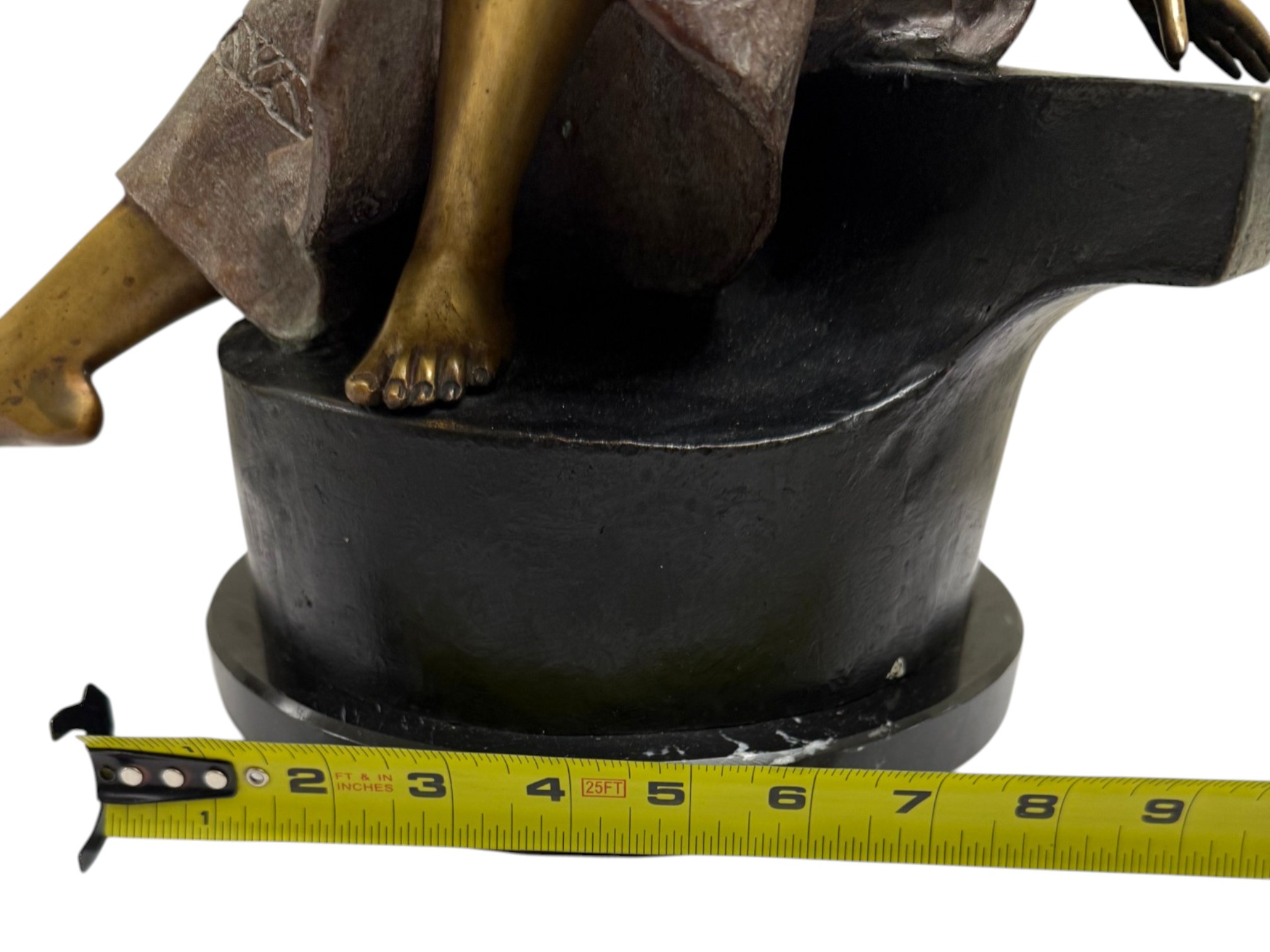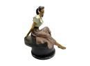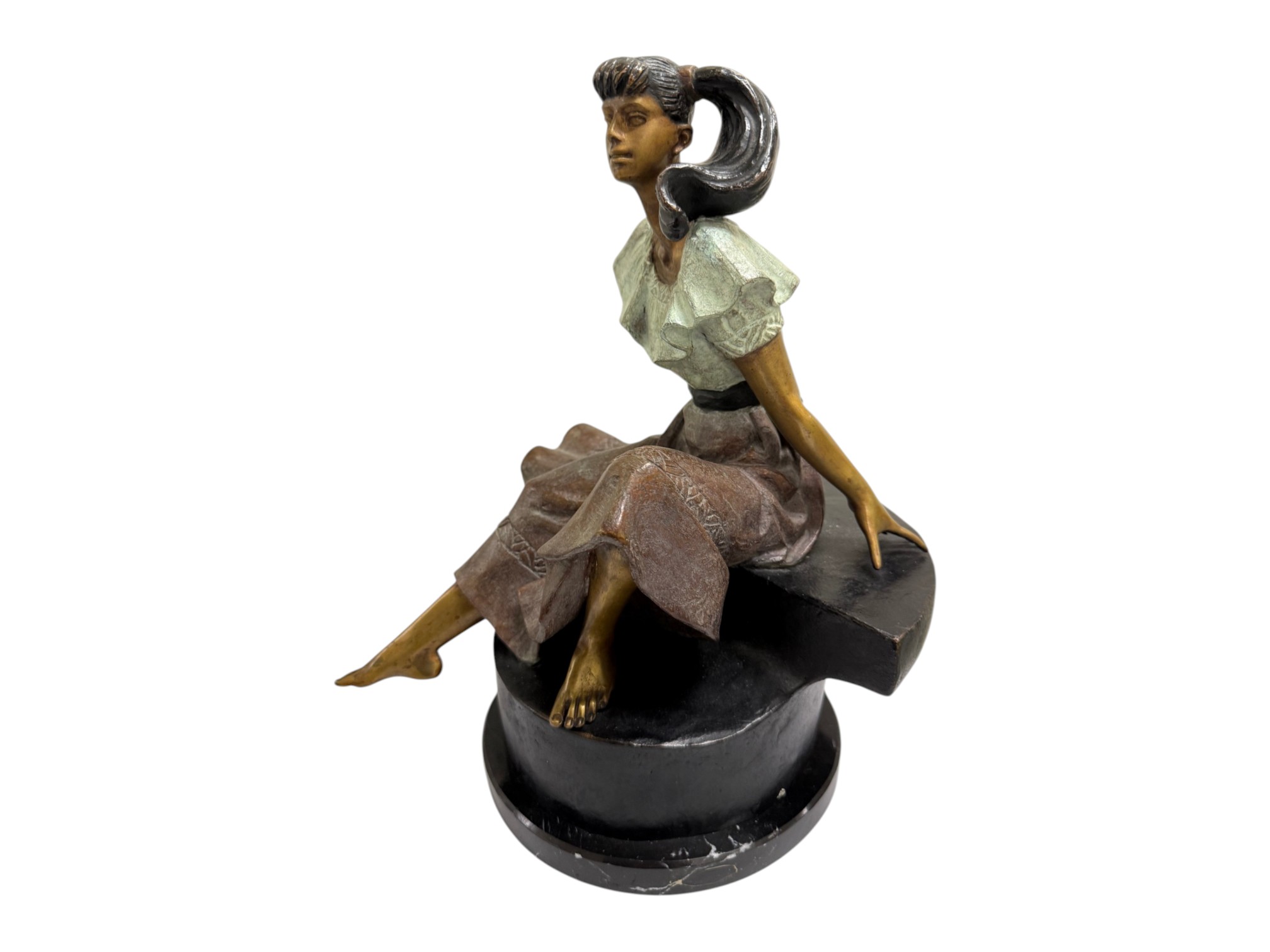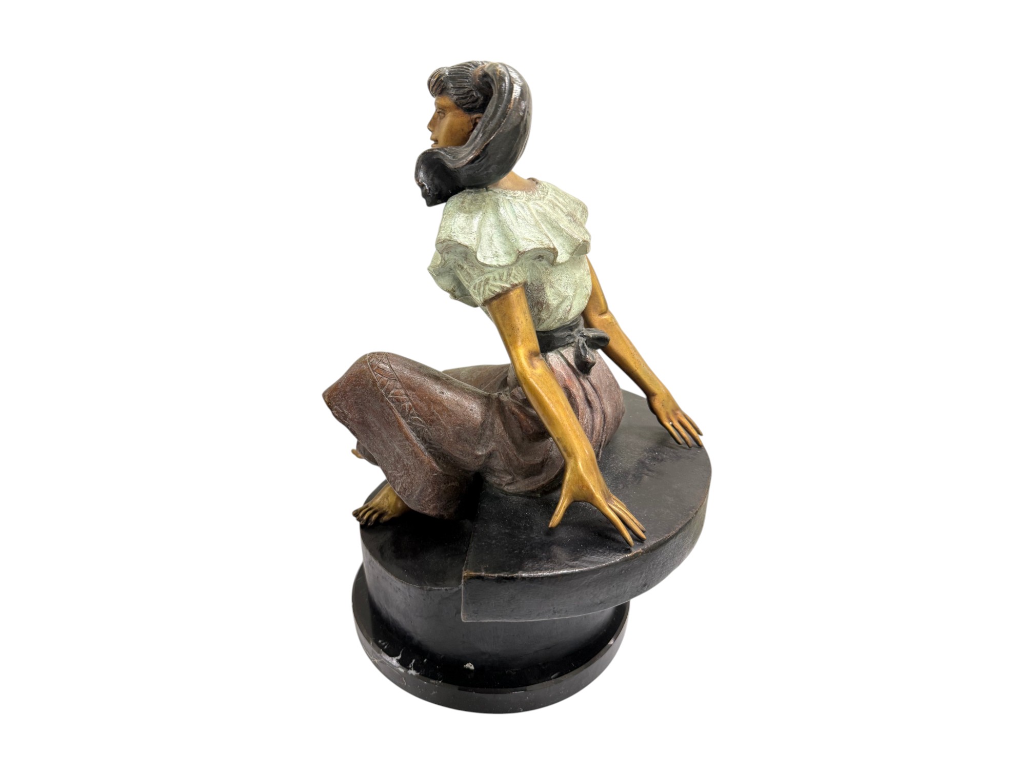 Cast bronze sculpture with a polychrome patina finish, of a seated women in traditional attire.