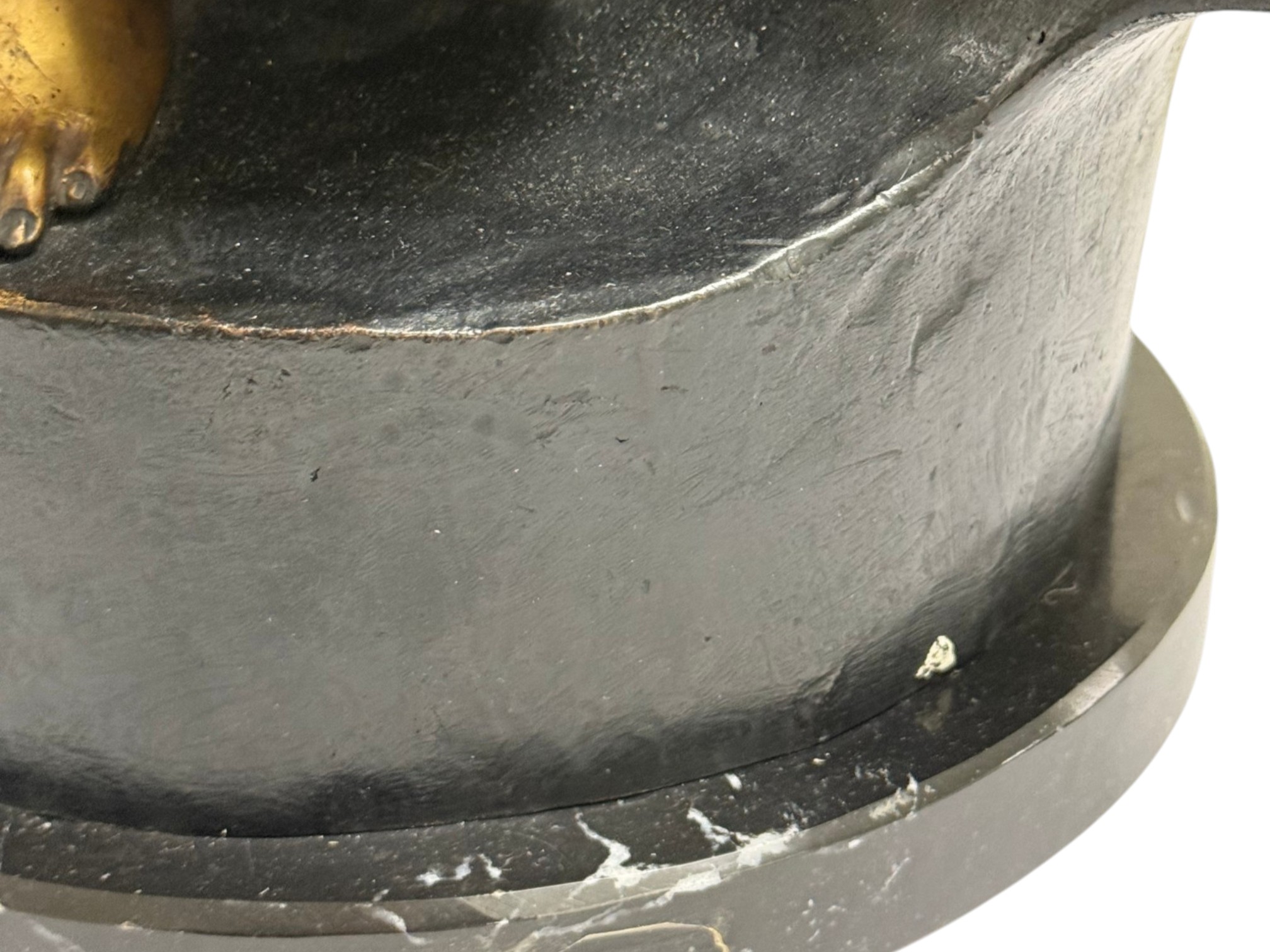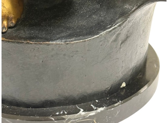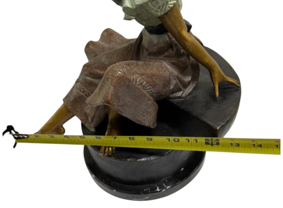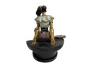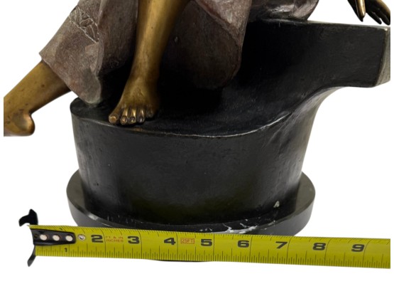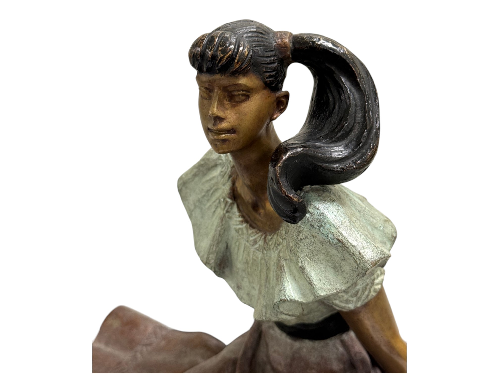 Cast bronze sculpture with a polychrome patina finish, of a seated women in traditional attire.