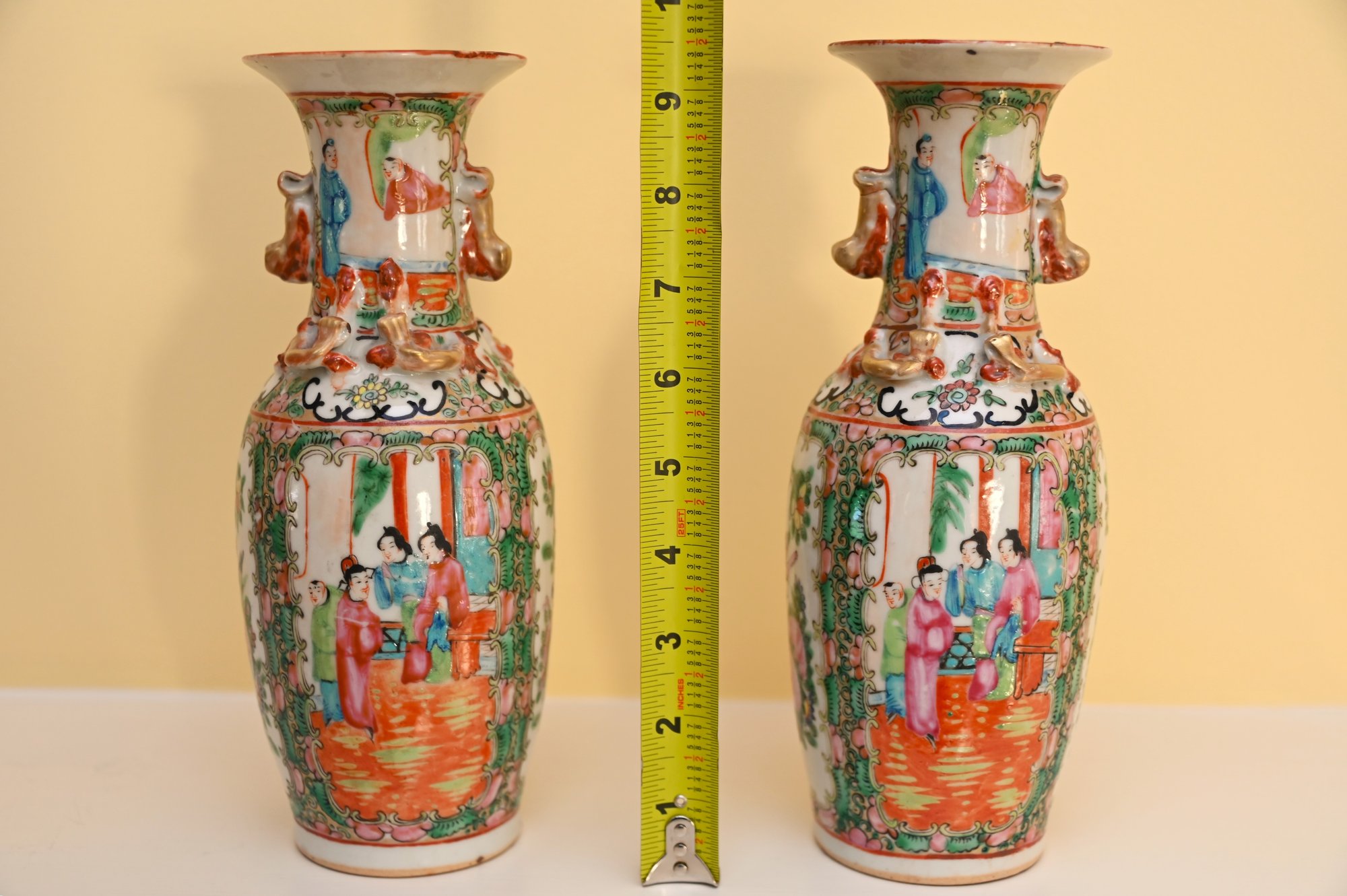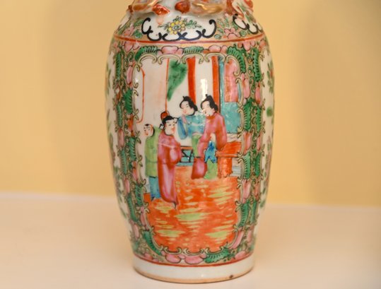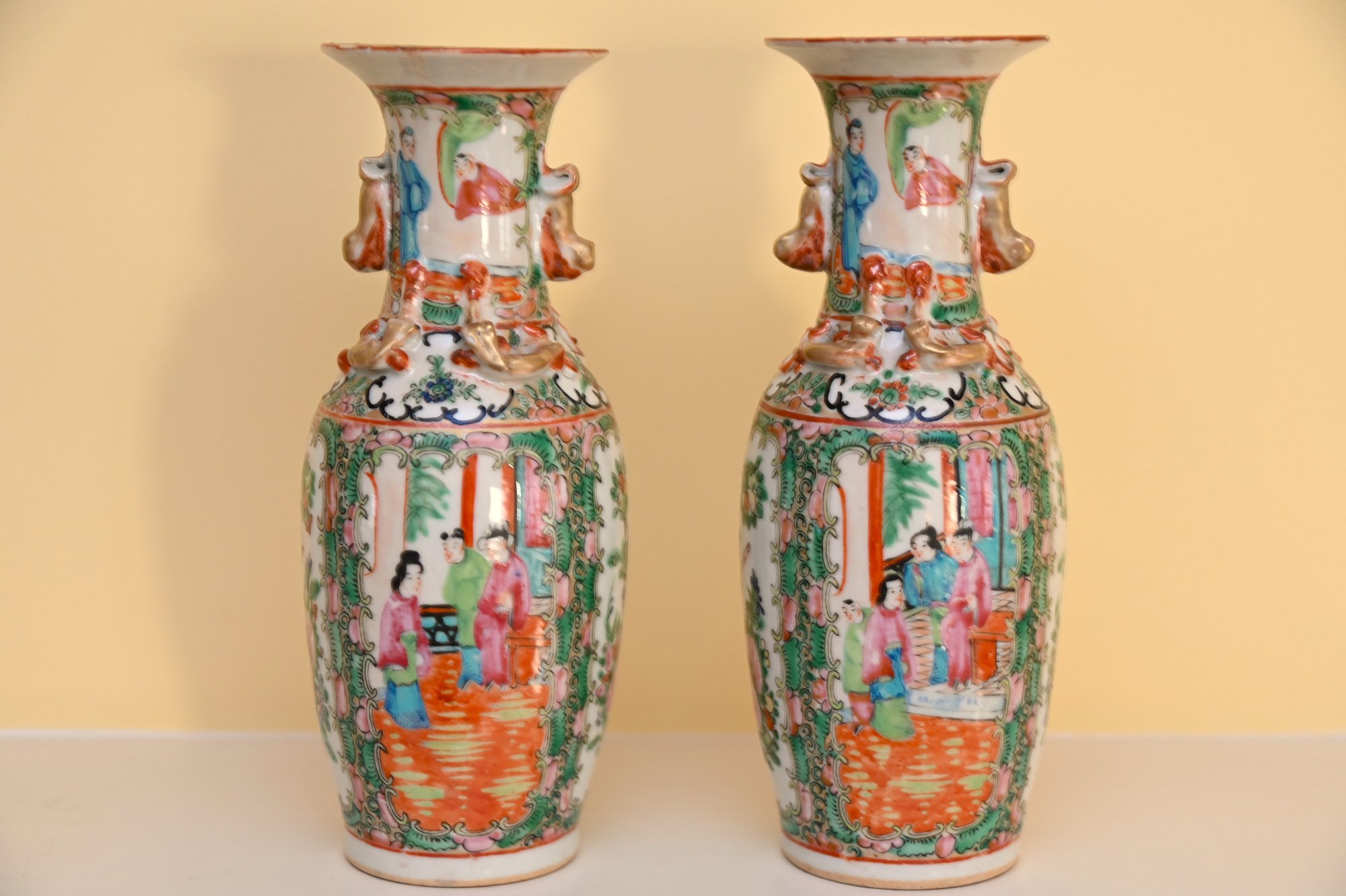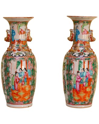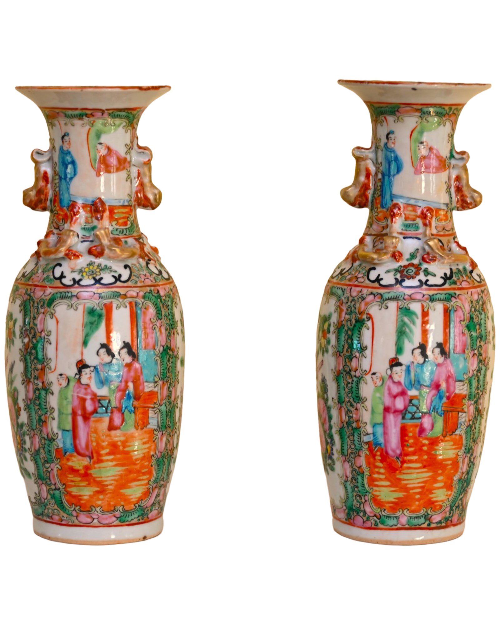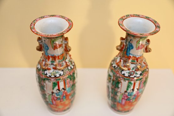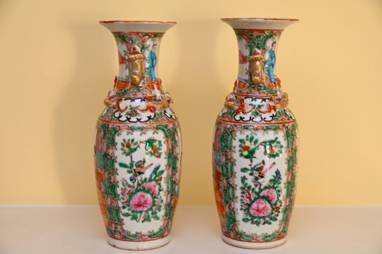 The vases are adorned with decorative gilded handles shaped like stylized foo dogs or mythical creatures, adding to their ornate appearance. The intricate borders surrounding the figural scenes include floral patterns, delicate scrollwork, and auspicious symbols. The characteristic palette of pinks, greens, and gold accents is a defining feature of Rose Medallion porcelain, which was made primarily for export to Western markets during the 18th and 19th centuries.