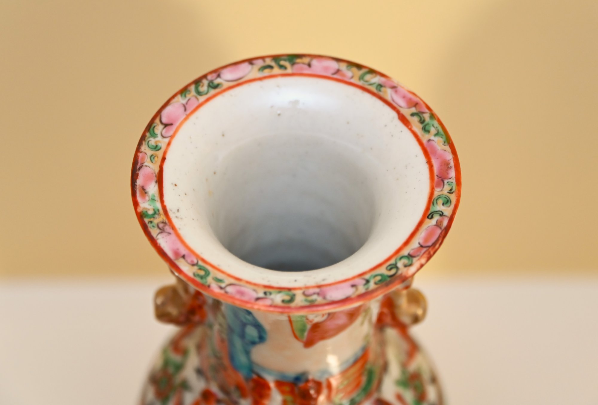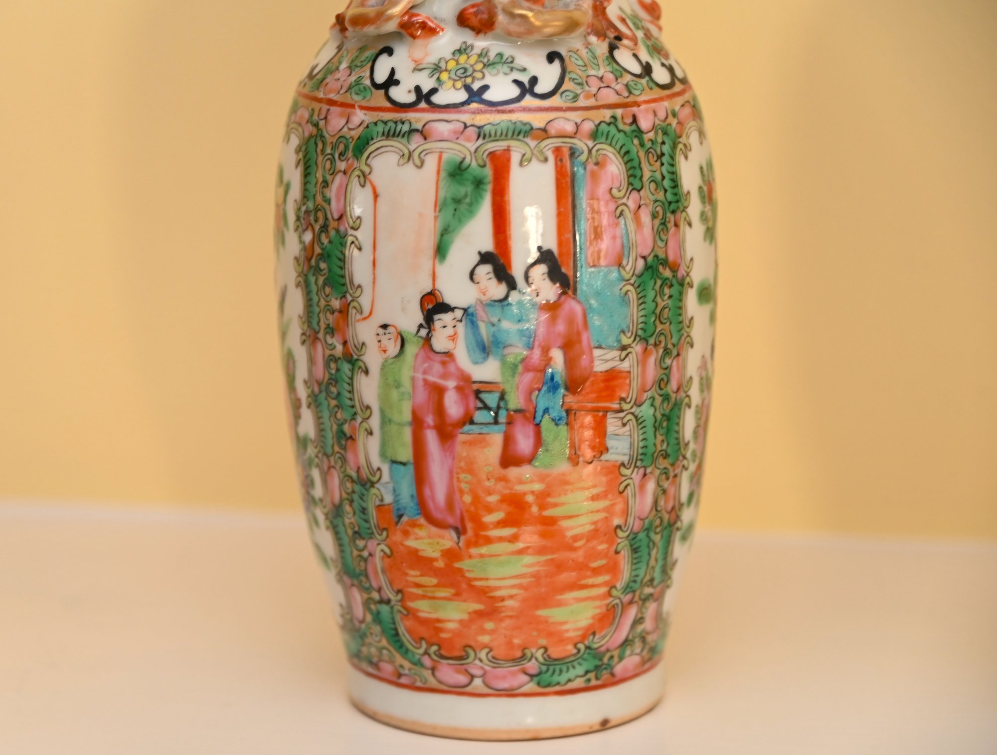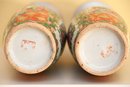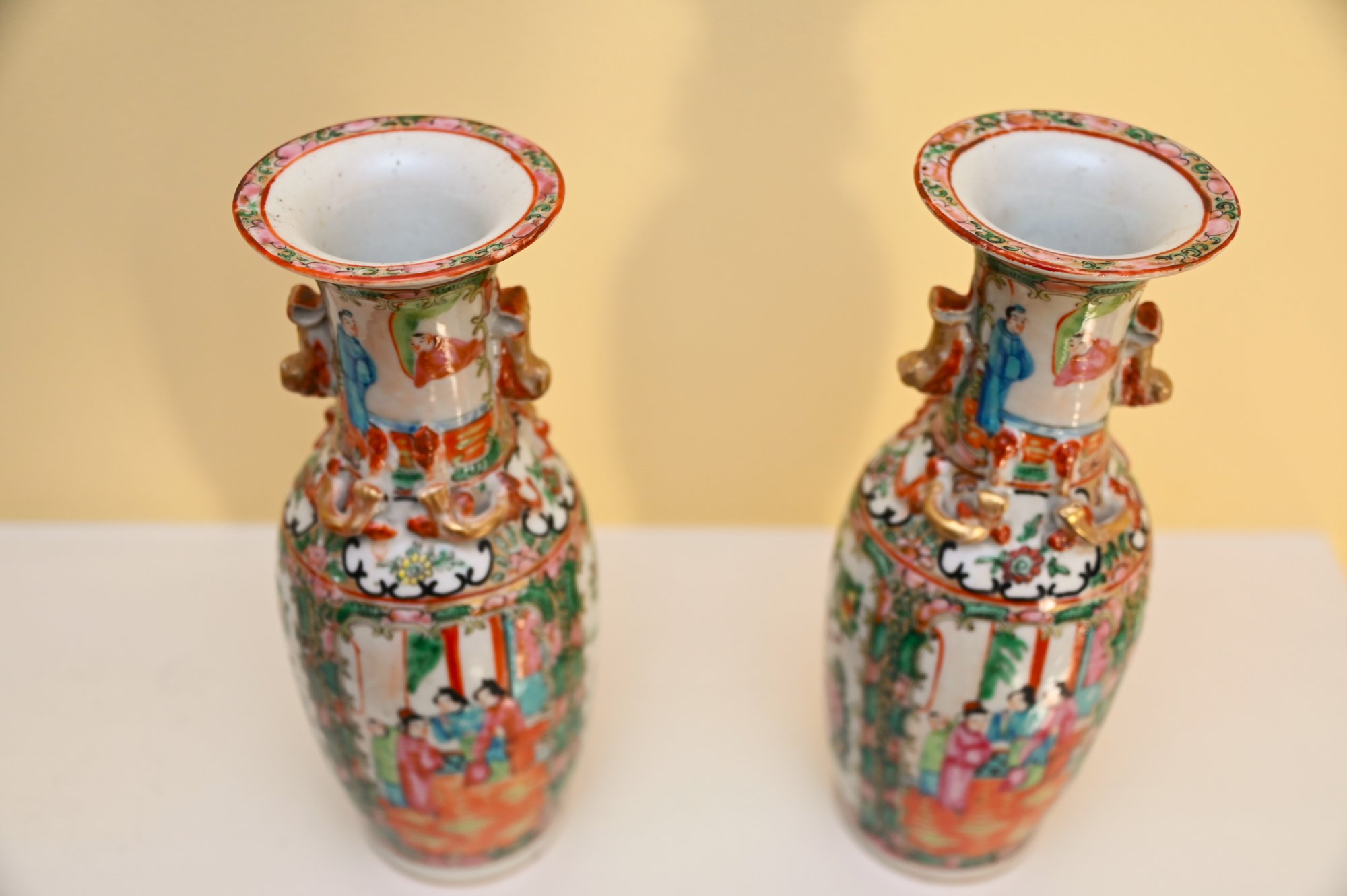 The vases are adorned with decorative gilded handles shaped like stylized foo dogs or mythical creatures, adding to their ornate appearance. The intricate borders surrounding the figural scenes include floral patterns, delicate scrollwork, and auspicious symbols. The characteristic palette of pinks, greens, and gold accents is a defining feature of Rose Medallion porcelain, which was made primarily for export to Western markets during the 18th and 19th centuries.