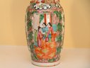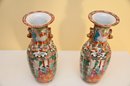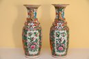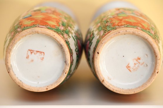 This is a pair of antique Chinese porcelain vases in the Rose Medallion style, a highly collectible design originating from the Qing Dynasty and commonly produced in the 19th and early 20th centuries. Each vase features a hand-painted scene depicting traditional Chinese figures engaged in conversation within a courtyard or palace setting, framed by elaborate floral and scroll motifs in vibrant shades of green, pink, orange, and blue.