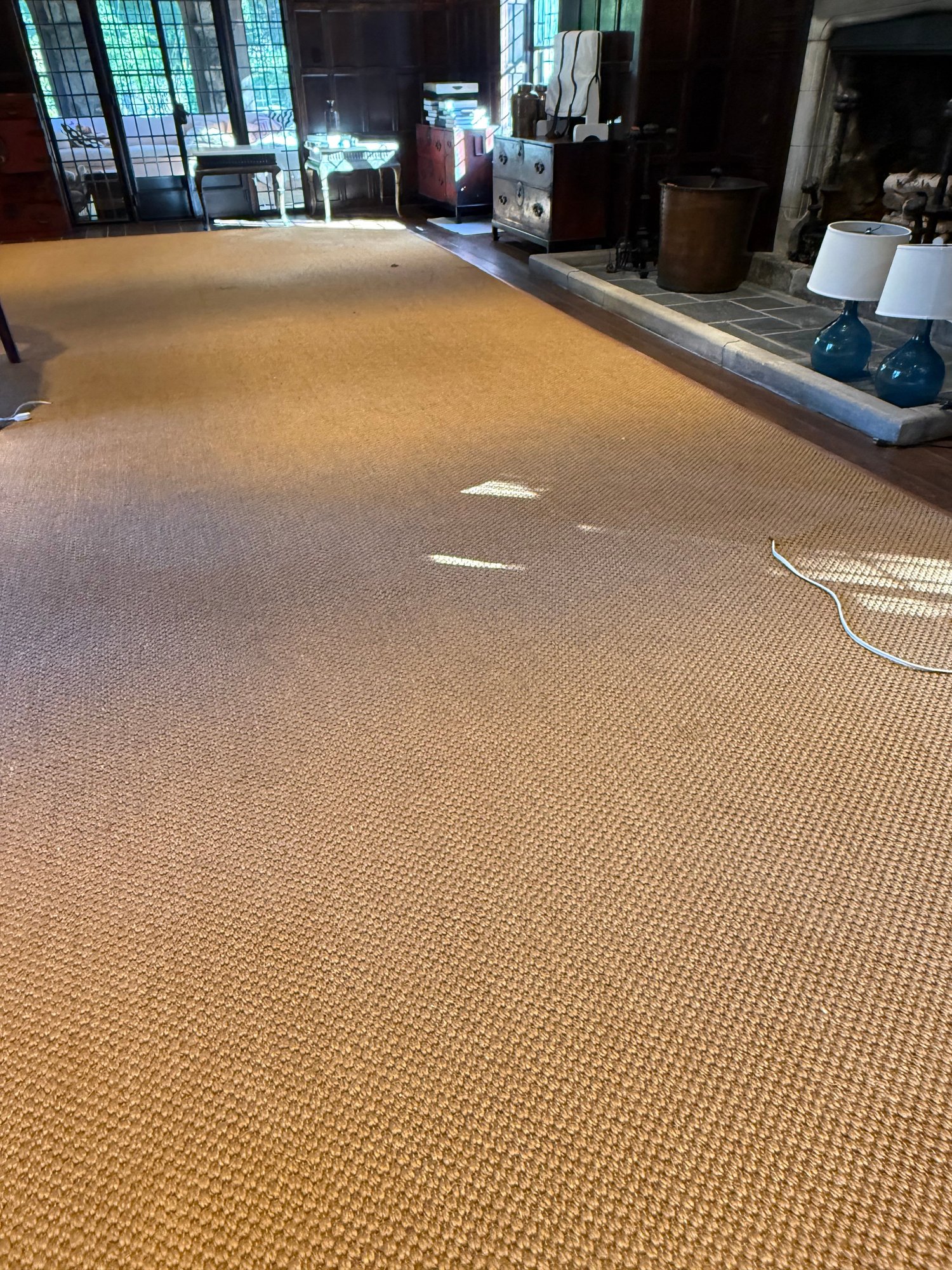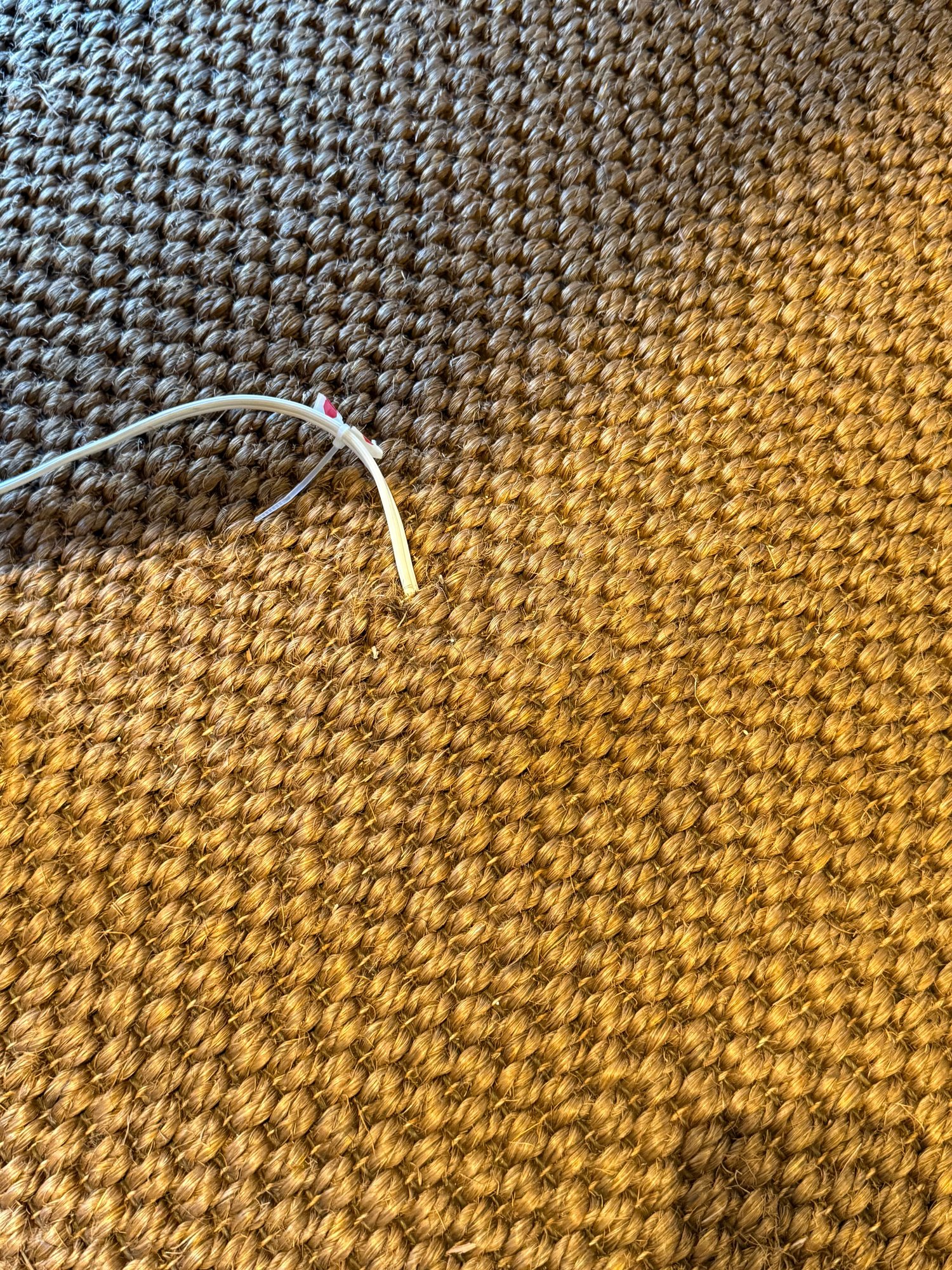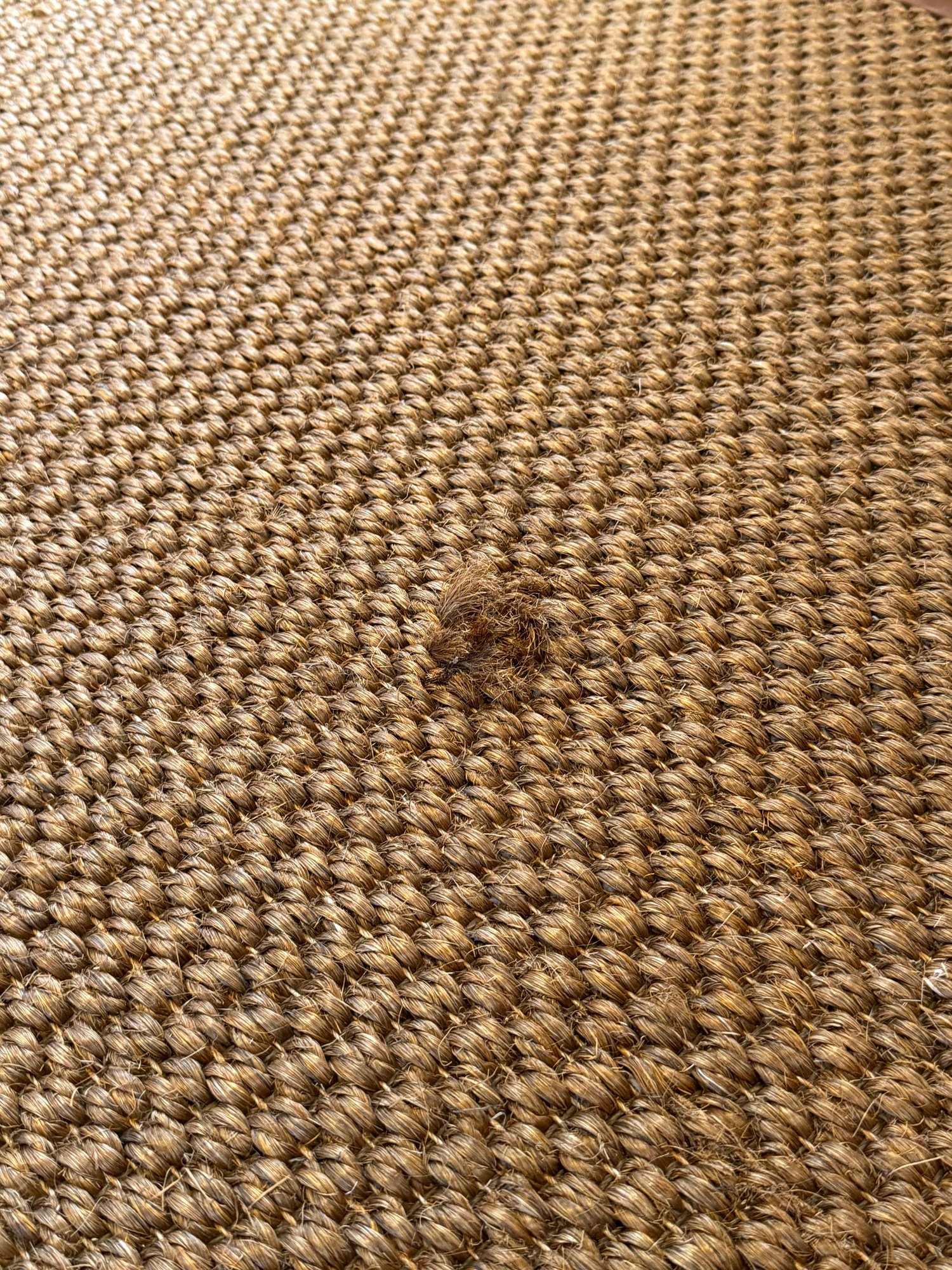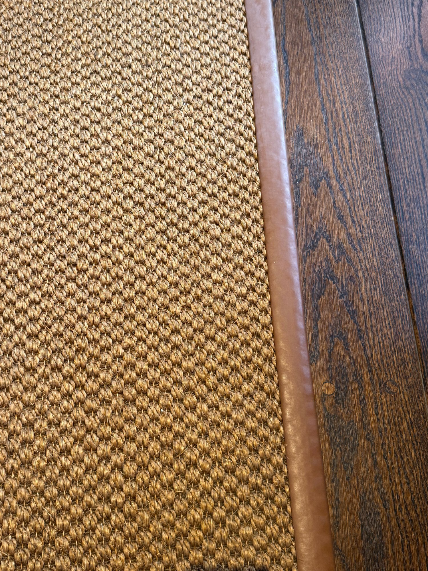 Natural fiber woven area rug with a brown leather border. One small pull.