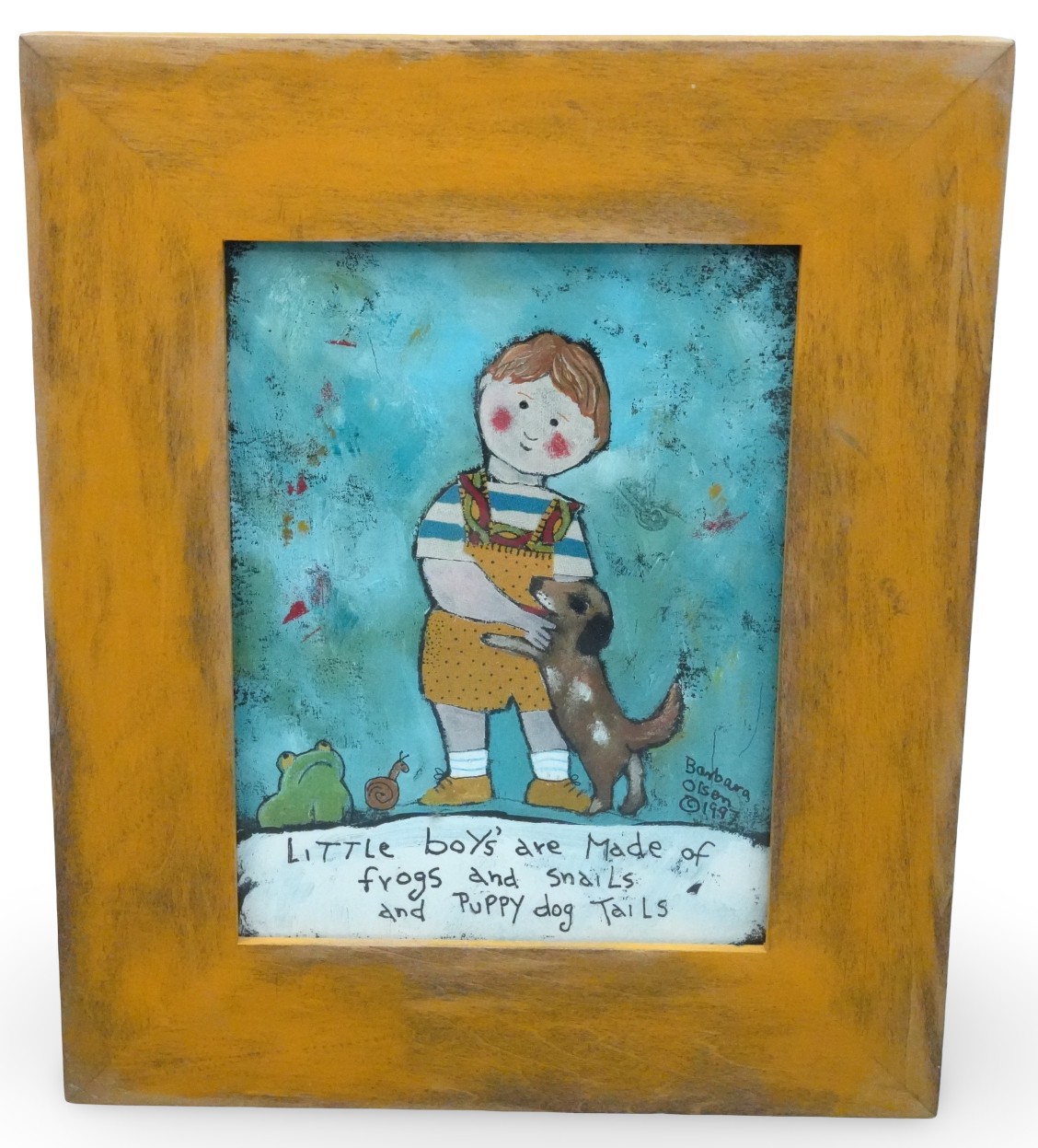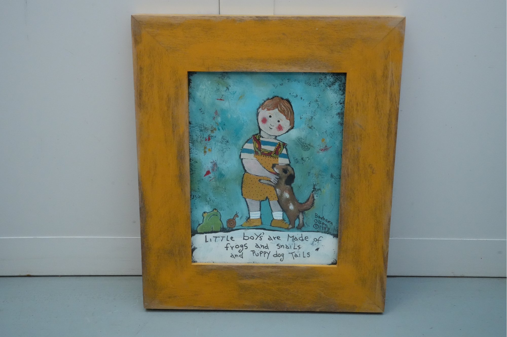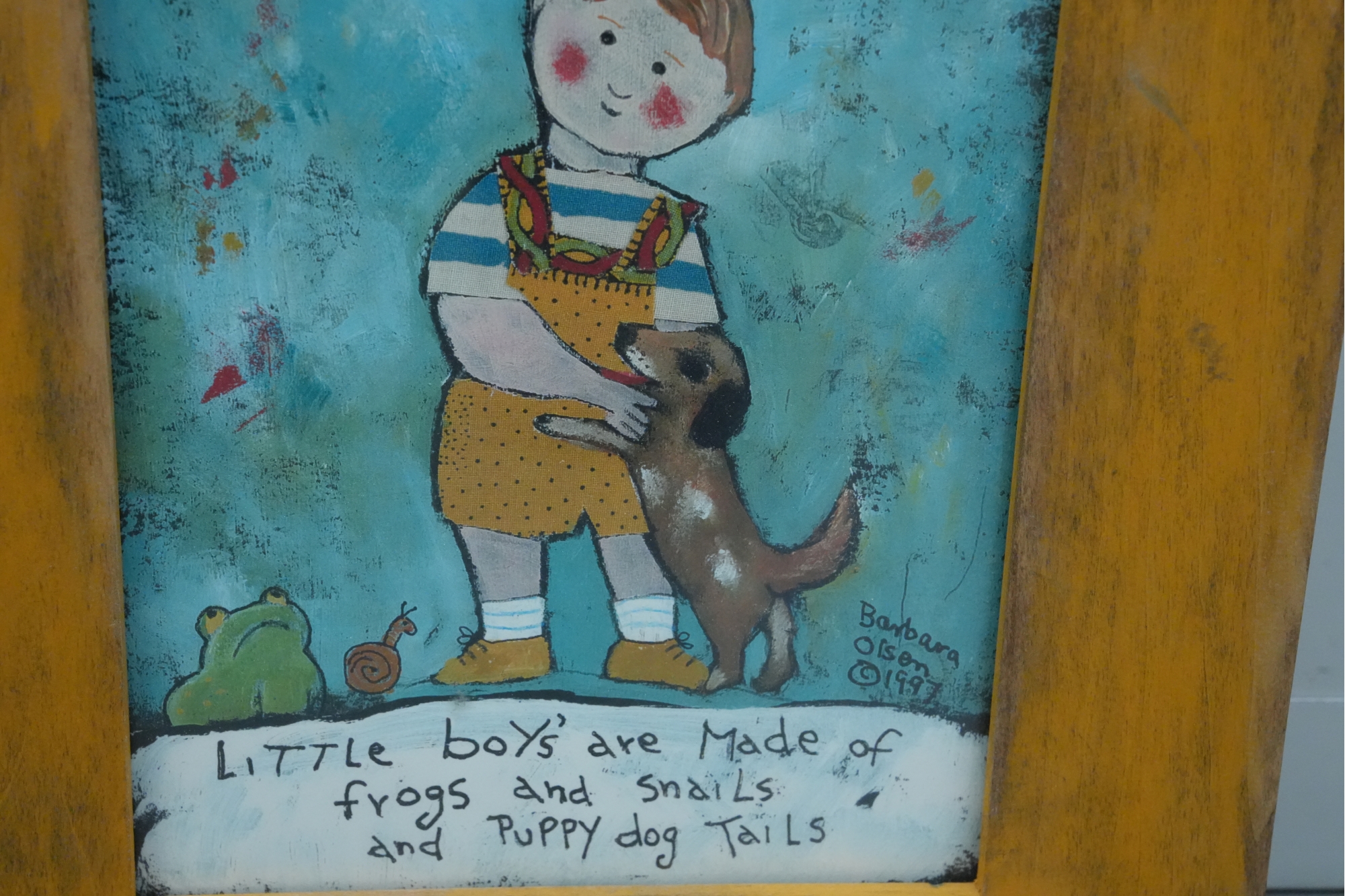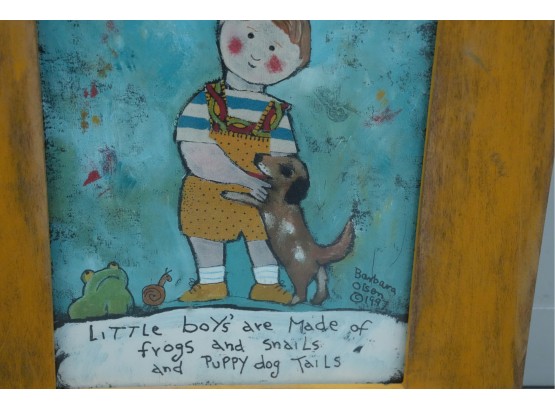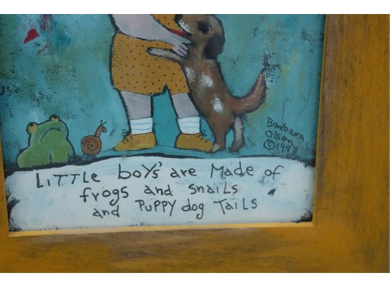 Artwork depicting a boy with the classic nursery rhyme quoted at the bottom: “Little boys are made of snakes and snails and puppy dog tails."