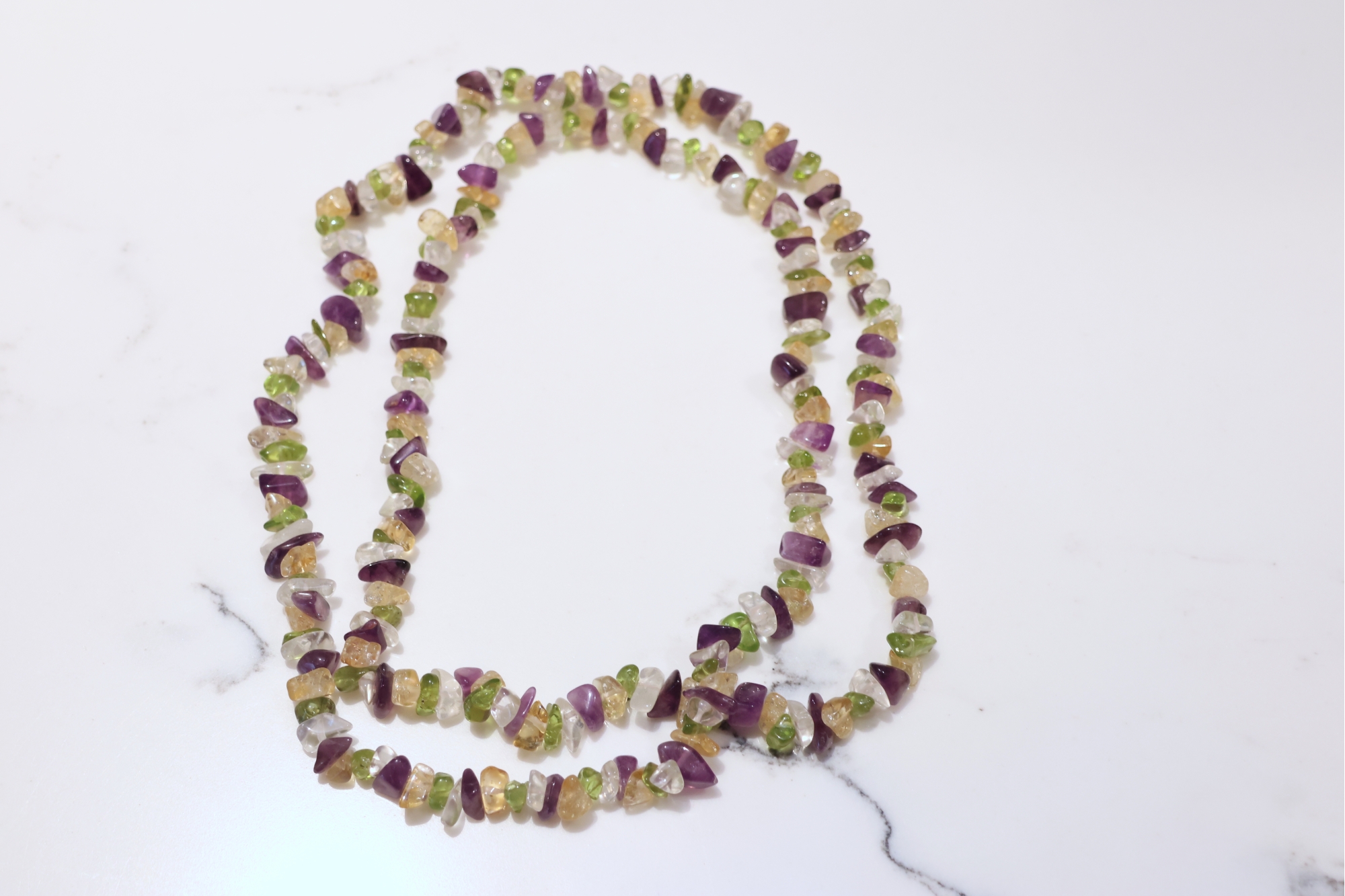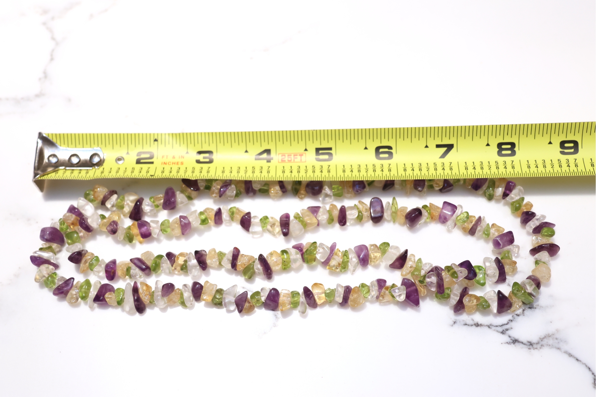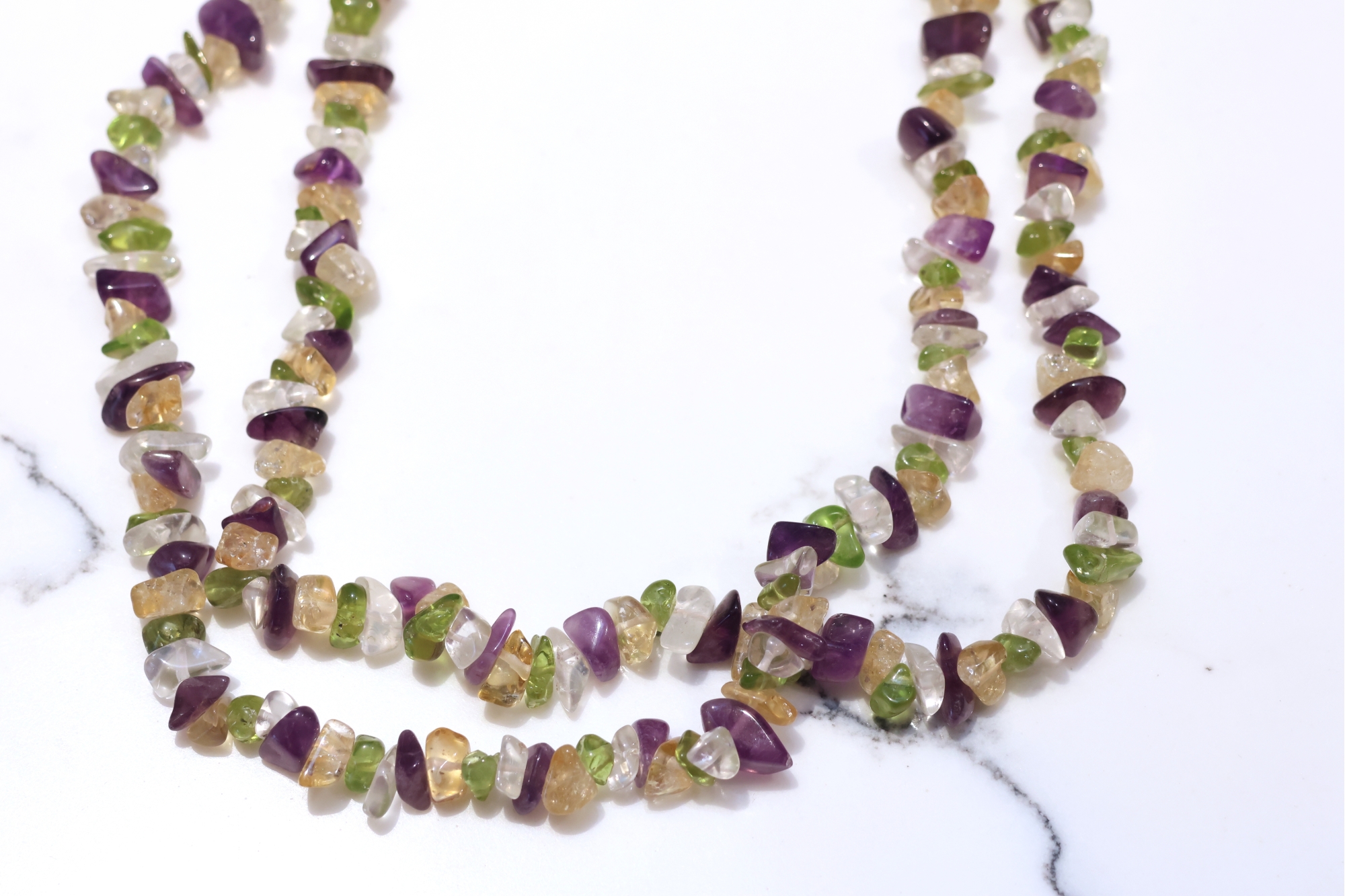 Multi-gemstone chip beaded necklace featuring semi-precious stones such as amethyst, peridot, citrine, and quartz.