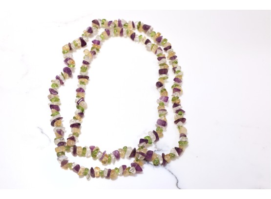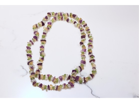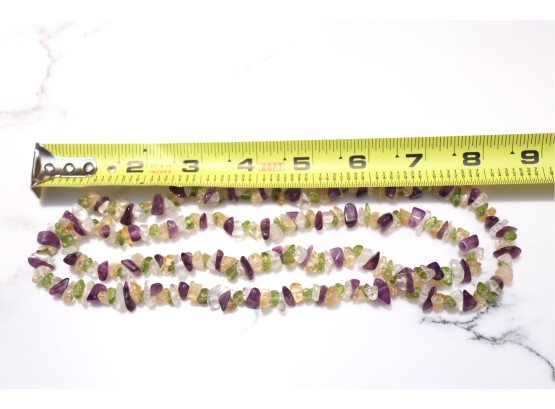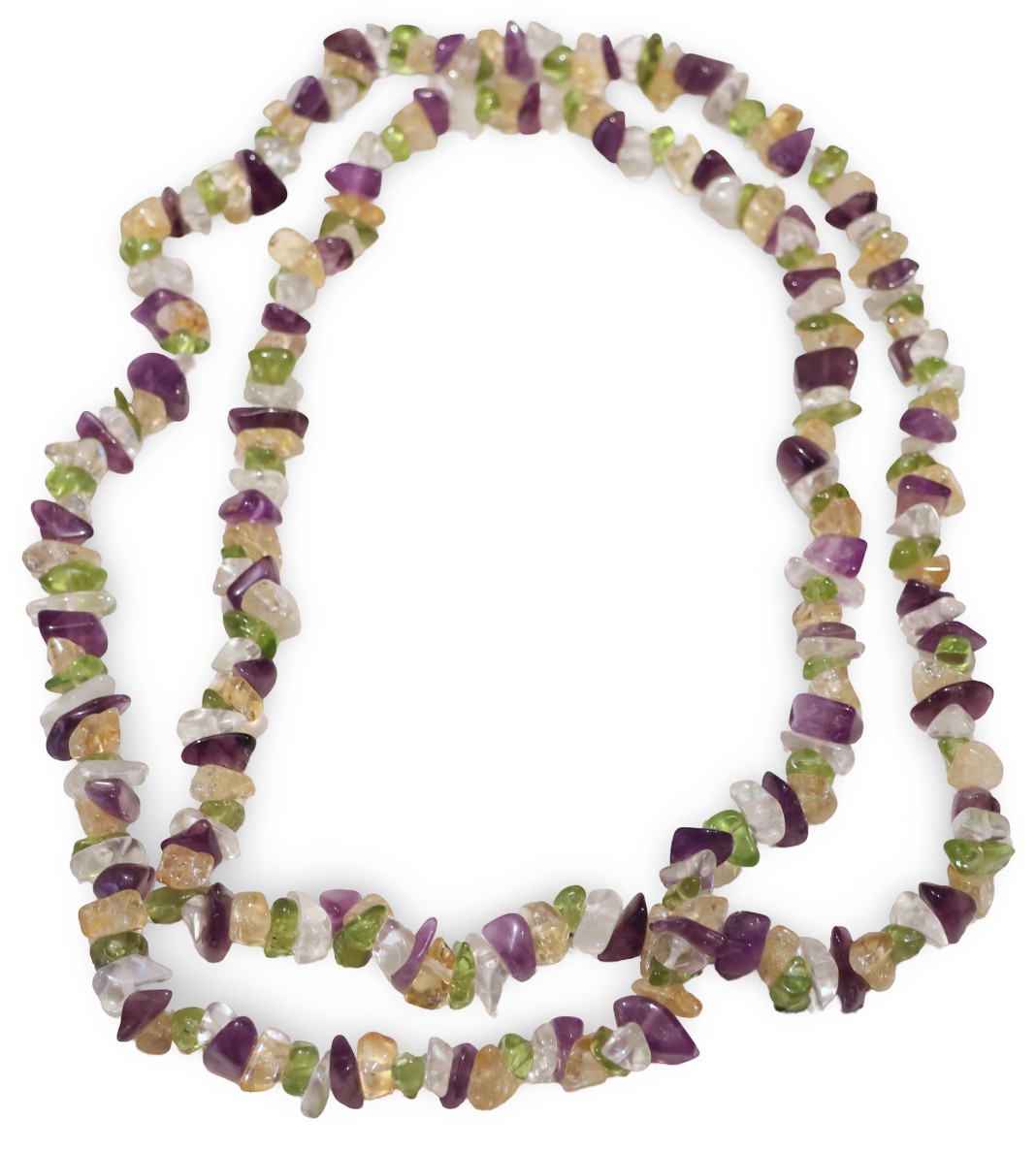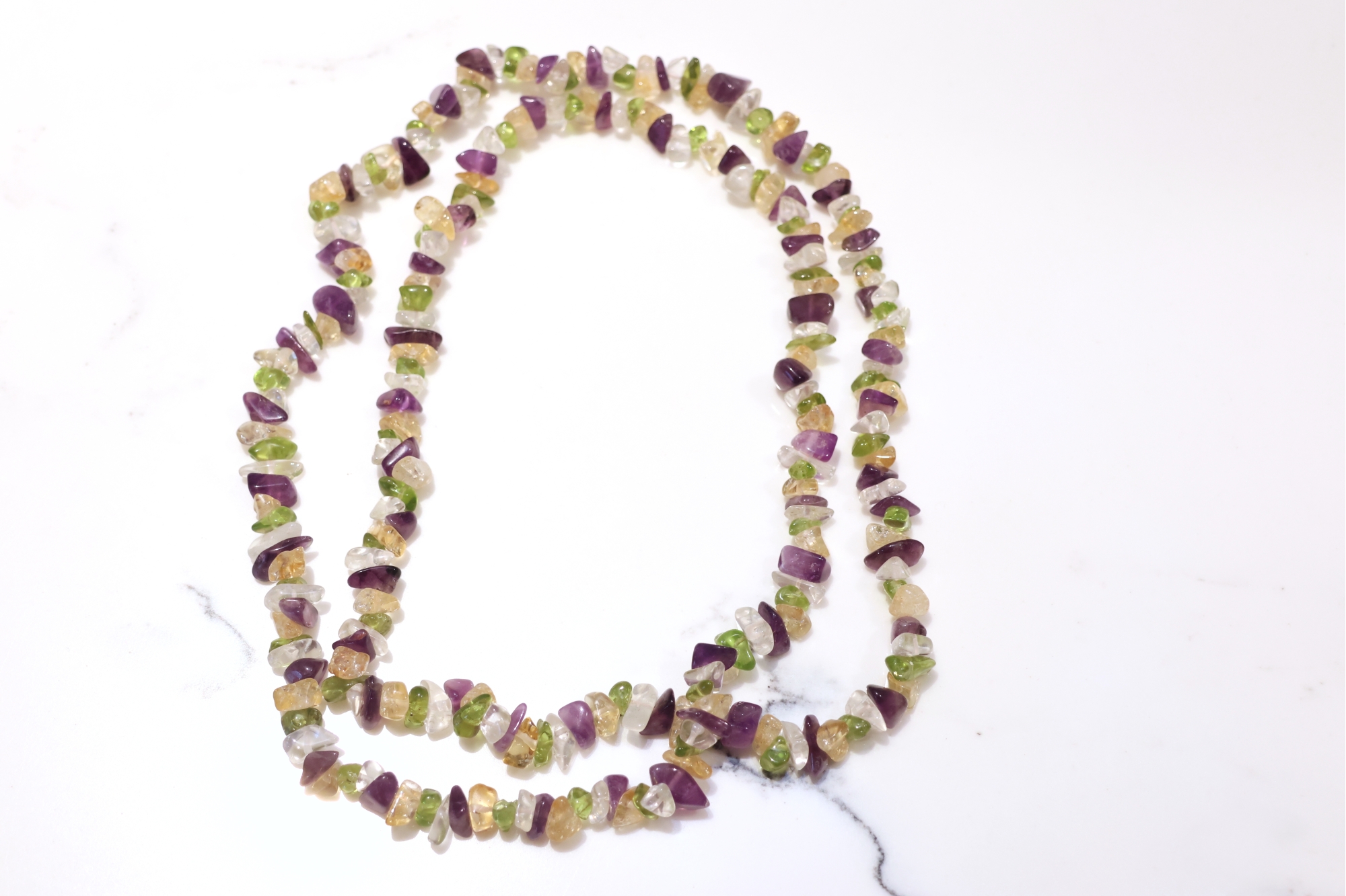 Multi-gemstone chip beaded necklace featuring semi-precious stones such as amethyst, peridot, citrine, and quartz.