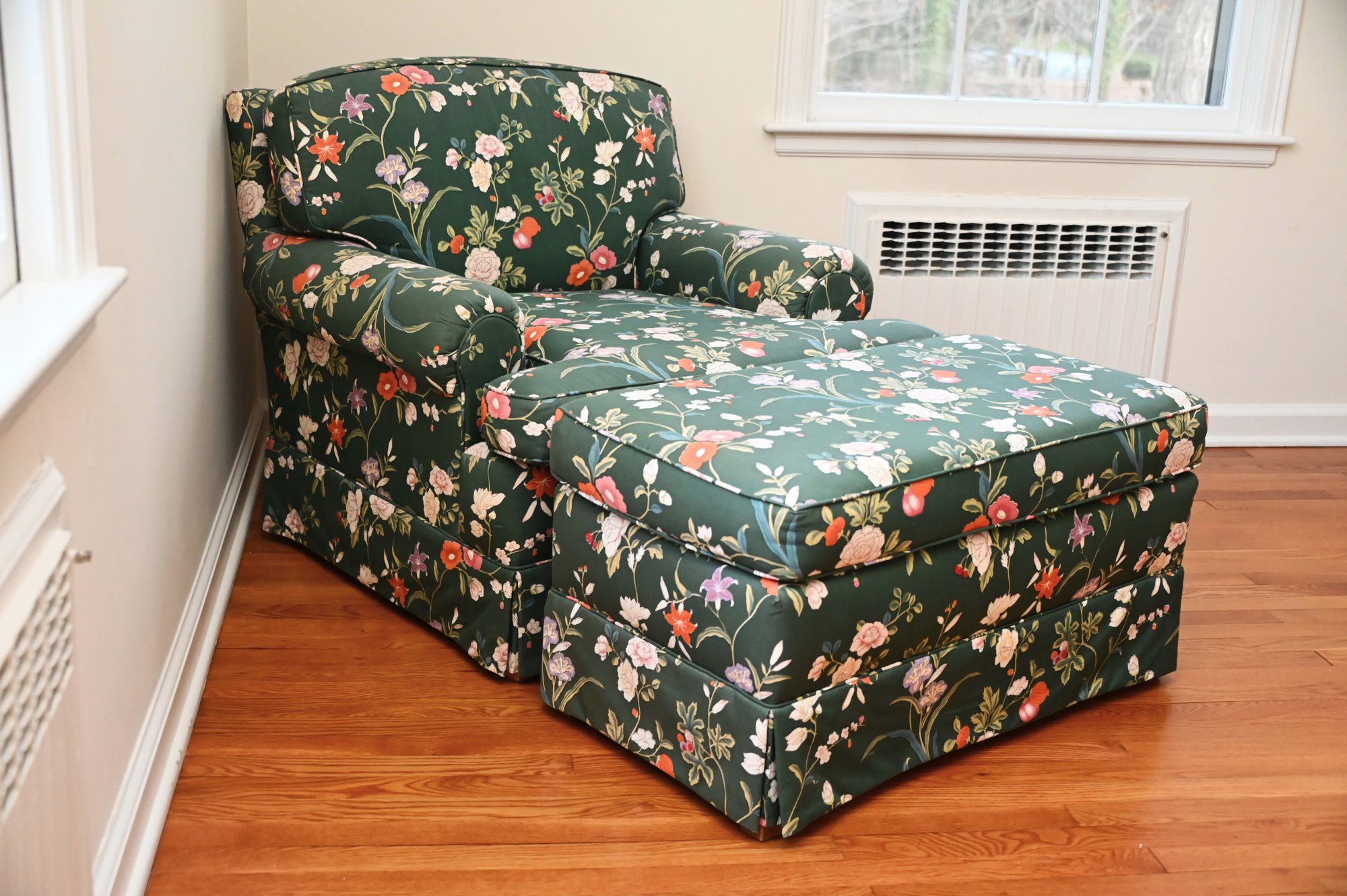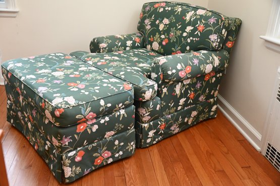 The chair itself has a classic rolled-arm design, generously cushioned for comfort, and a tailored skirt along the base for a refined finish. The accompanying ottoman is equally well-padded and covered in the same floral fabric, serving as both a footrest and additional seating.
