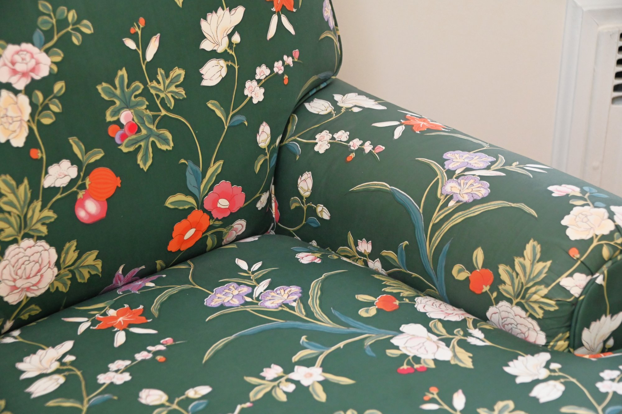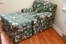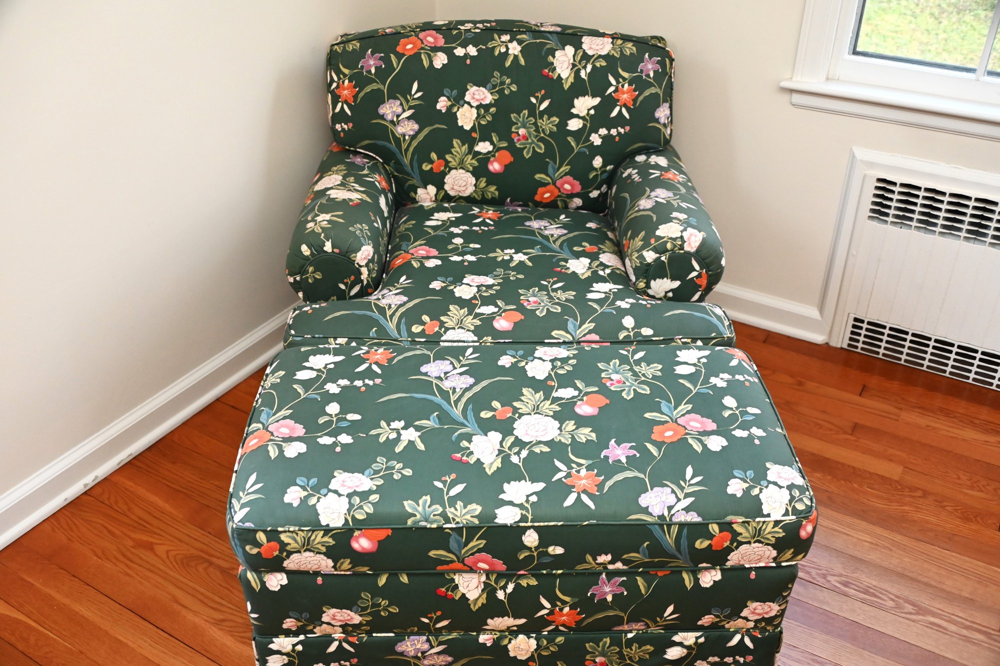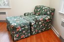 This is a beautifully upholstered armchair with a matching ottoman, featuring a rich floral fabric on a deep green background. The upholstery is adorned with a detailed botanical pattern showcasing colorful flowers, leaves, and vines, giving it a timeless, elegant appeal.