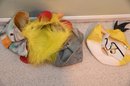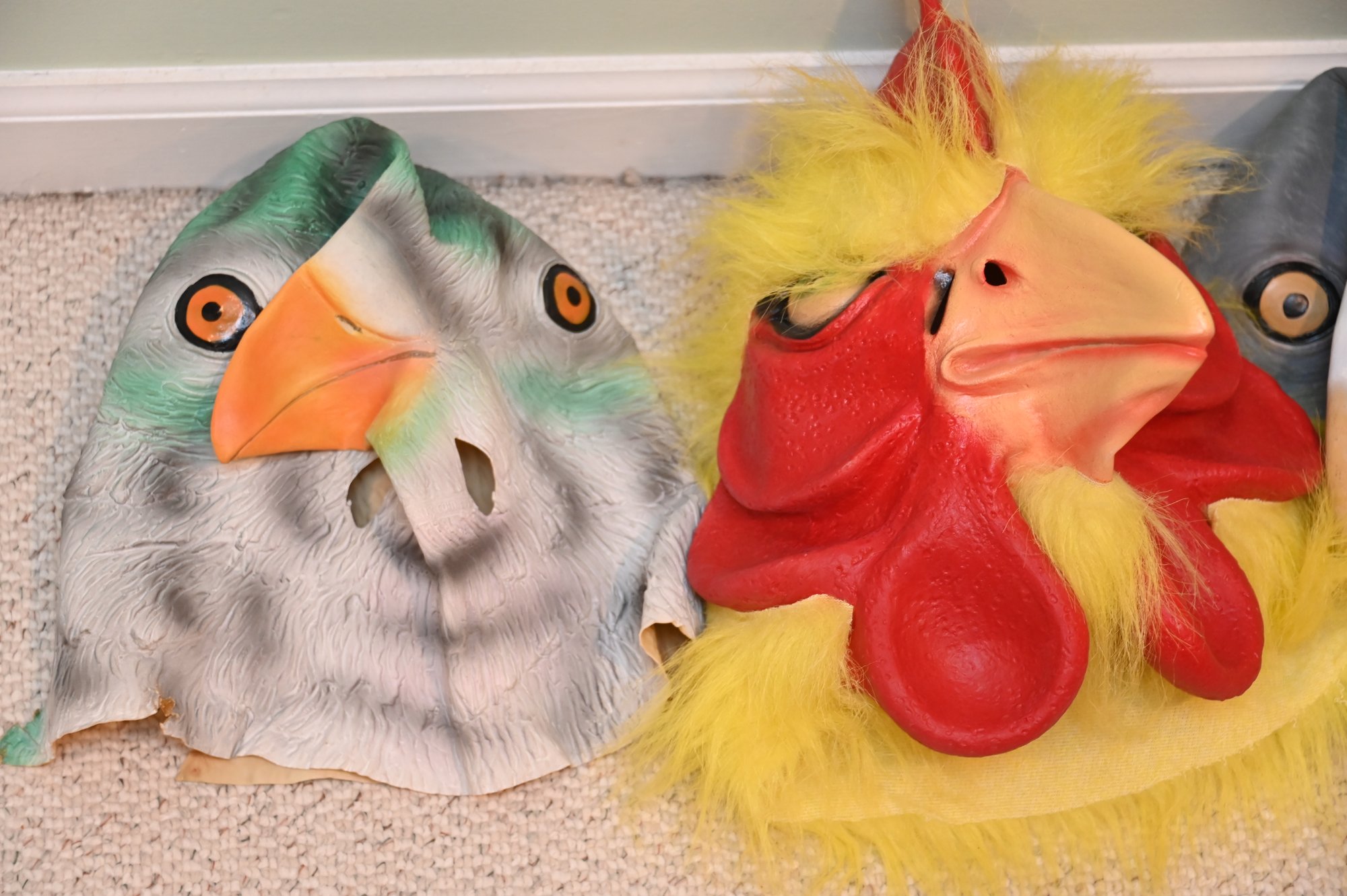 Second Mask (Second from Left) - A vibrant rooster mask with a bright red comb, yellow fluffy feathers, and a distinct beak, giving it a realistic farmyard appearance.