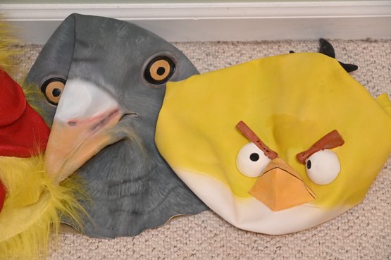 Fourth Mask (Rightmost) - A cartoon-style yellow bird mask with an exaggerated expression and furrowed brows, resembling the "Angry Birds" character.