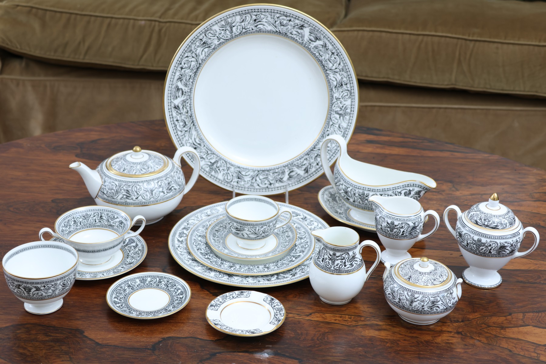 13 dinner, 13 salad, 12 dessert, 12 saucers, 10 cups, 8 small plates, 12 ash trays, 8 soup bowls, 2 cream, 2 sugar, 1 gravy boat, 1 footed bowl, 1 large plate, 1 teapot