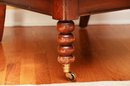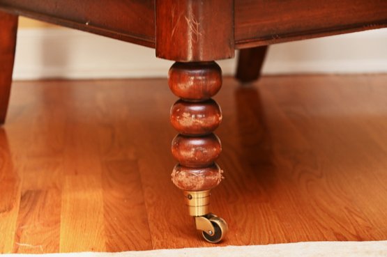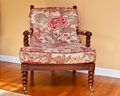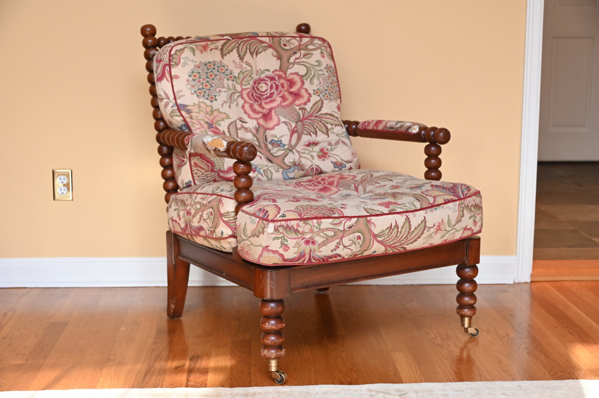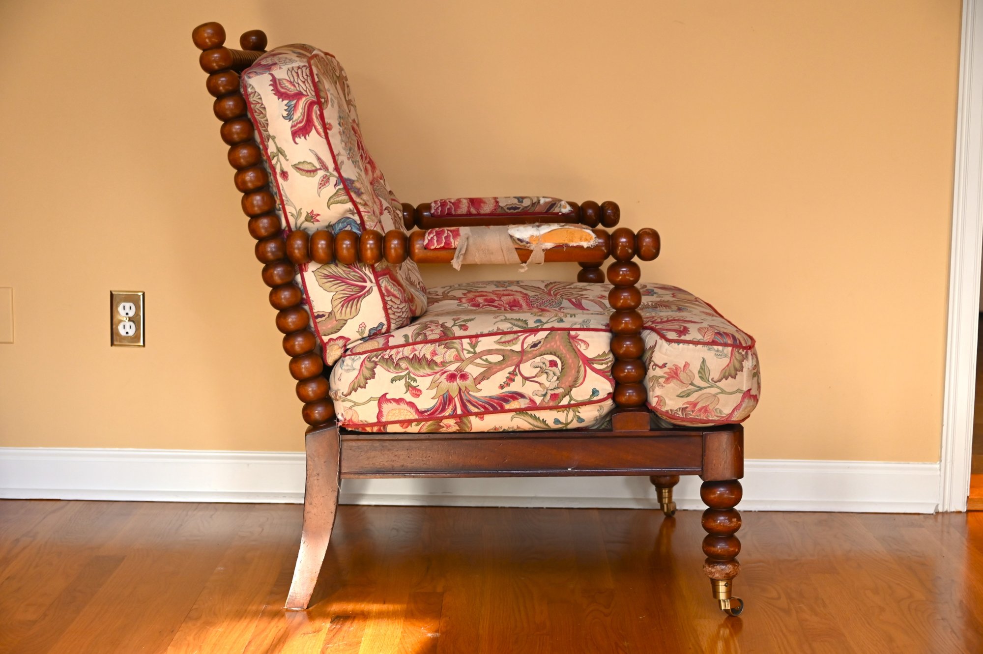 The chair is set on brass caster wheels, adding both functionality and a touch of antique charm. Despite visible wear on the arms, this piece retains its timeless appeal and would make a wonderful accent chair in a traditional or eclectic interior.