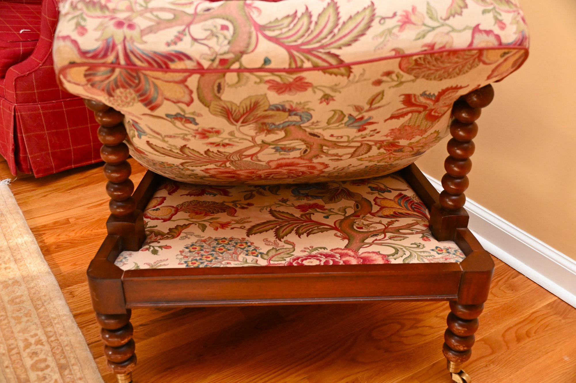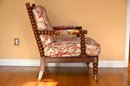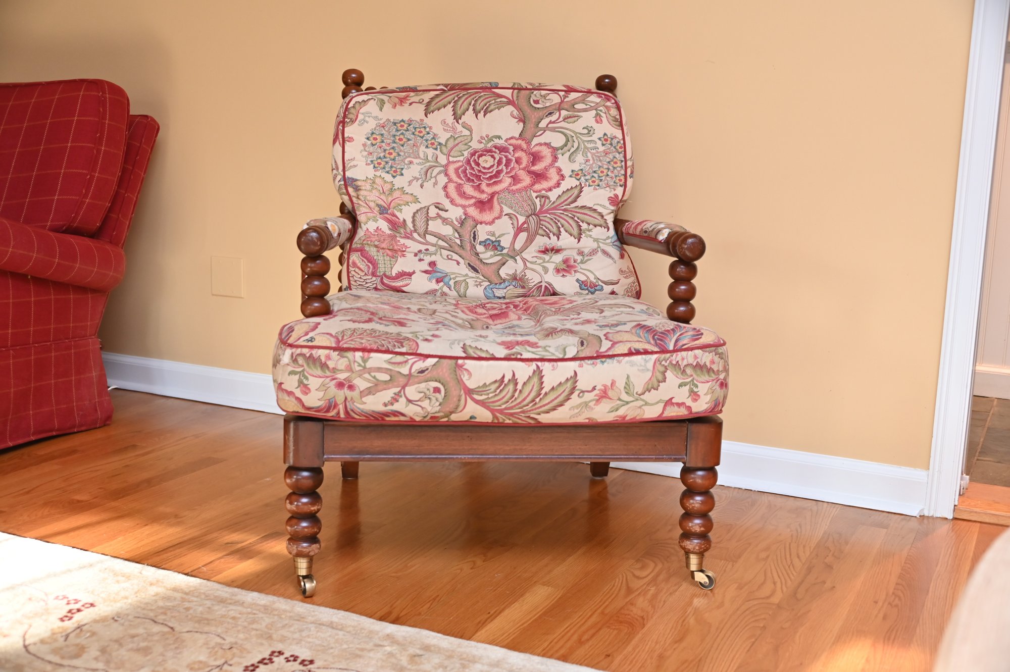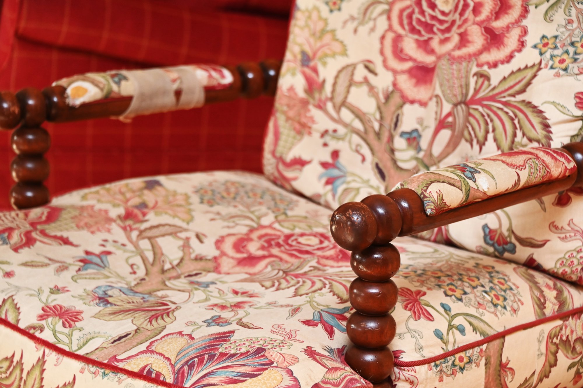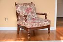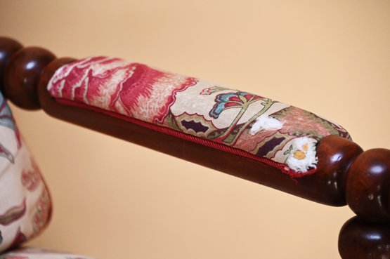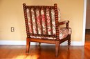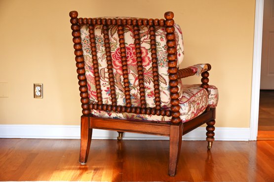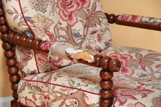 This vintage bobbin-style armchair features a beautifully crafted wooden frame with turned spindle detailing along the backrest, arms, and legs. The rich wood tone is complemented by an elegant floral upholstery, which showcases a classic chintz fabric with intricate patterns of blooming roses, foliage, and climbing vines in soft hues of pink, red, and green. The plush seat and back cushions provide comfort while maintaining a structured silhouette.