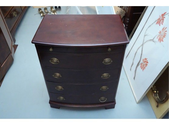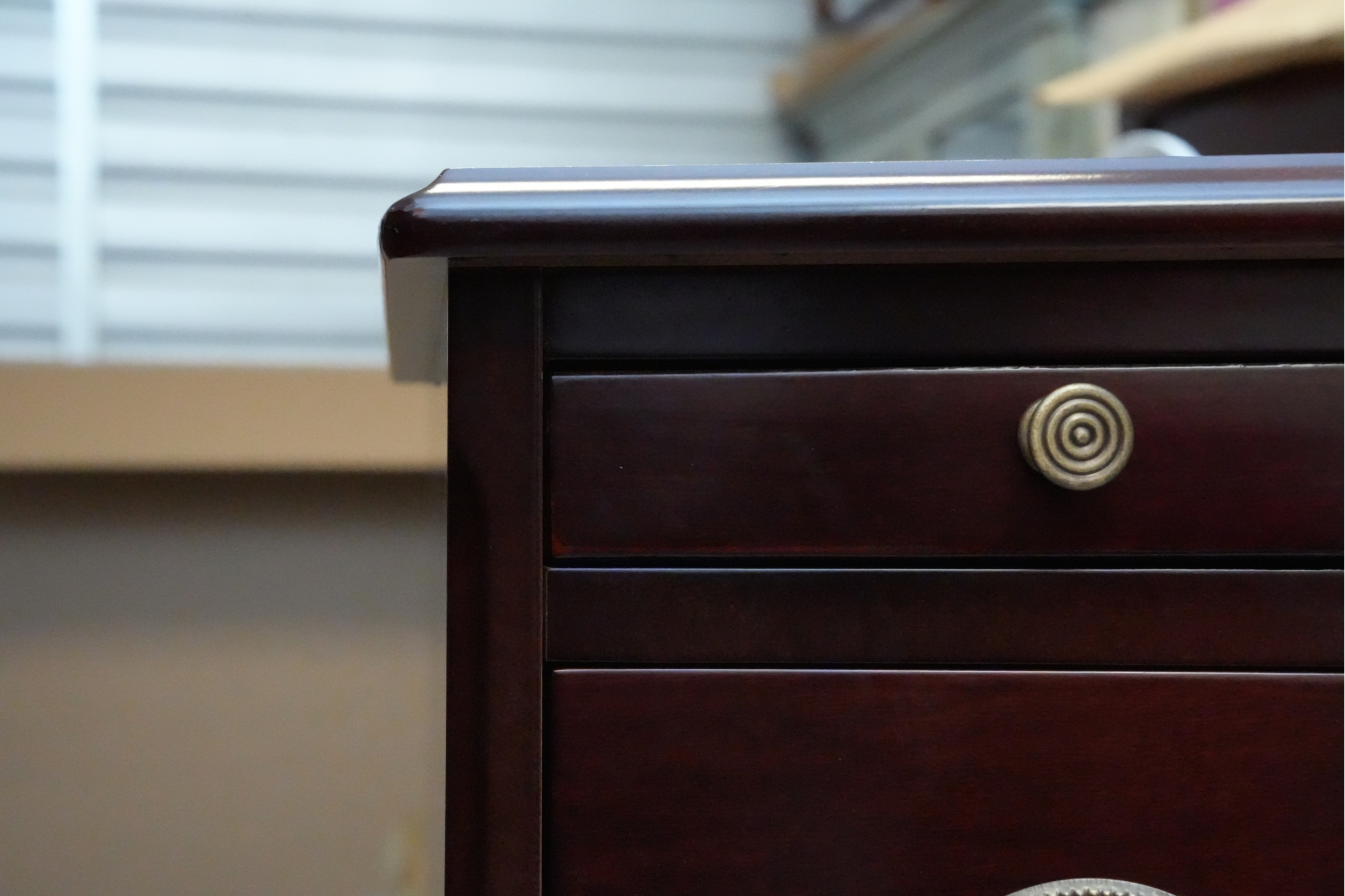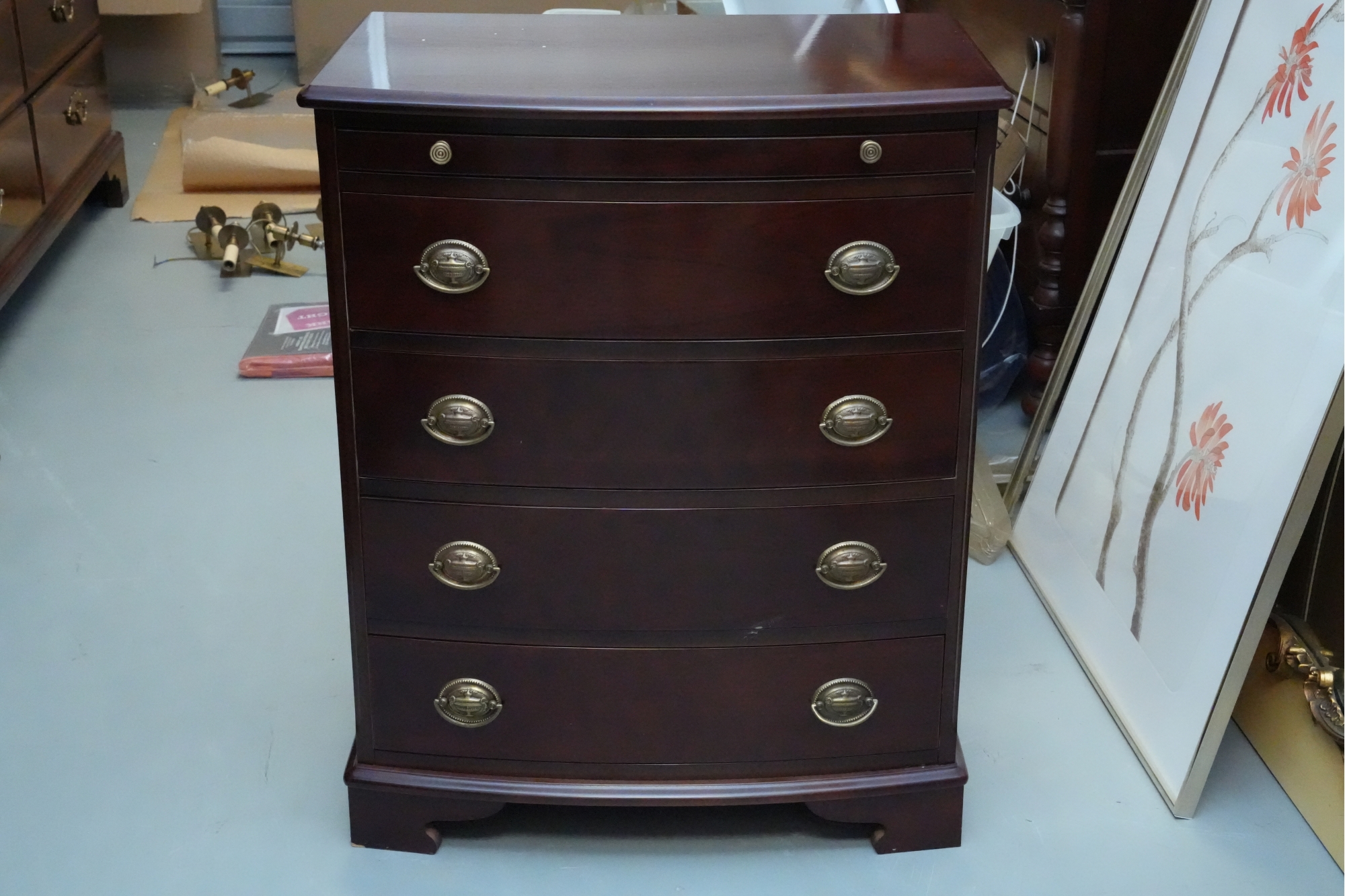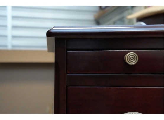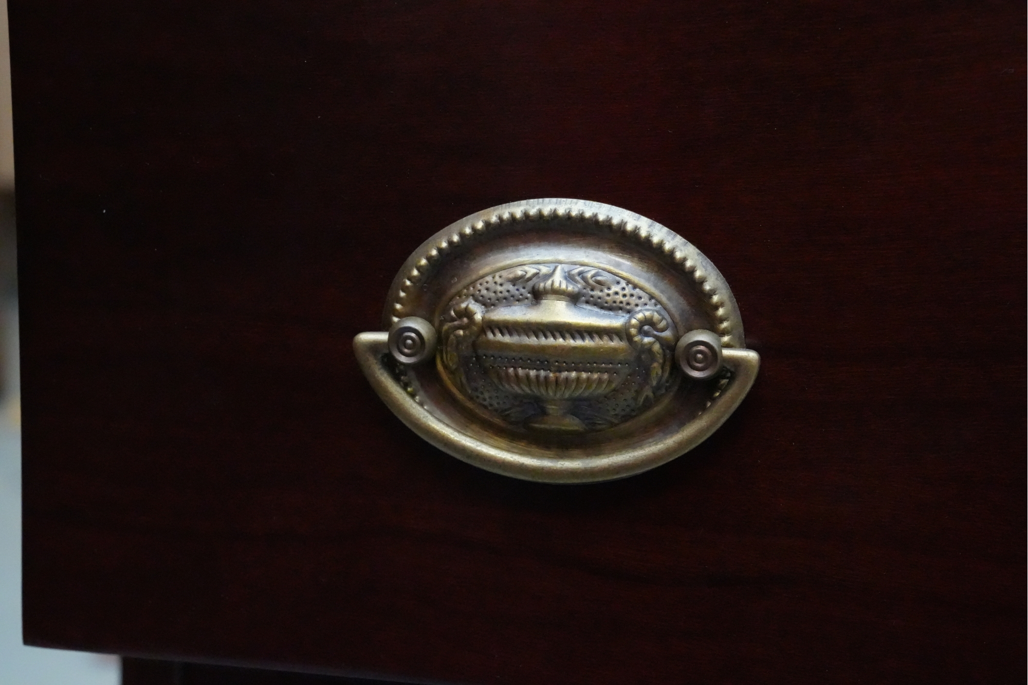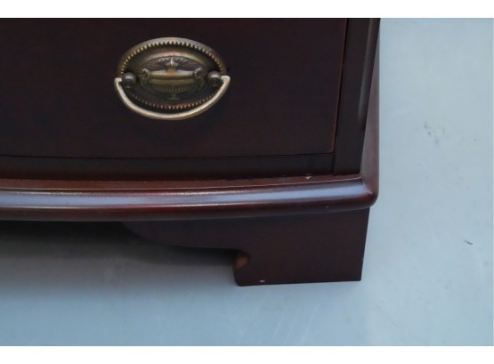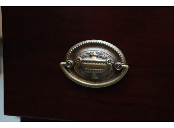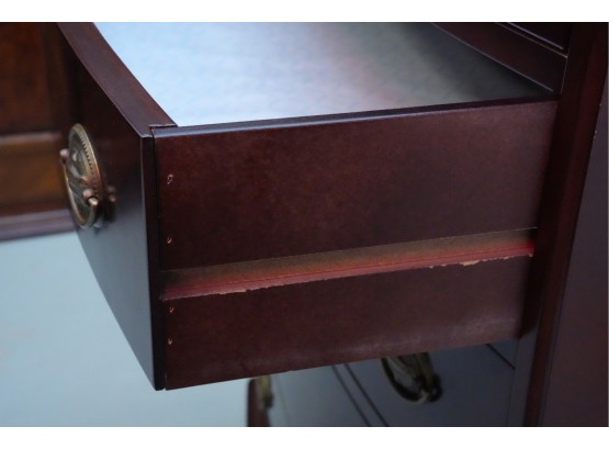 Bombay Company (U.S.A.) dark mahogany chest of drawers featuring four drawers, a pull-out surface directly above the drawers, and ornate oval antique brass drawer pulls.