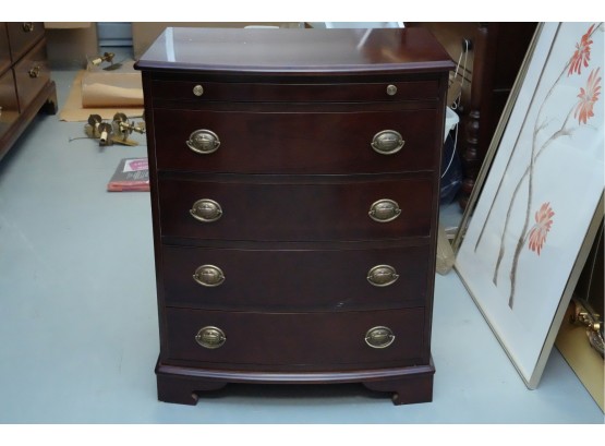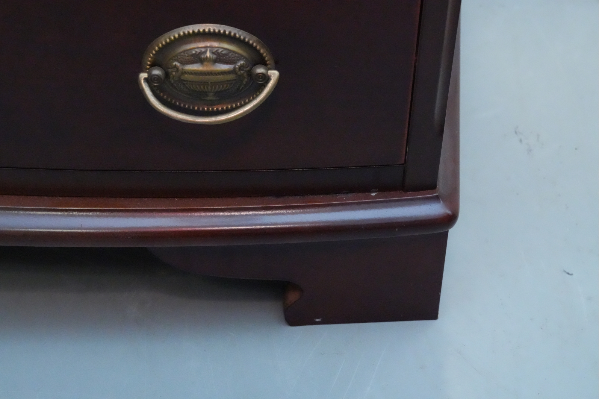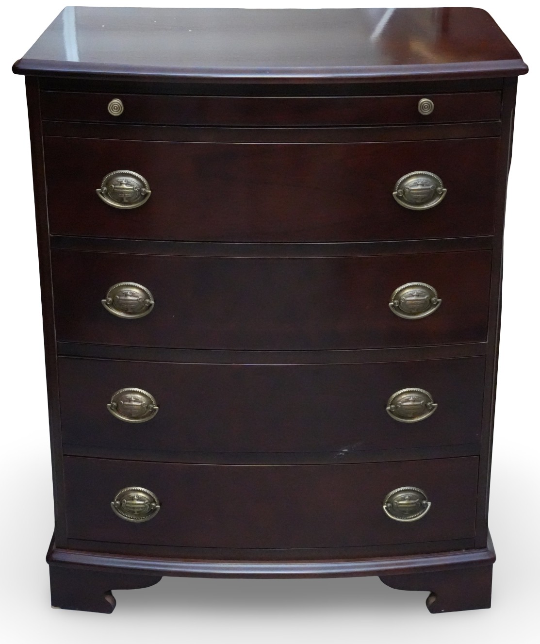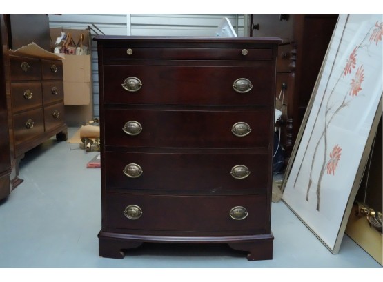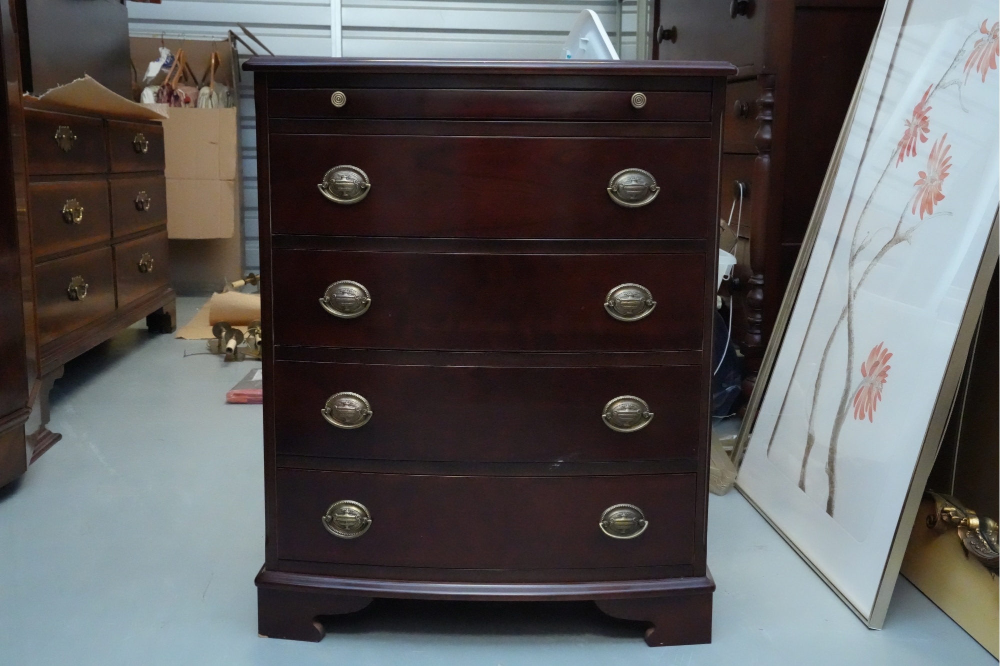 Bombay Company (U.S.A.) dark mahogany chest of drawers featuring four drawers, a pull-out surface directly above the drawers, and ornate oval antique brass drawer pulls.