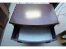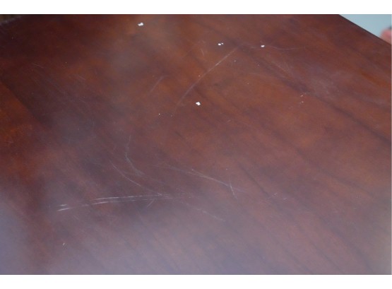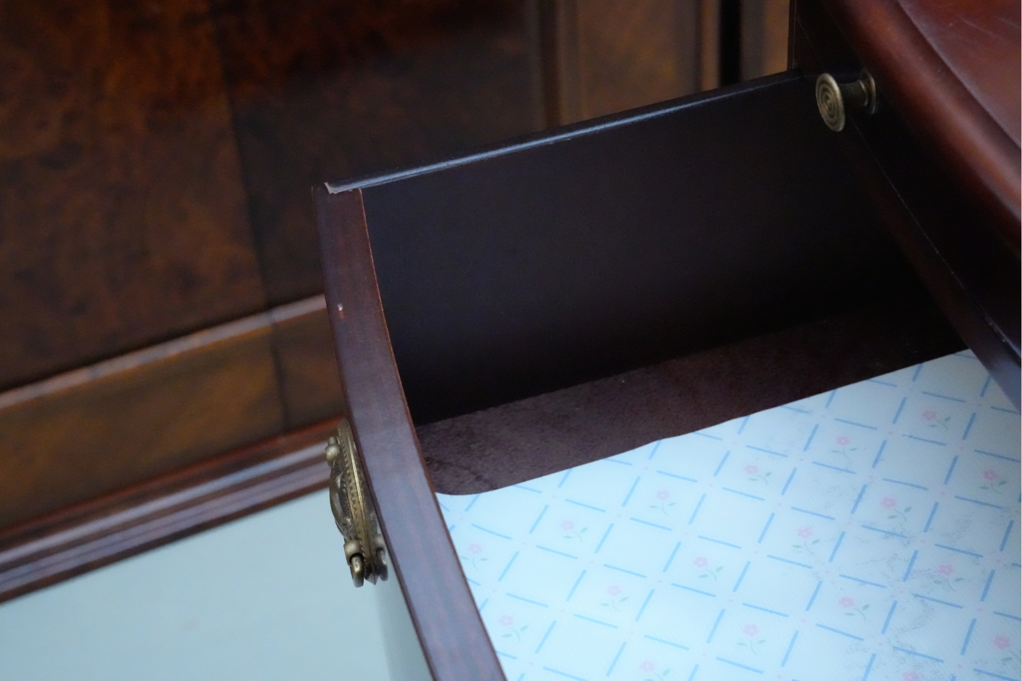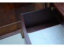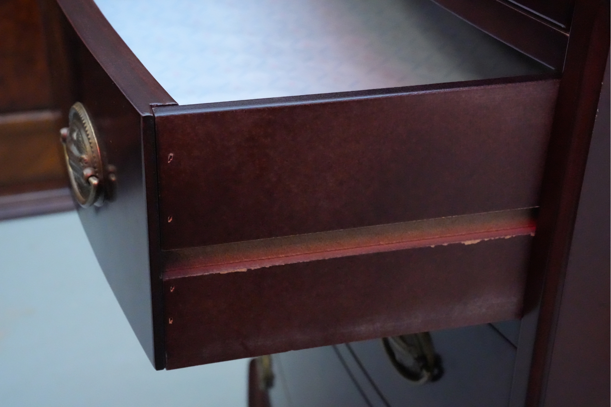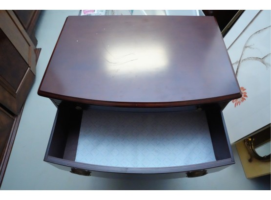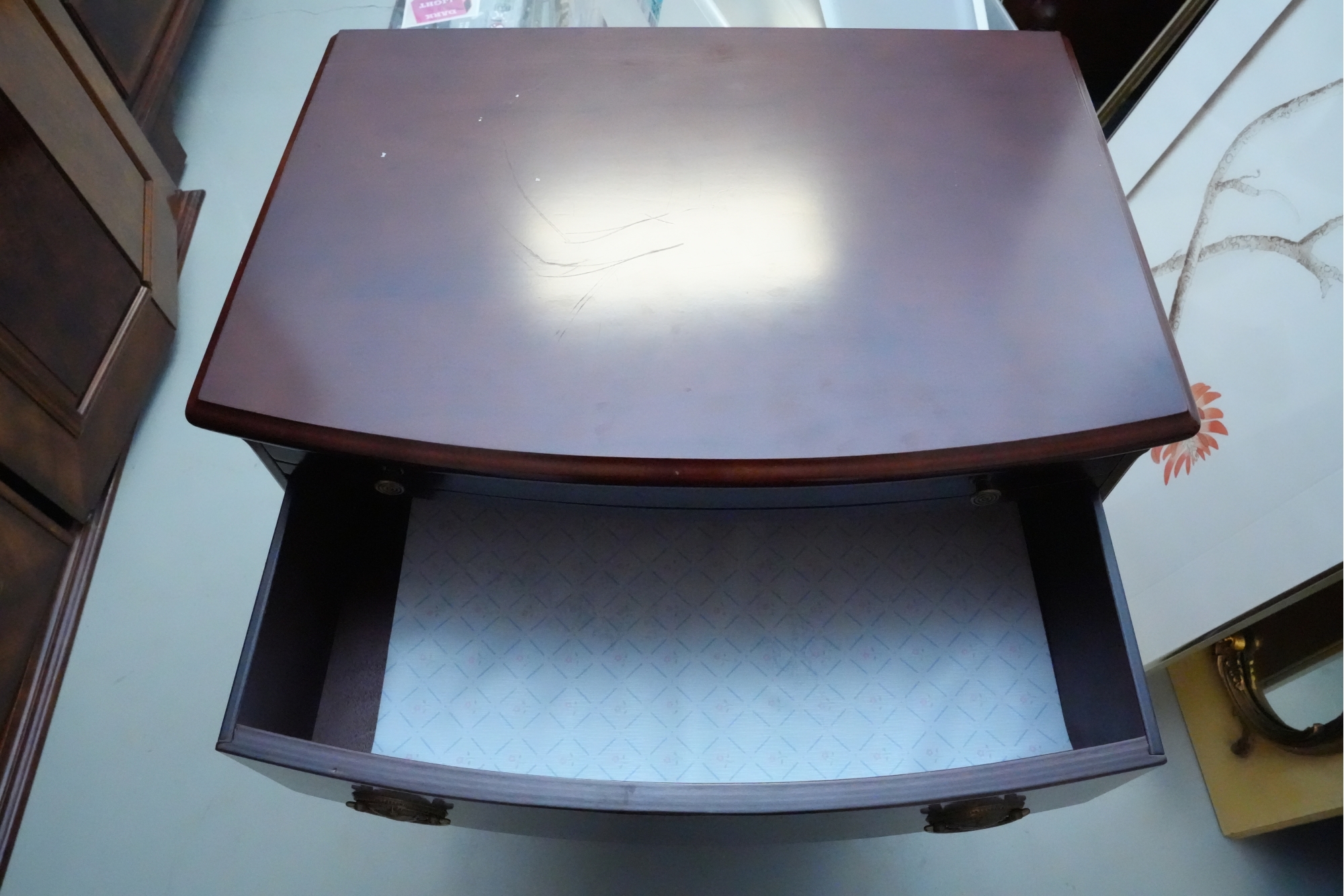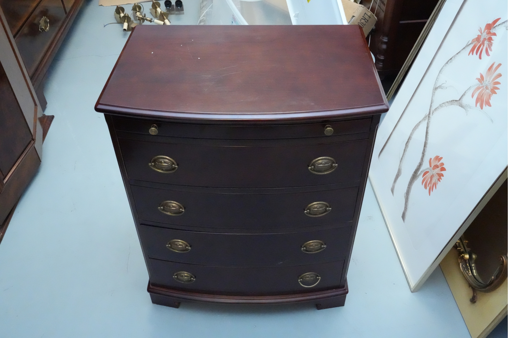 Bombay Company (U.S.A.) dark mahogany chest of drawers featuring four drawers, a pull-out surface directly above the drawers, and ornate oval antique brass drawer pulls.