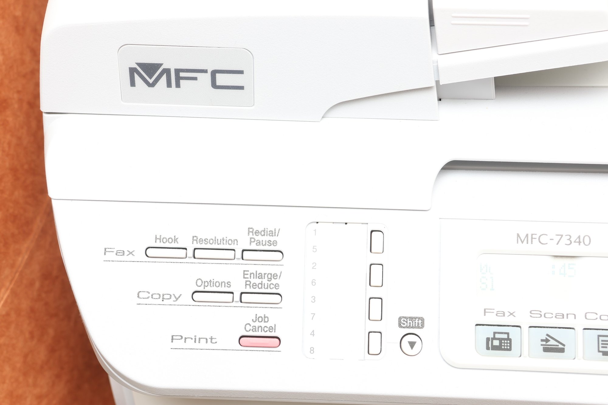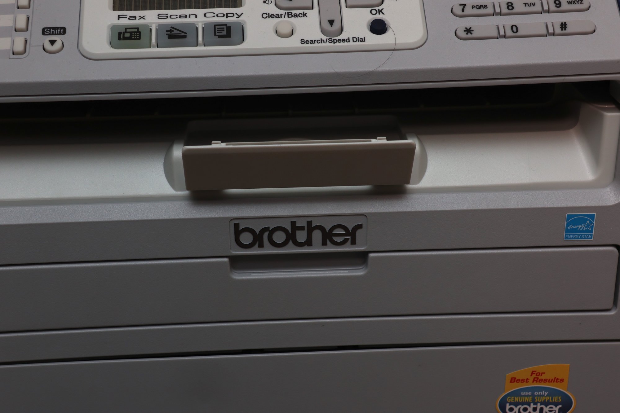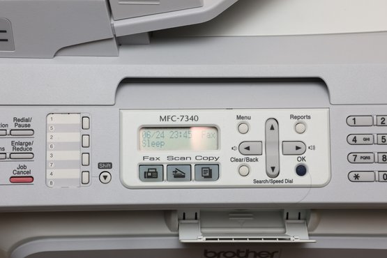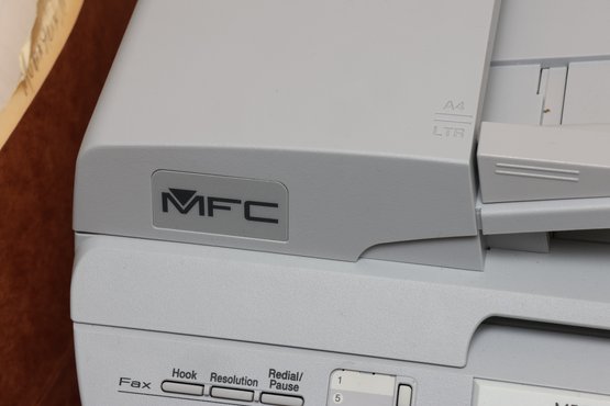 This is a Brother MFC-7340 multifunction laser printer, constructed primarily from light gray and white plastic. It features a flatbed scanner with an automatic document feeder (ADF) on top, a control panel with an LCD screen and numerical keypad, and a paper input tray at the base. The unit includes an Energy Star certification sticker on the front.
