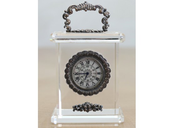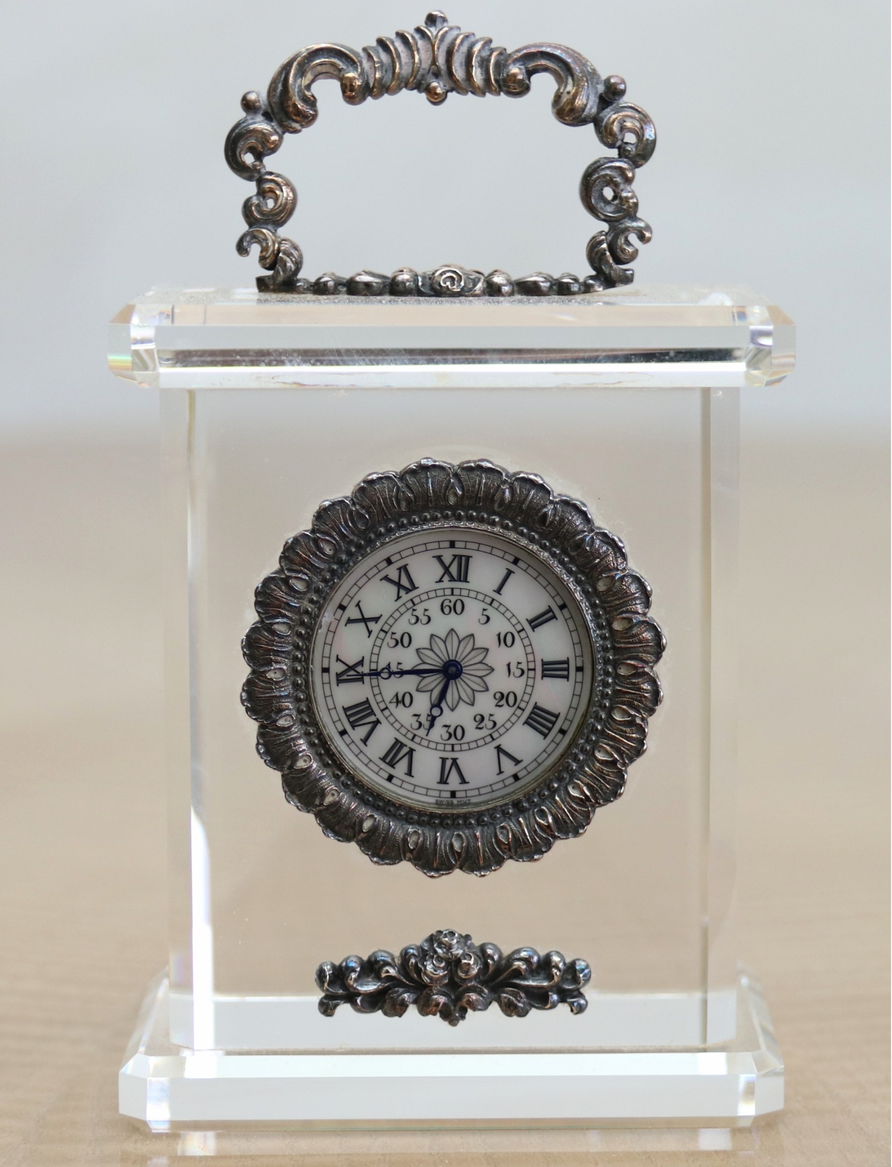 The carved crystal case of rectangular form with canted angles, the circular mother-of-pearl dial, Roman numeral hour markers and Arabic numerical second markers, to the fringed silver bezel with carved detail, with a hinged handle of scroll design. Signed Buccellati.