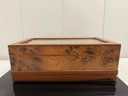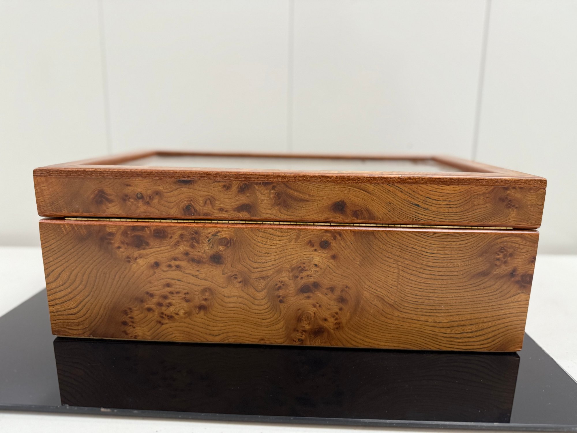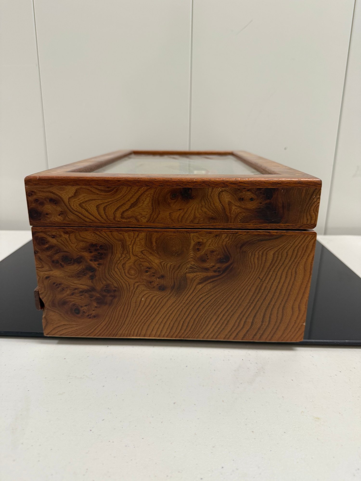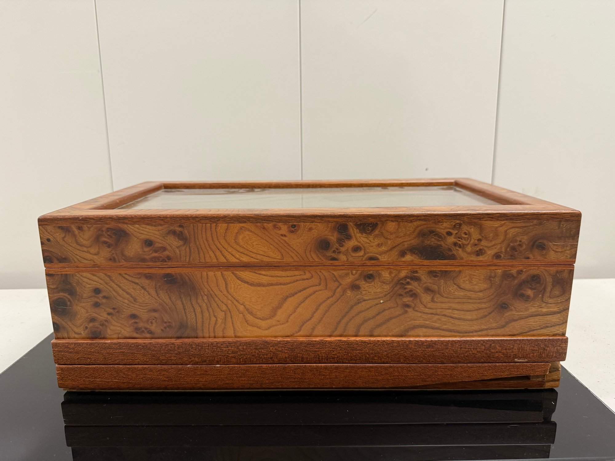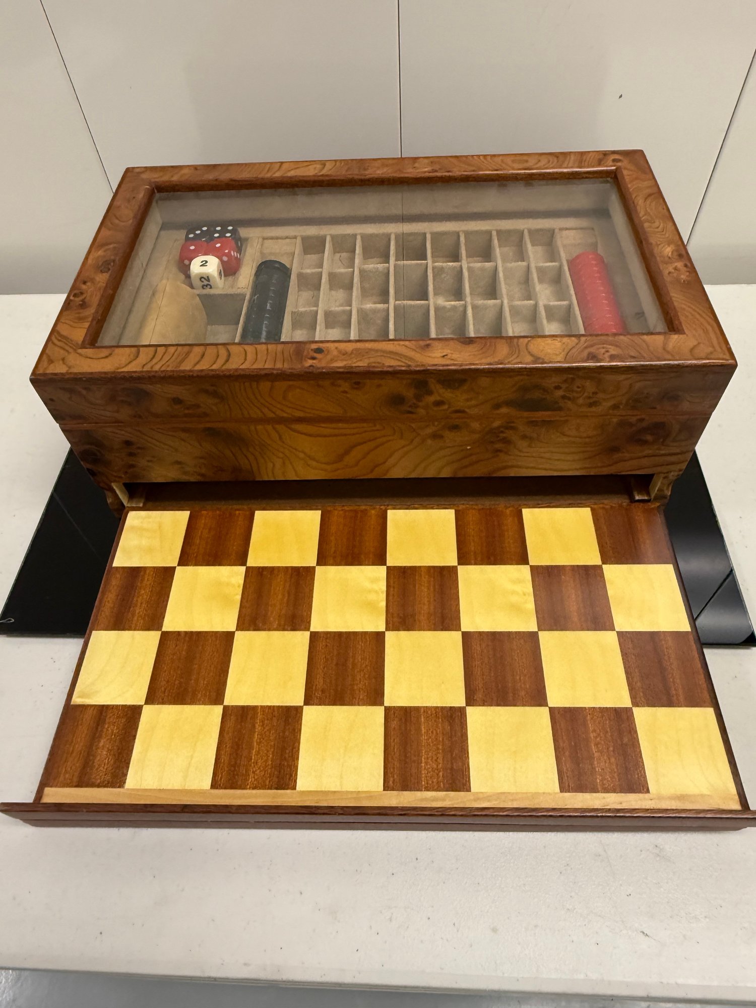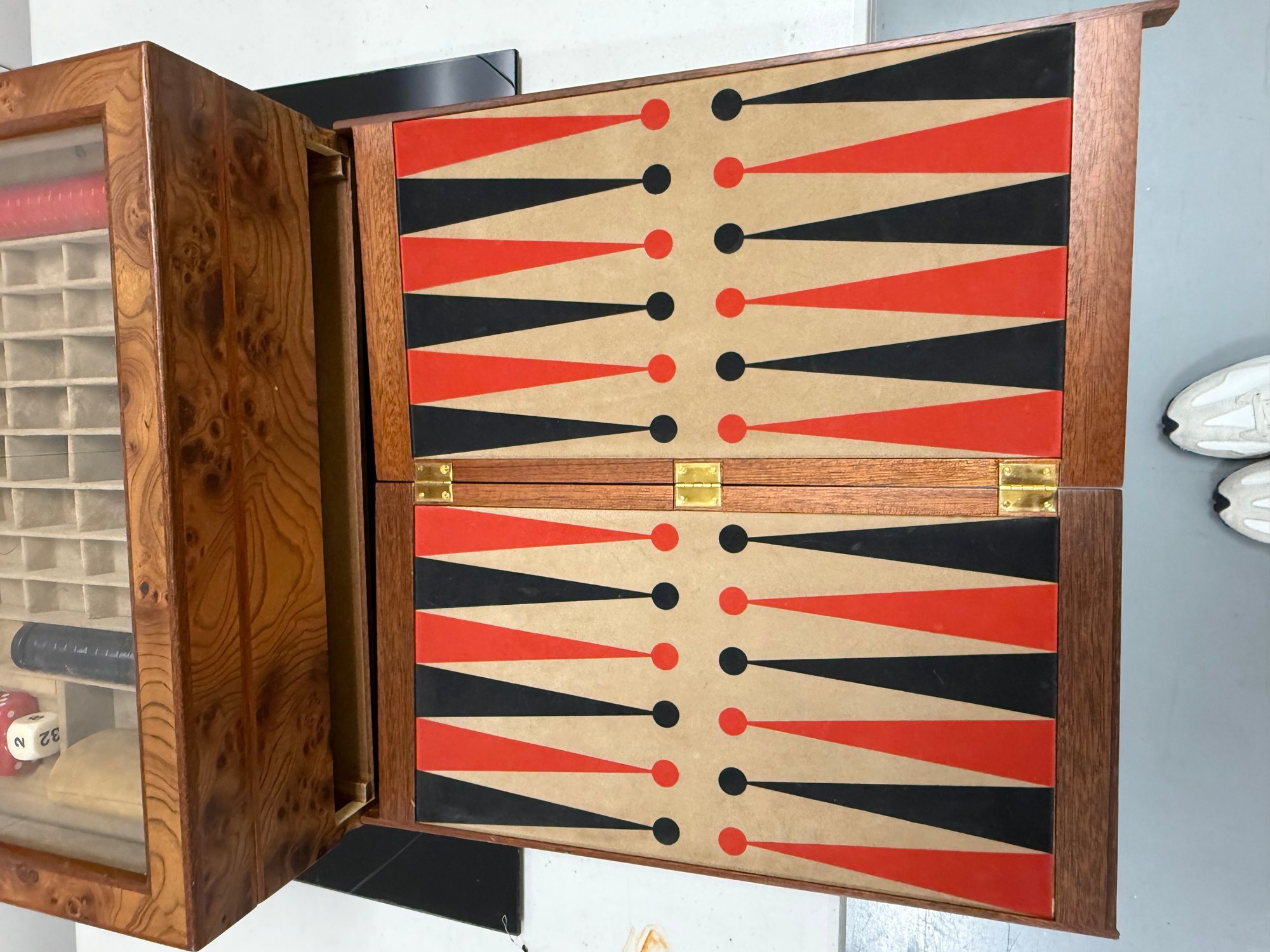 Vintage 1970s burled maple multi-game chest featuring a glass display top, inlaid playing surfaces, and a slide-out chessboard drawer. The interior houses a backgammon board in red, black, and tan tones along with storage compartments for dice, cups, and game pieces. Not all original playing pieces are included. This lot is sold as is.