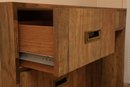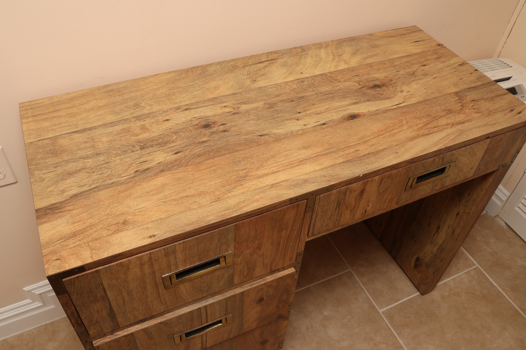 This campaign-style wooden desk, approximately 30 inches high, features a left pedestal with three drawers and a single shallow drawer on the right. It is crafted from a light-toned wood with visible grain, accented by brass corner protectors and flush campaign pull handles. The desk provides functional storage with a distinct rustic and refined aesthetic.