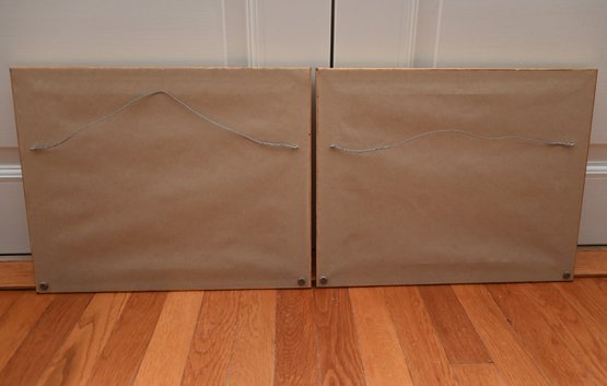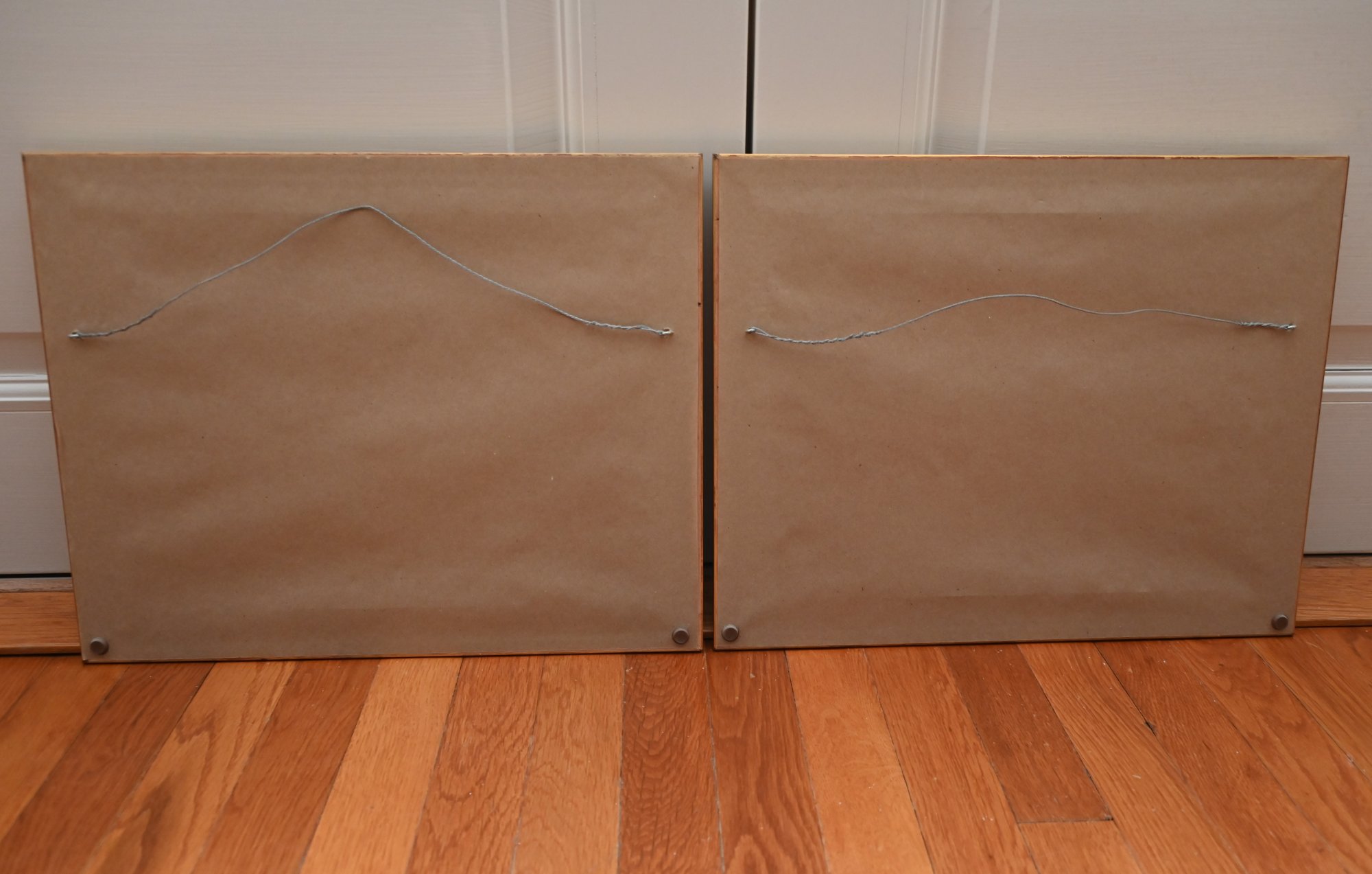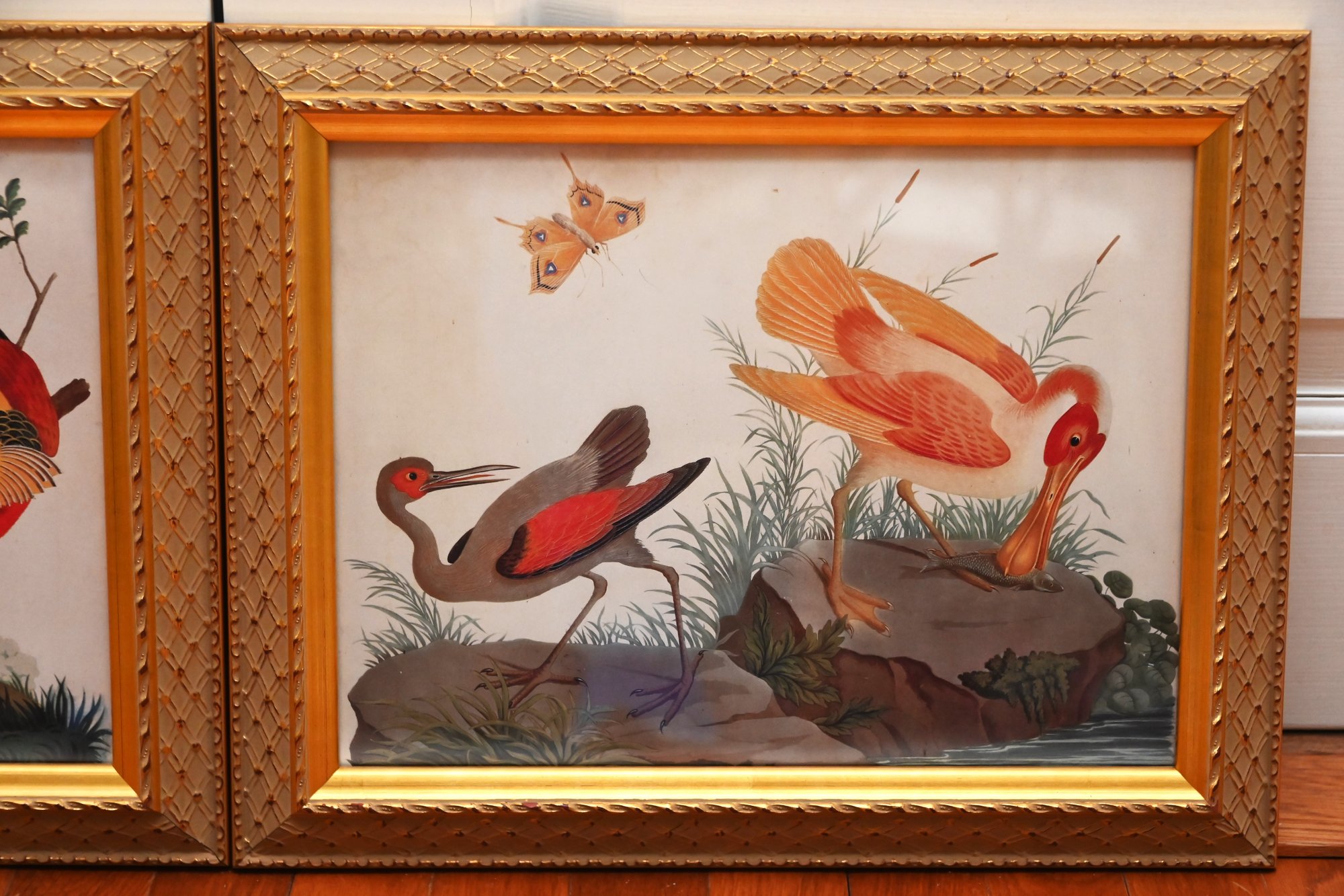 The right painting features two water birds, possibly ibises or egrets, standing on a rock near water, with a butterfly hovering above.
