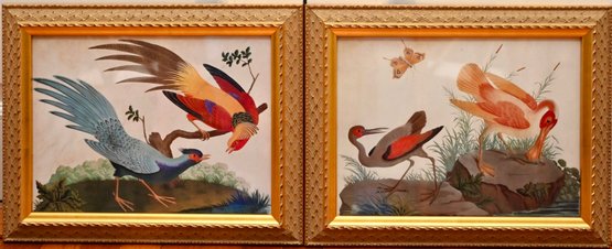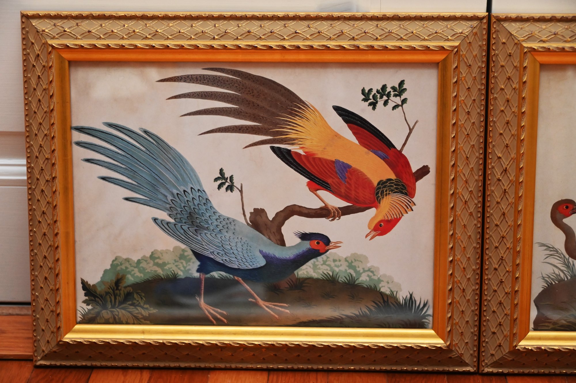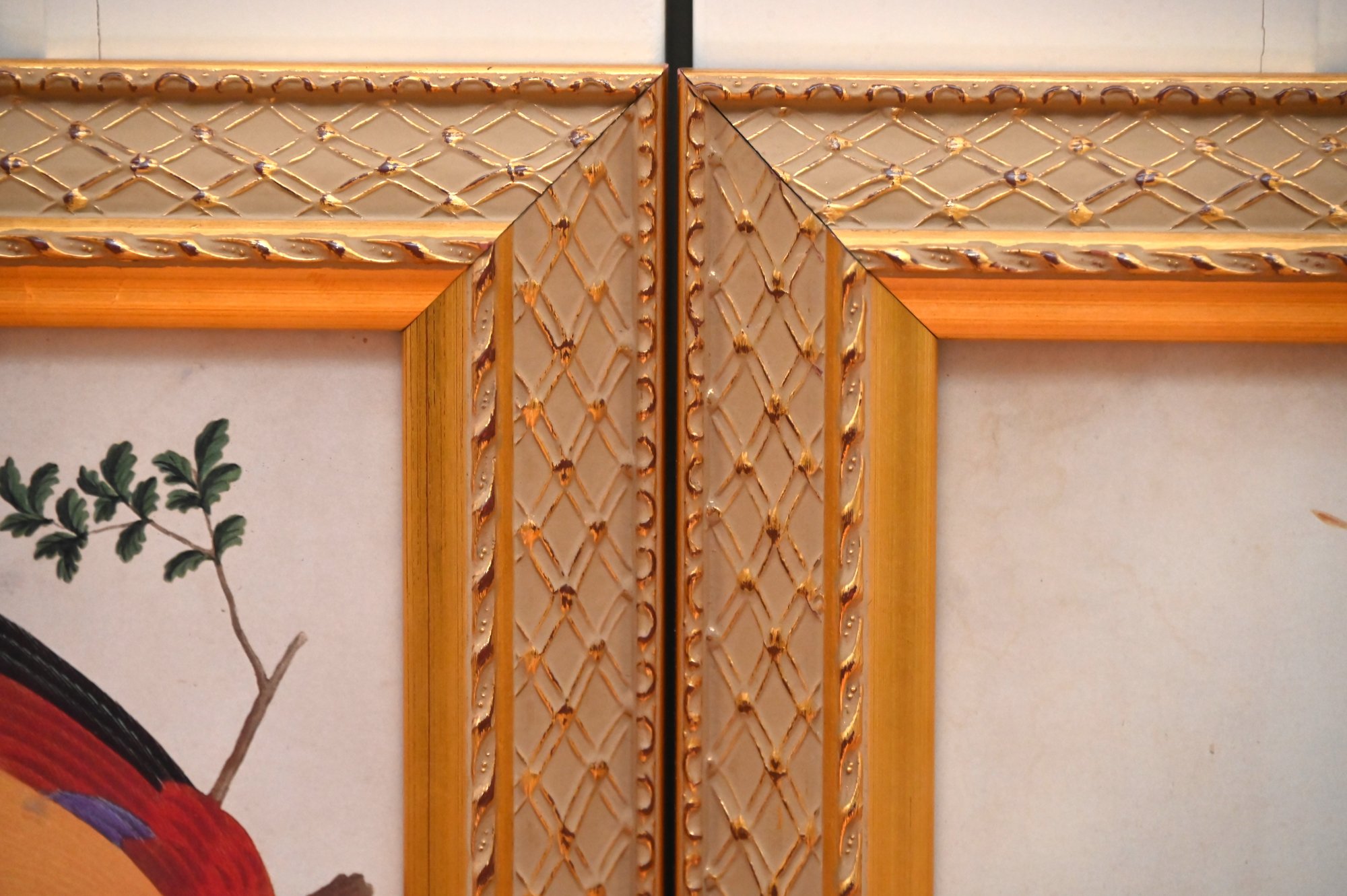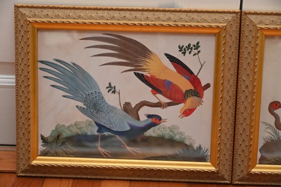 The left painting depicts a pair of pheasants or exotic fowl, one perched on a branch with striking multicolored plumage, while the other stands on the ground with blue-gray tail feathers.