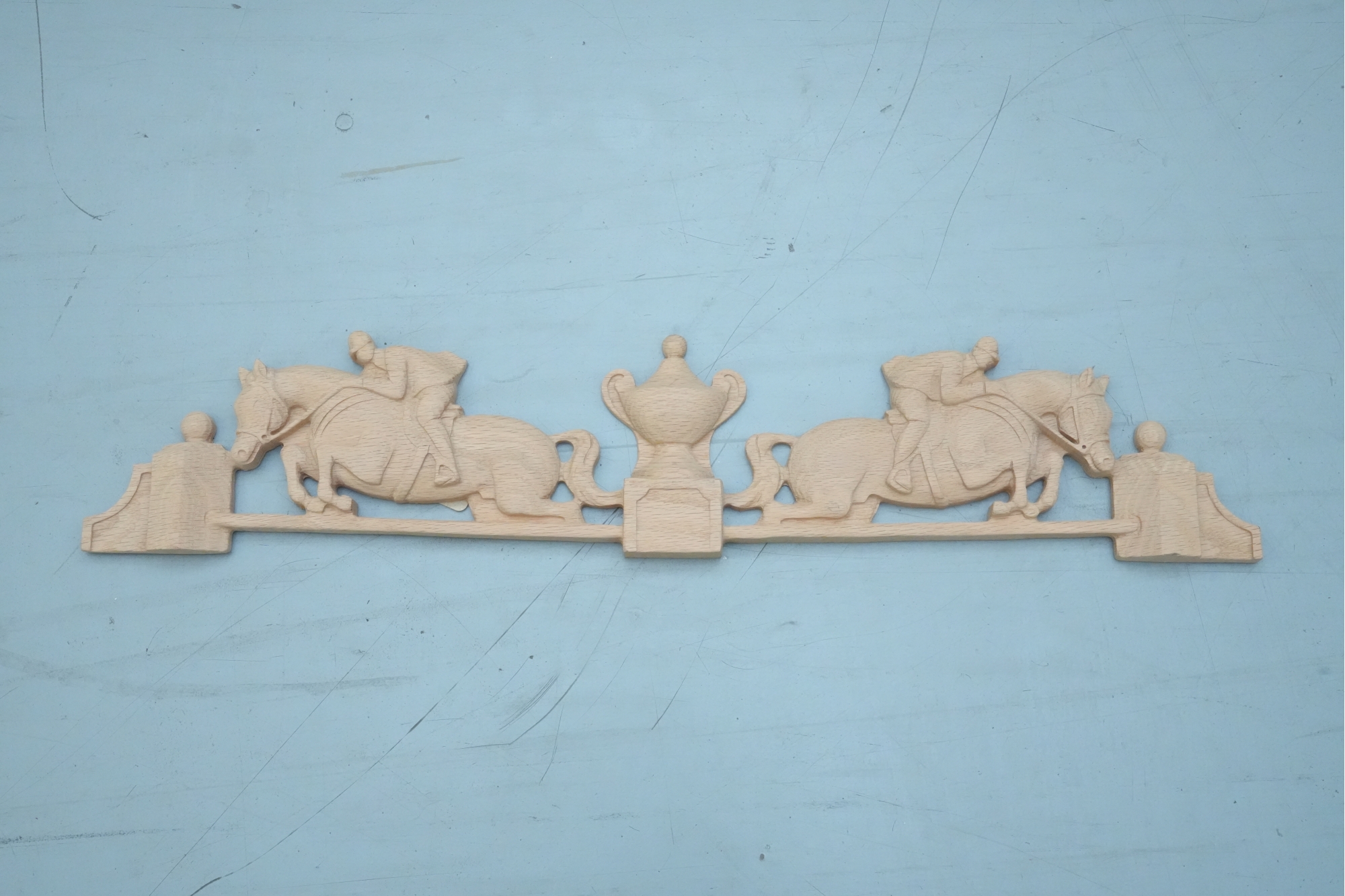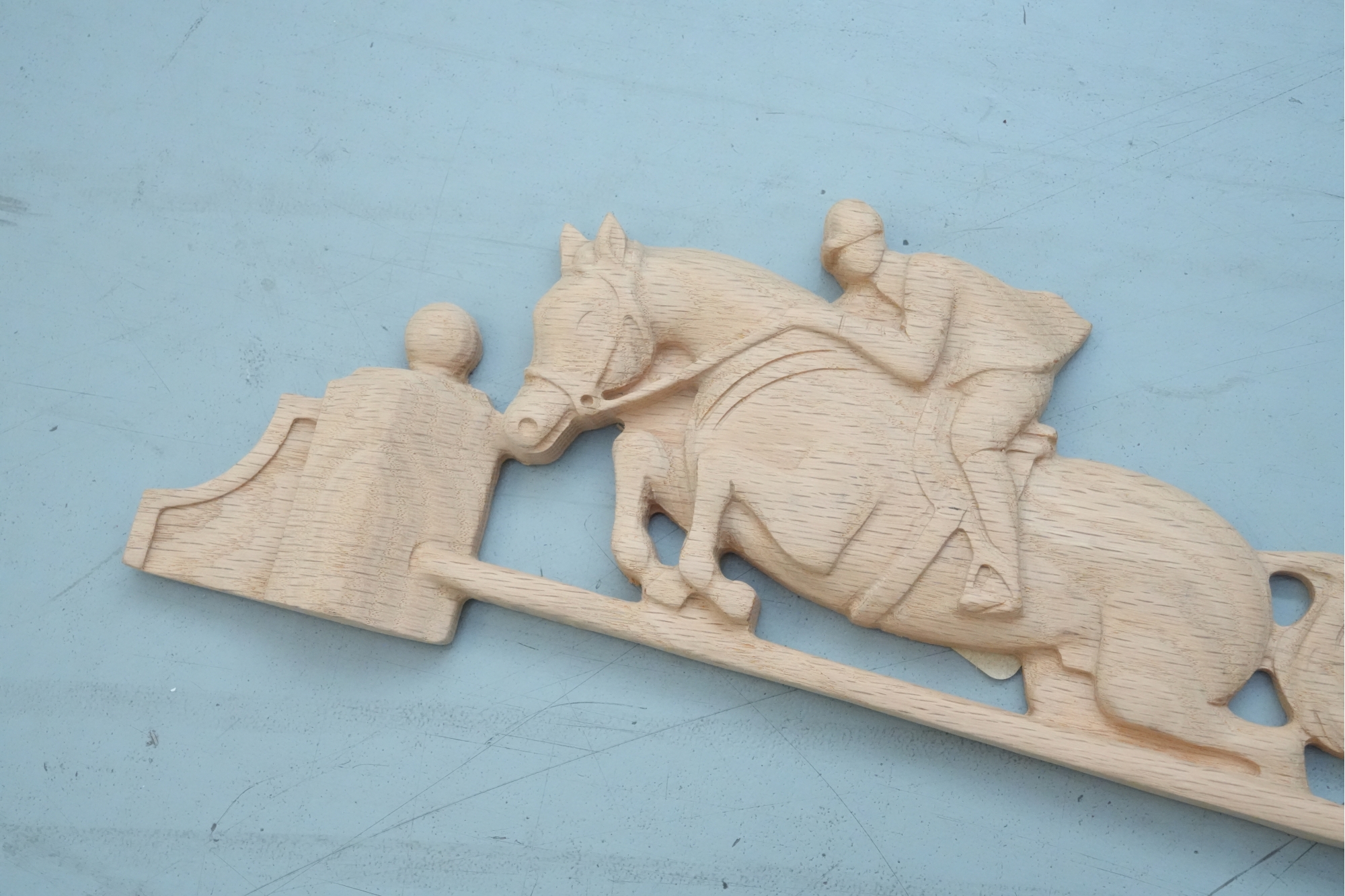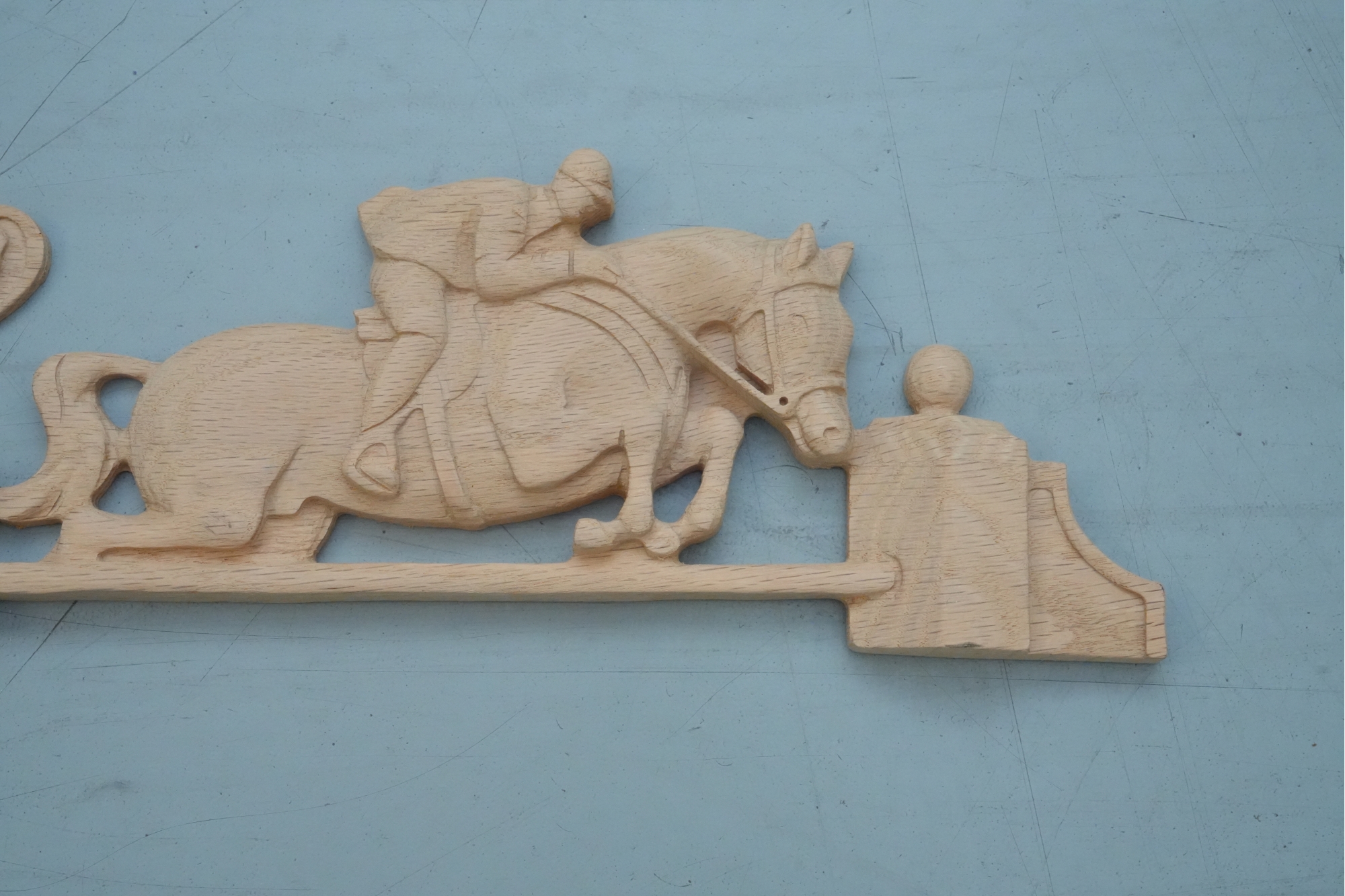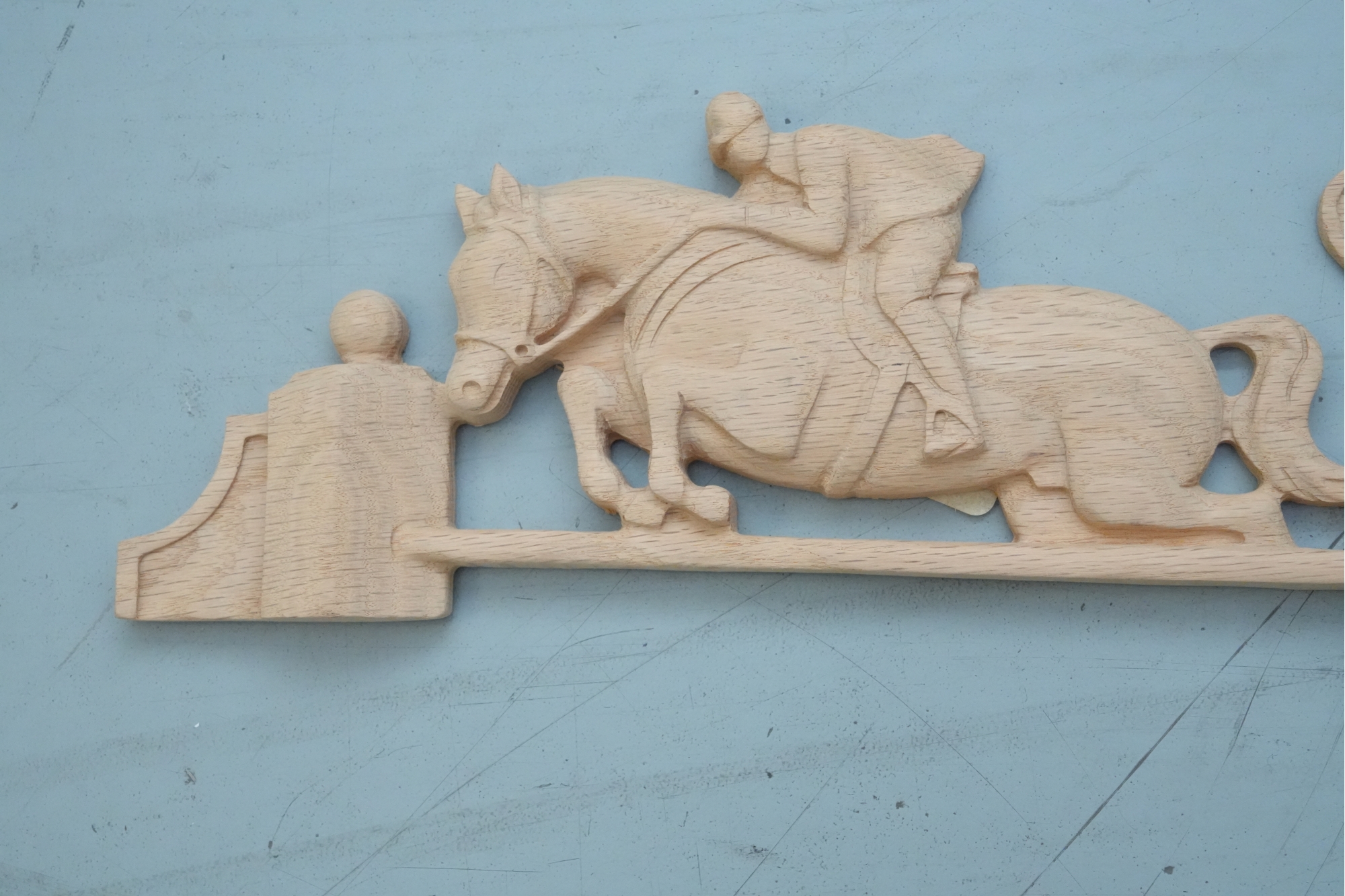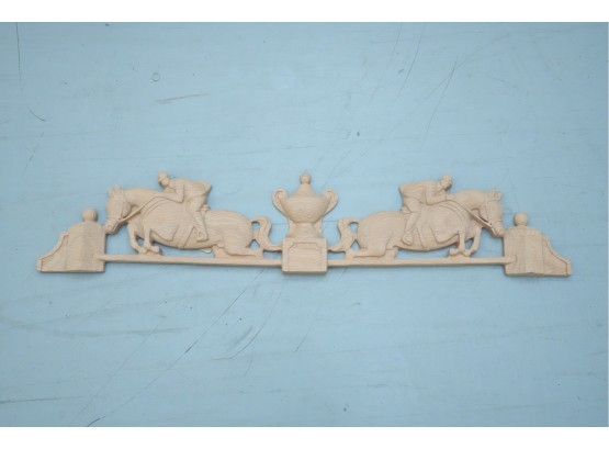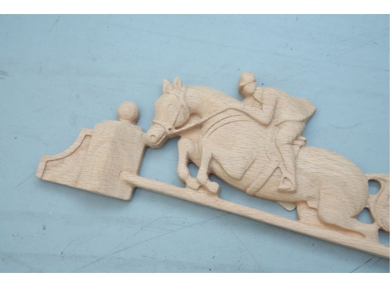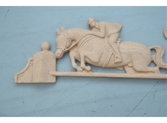 Carved hardwood wall applique featuring a horse jumping motif, for decorative use.