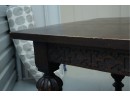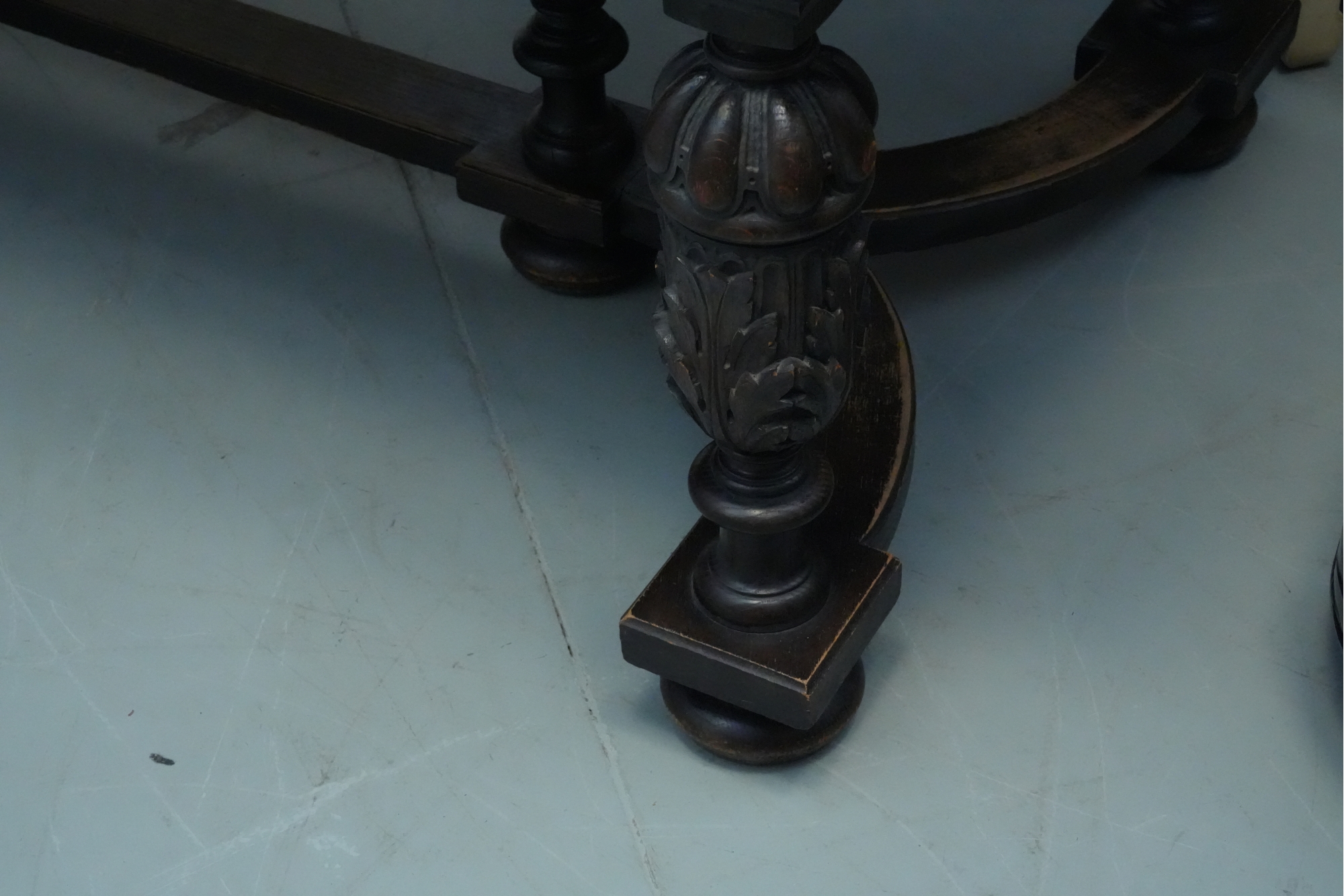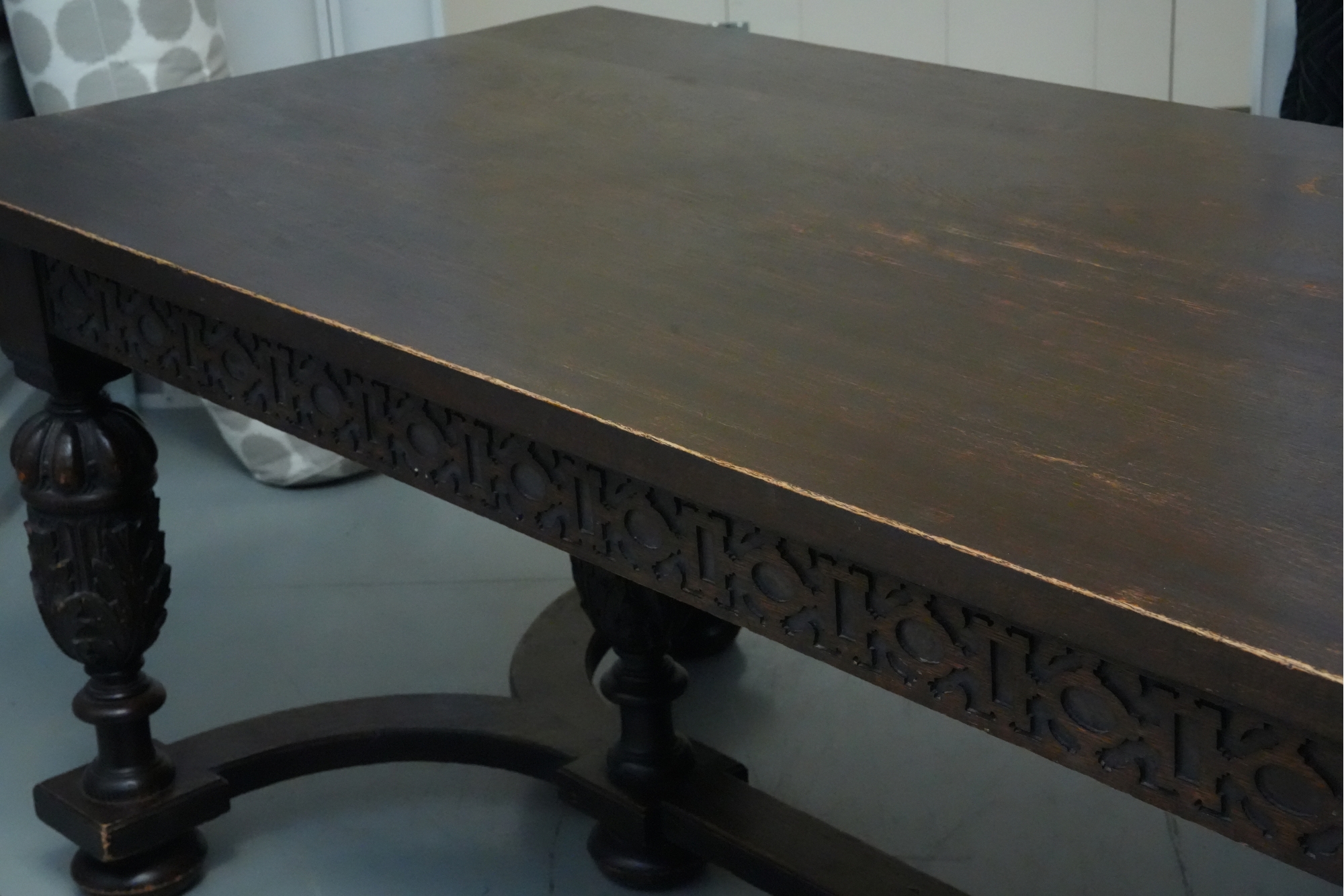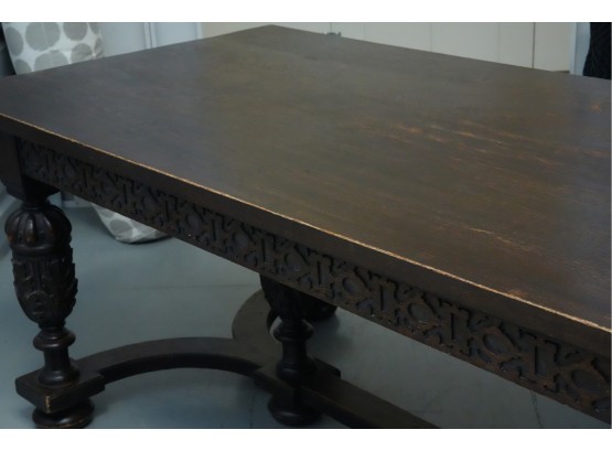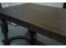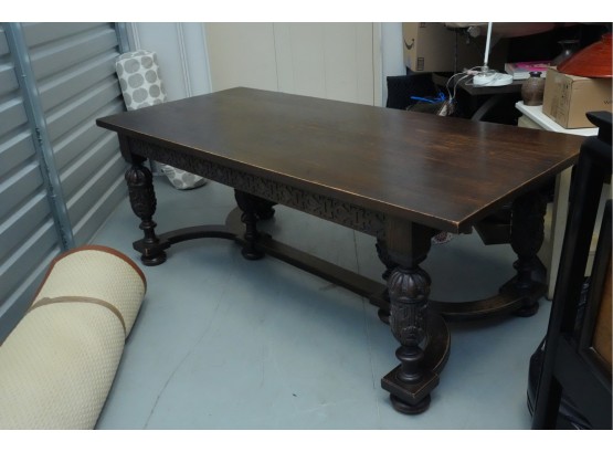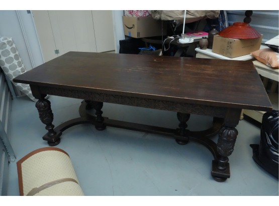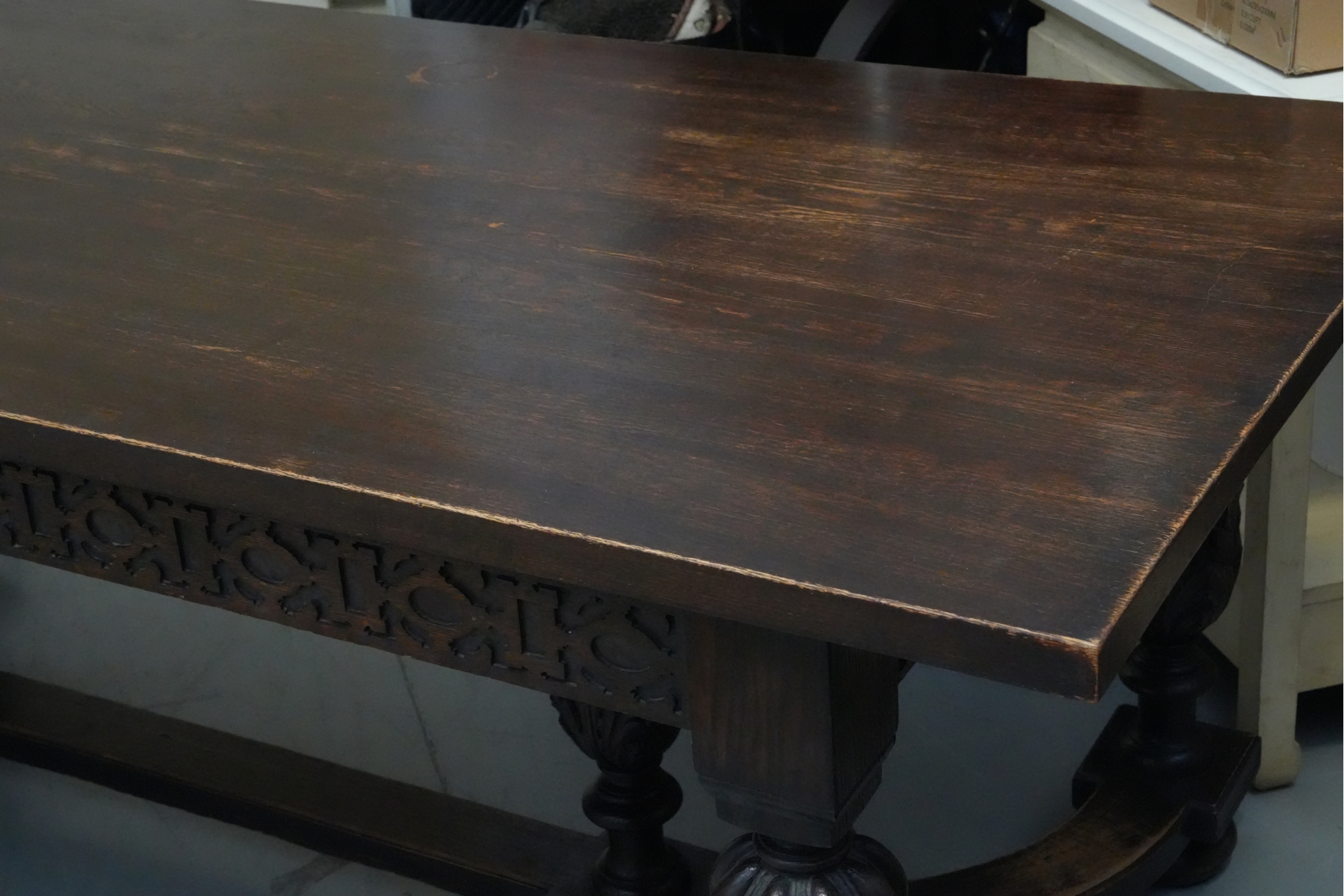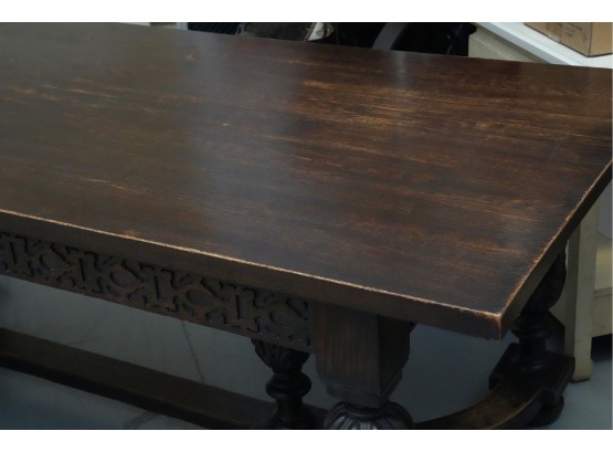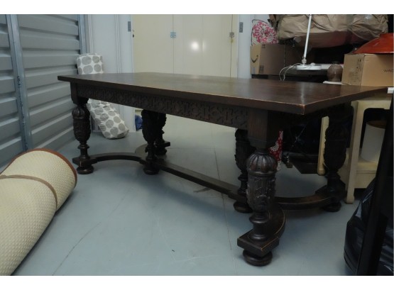 Antique-style carved oak refectory table in a dark finish with leaf-carved bulbous legs, curved stretchers, and a decorative carved apron.