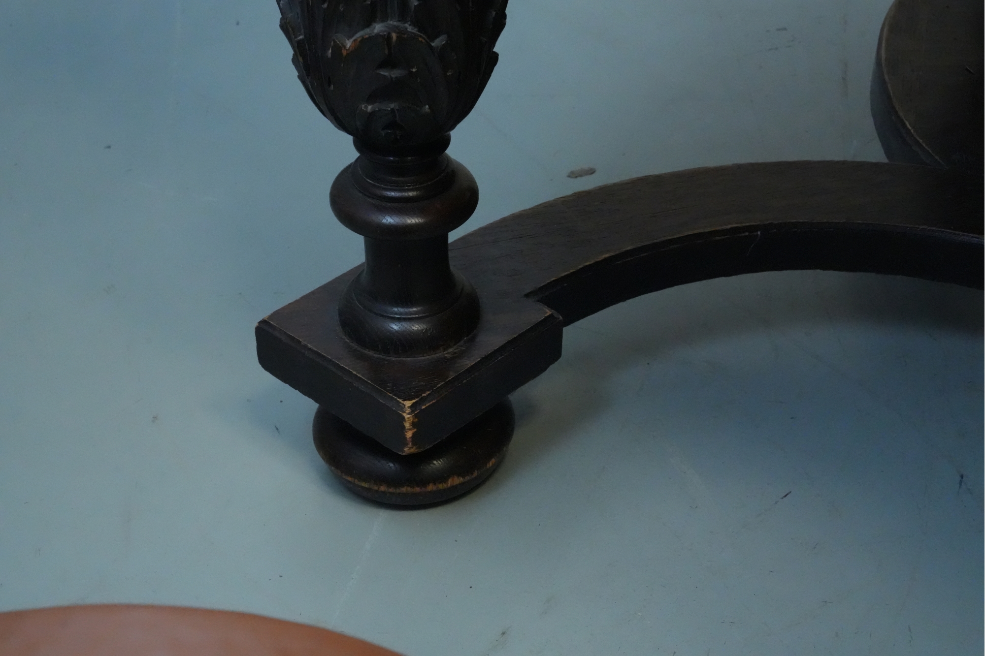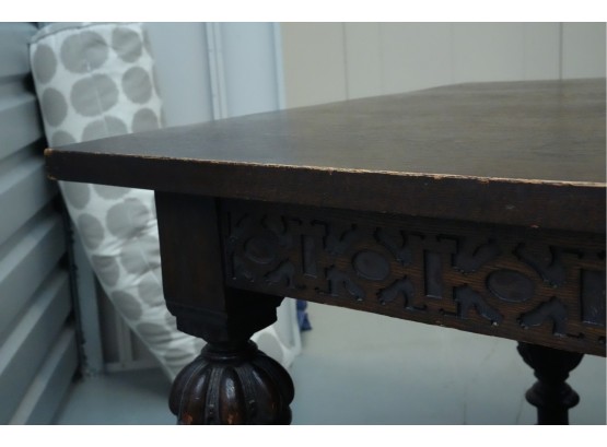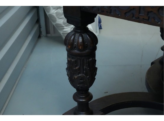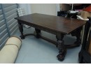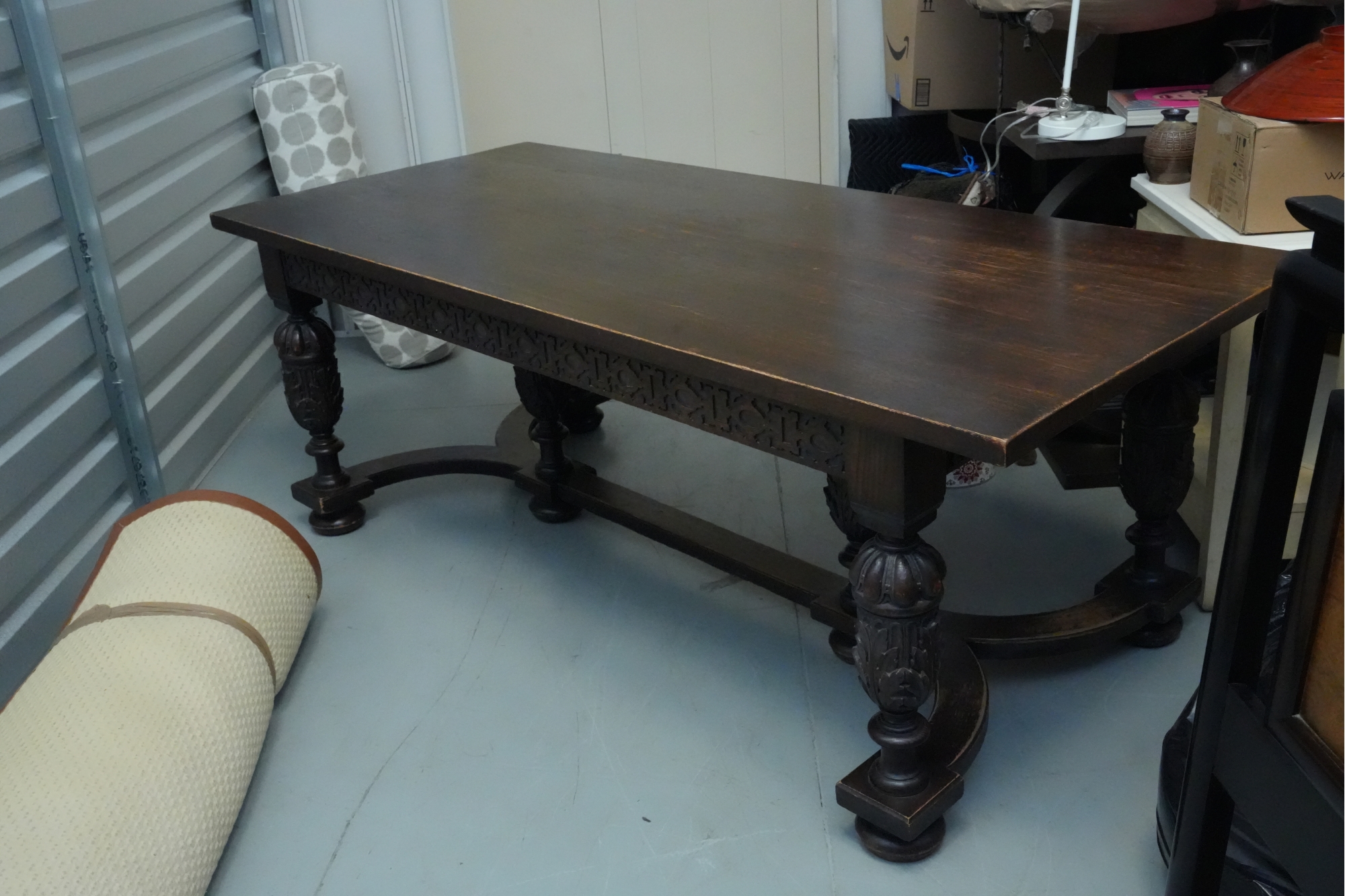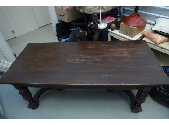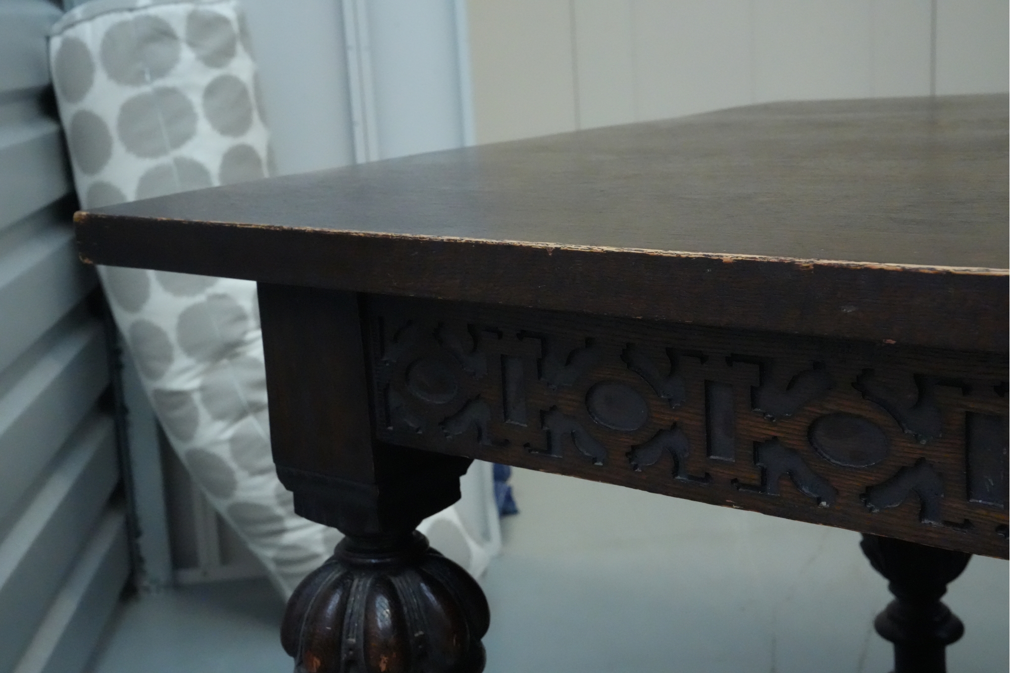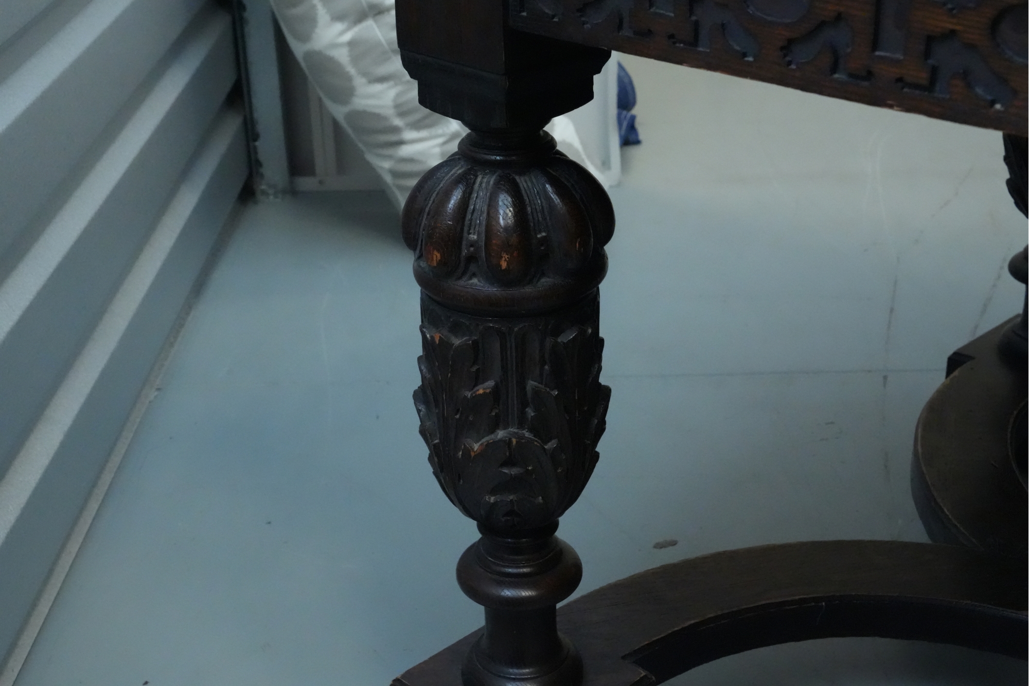 Antique-style carved oak refectory table in a dark finish with leaf-carved bulbous legs, curved stretchers, and a decorative carved apron.