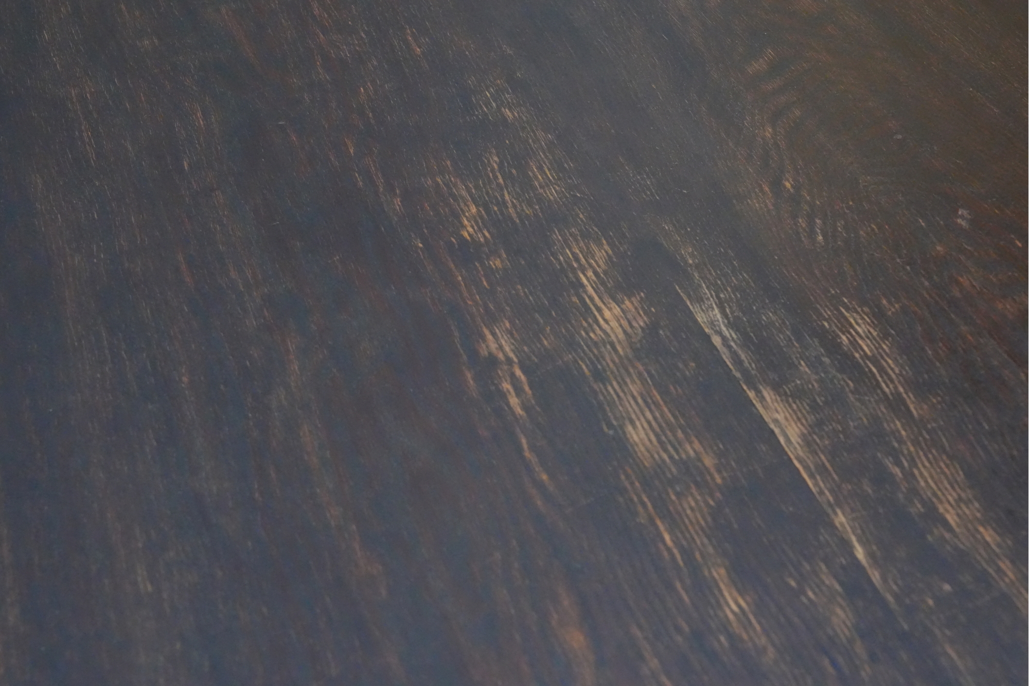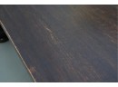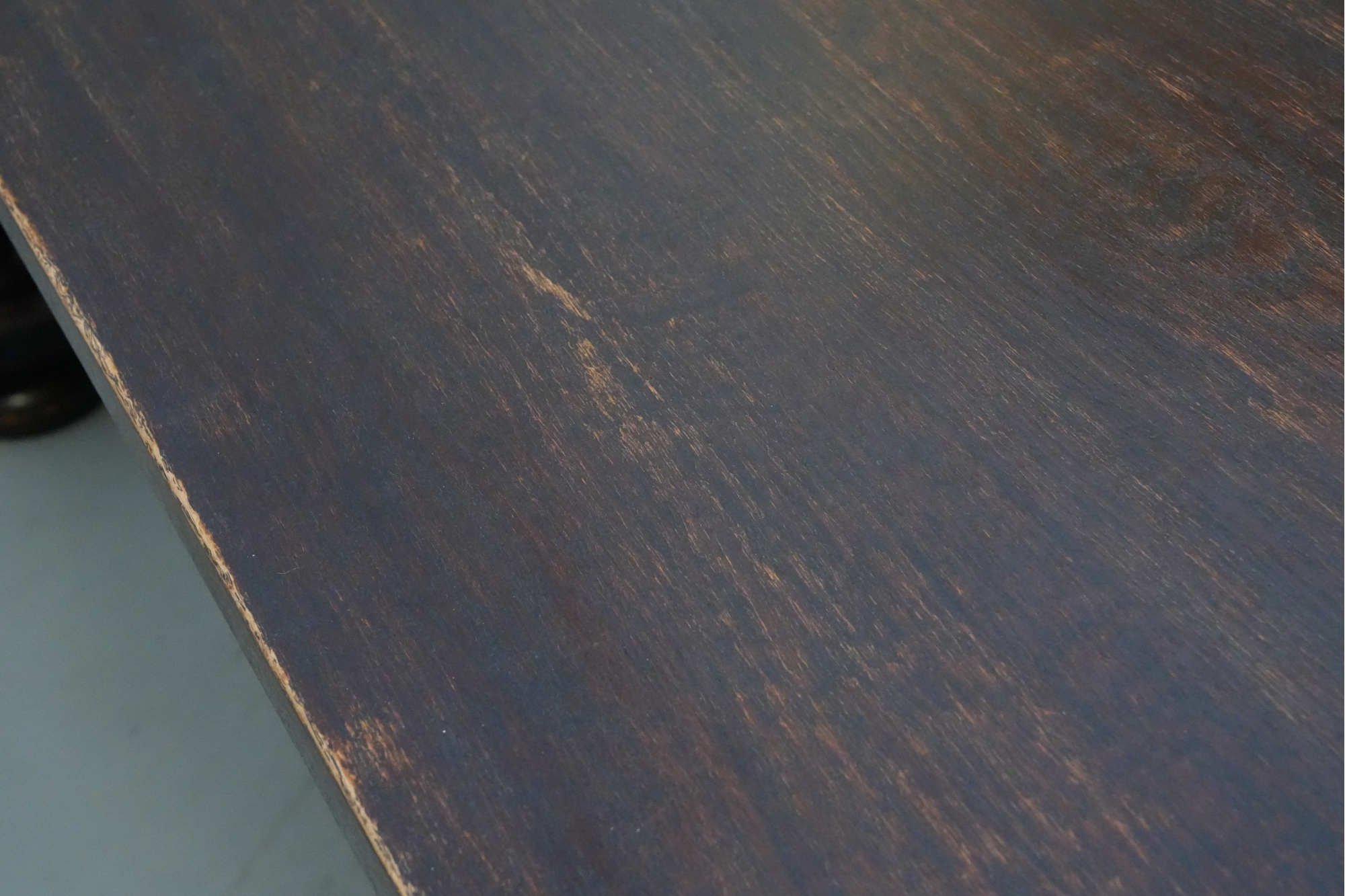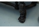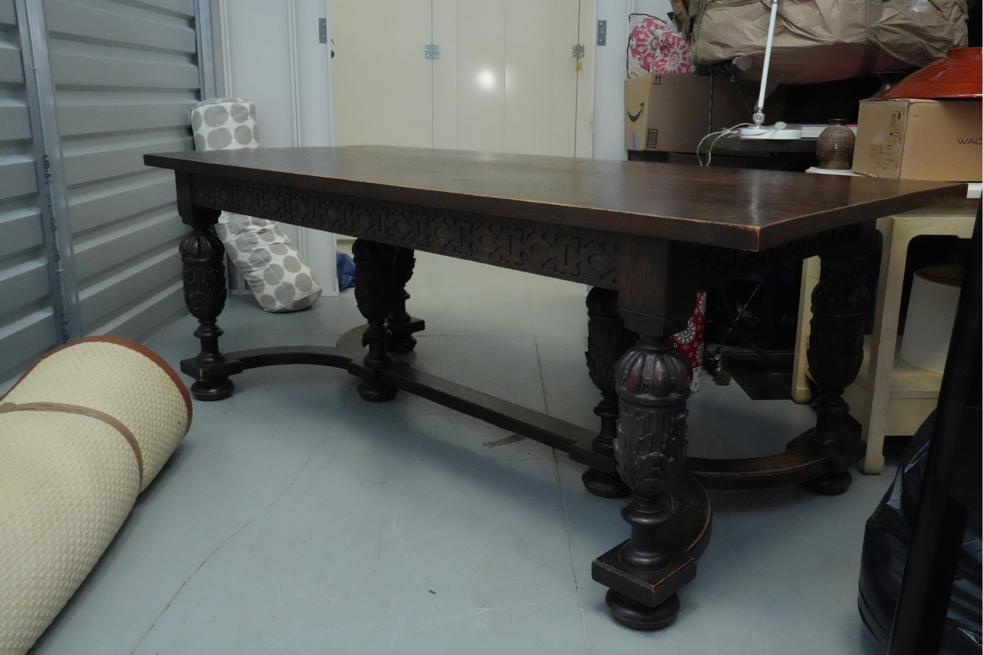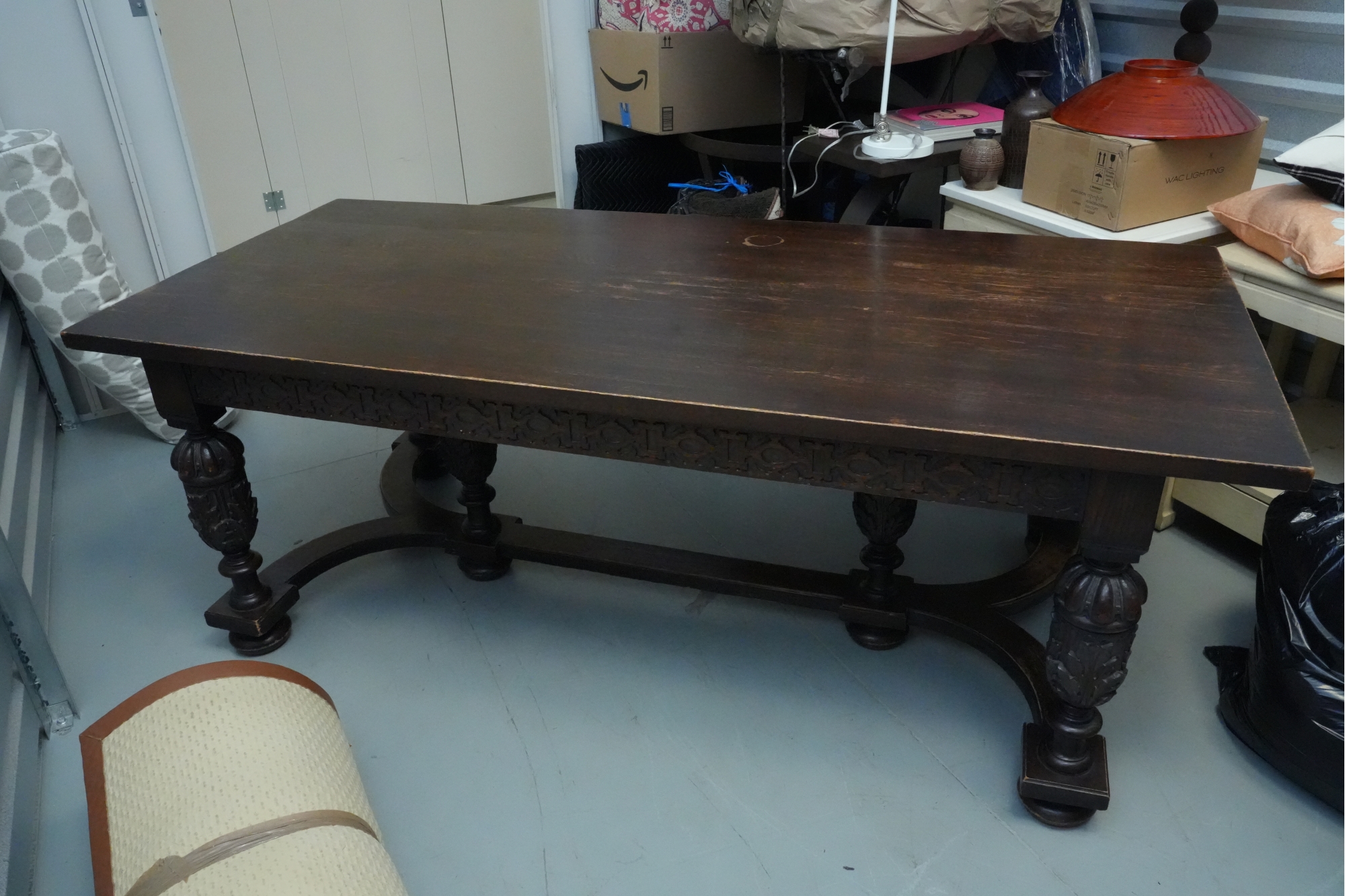 Antique-style carved oak refectory table in a dark finish with leaf-carved bulbous legs, curved stretchers, and a decorative carved apron.