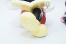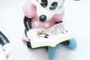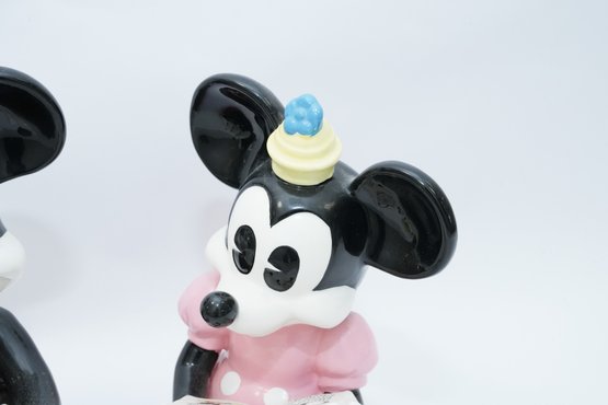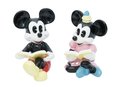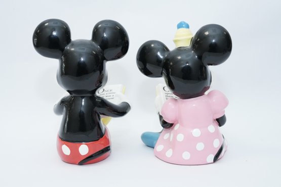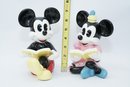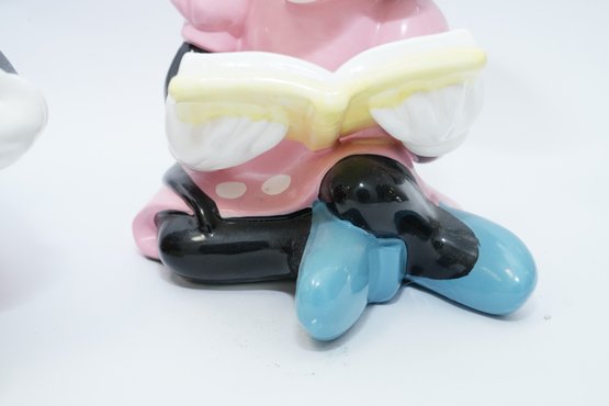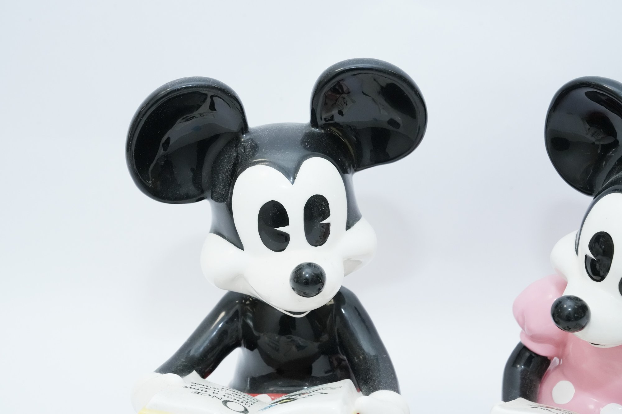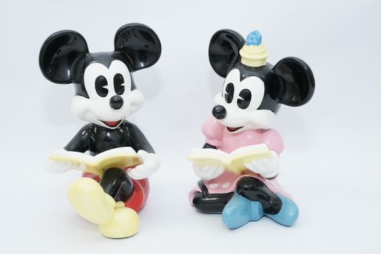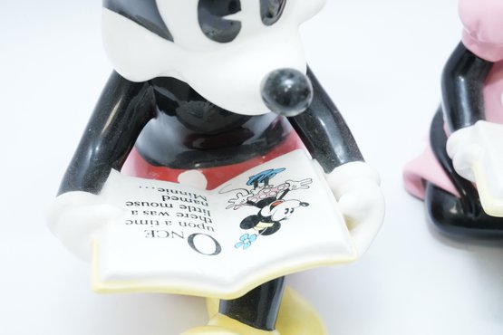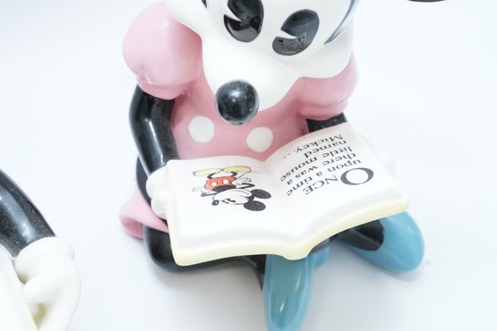 Vintage (1970s-1980s) ceramic figurines, depicting Mickey and Minnie Mouse seated and reading, finished in a glossy glaze with vibrant colors.