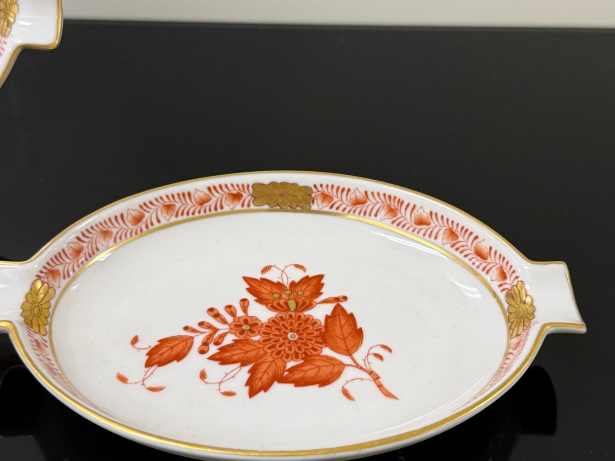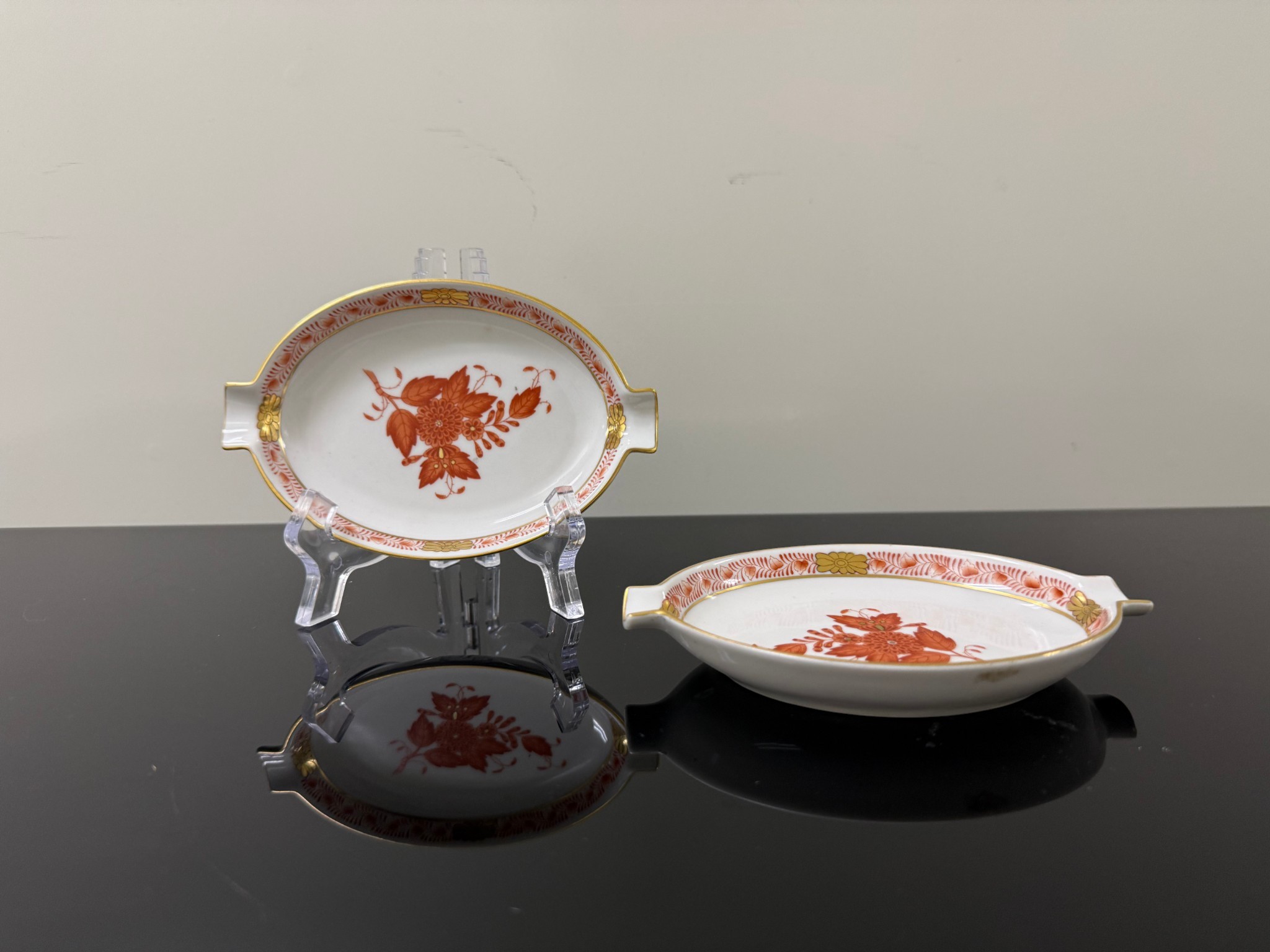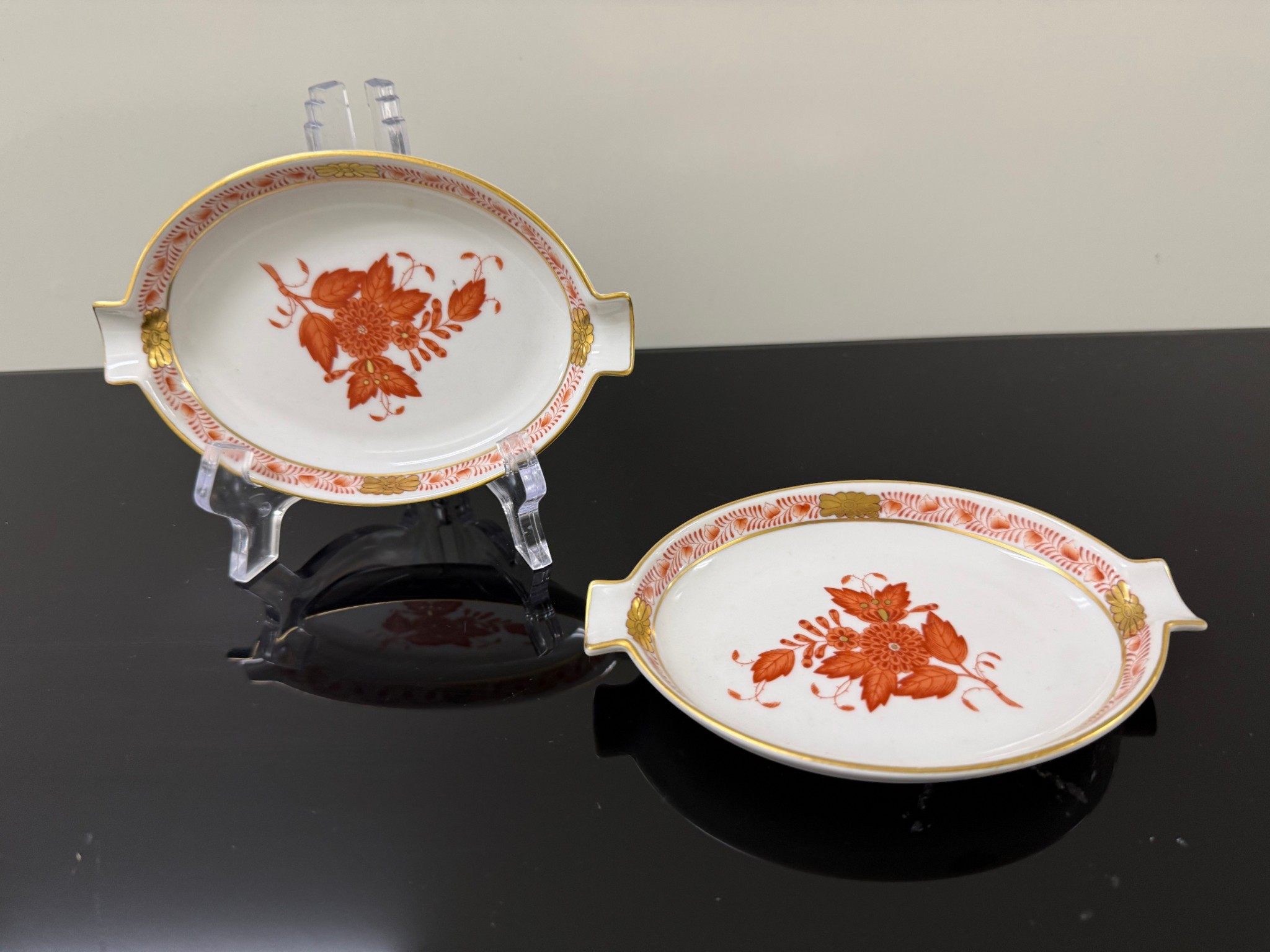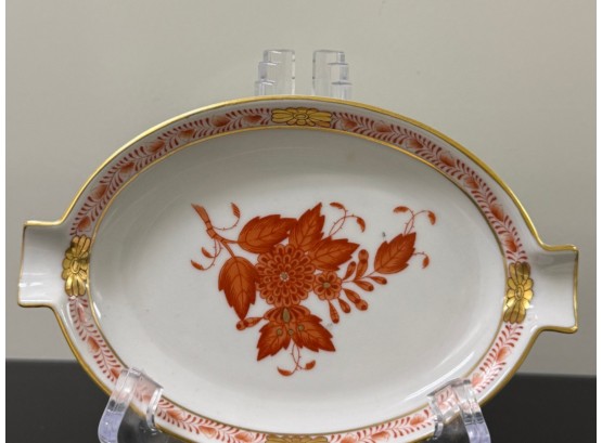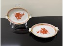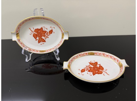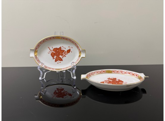Pair of vintage (1930s) Herend (Hungary) small hand‑painted porcelain ashtrays in the "Apponyi" rust‑orange pattern (#7783), originally created for Hungarian statesman Albert Apponyi. Each oval‑shaped tray features 24‑karat gold accents and opposing cradles for cigarettes or cigars.