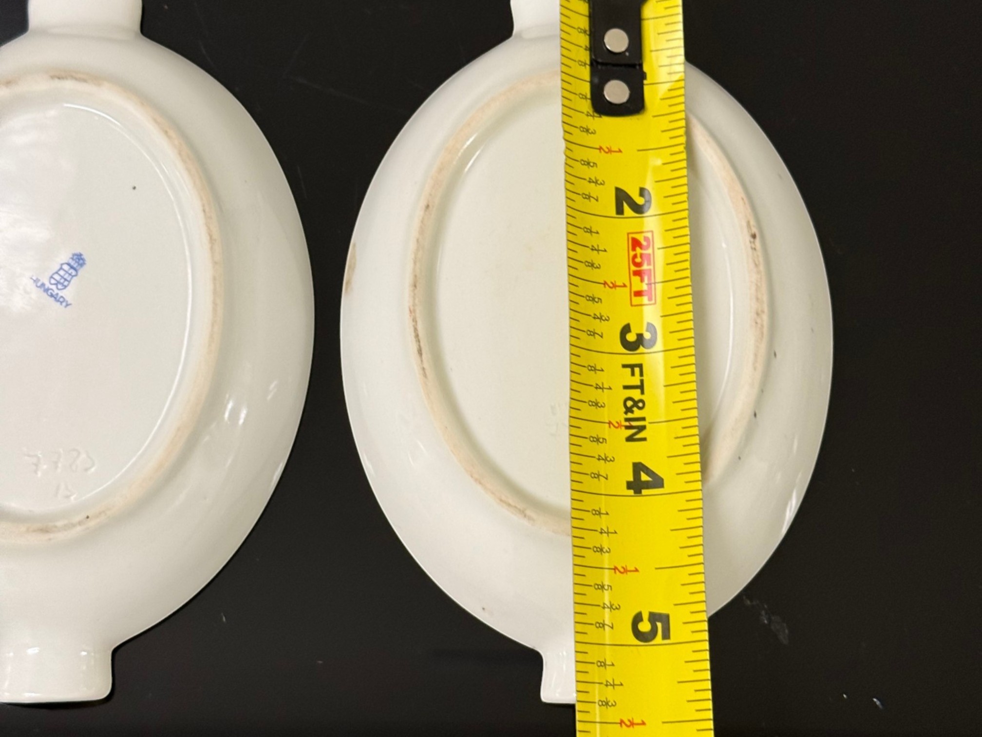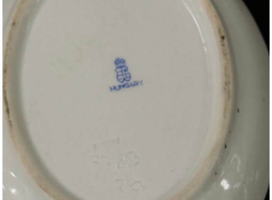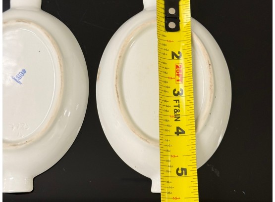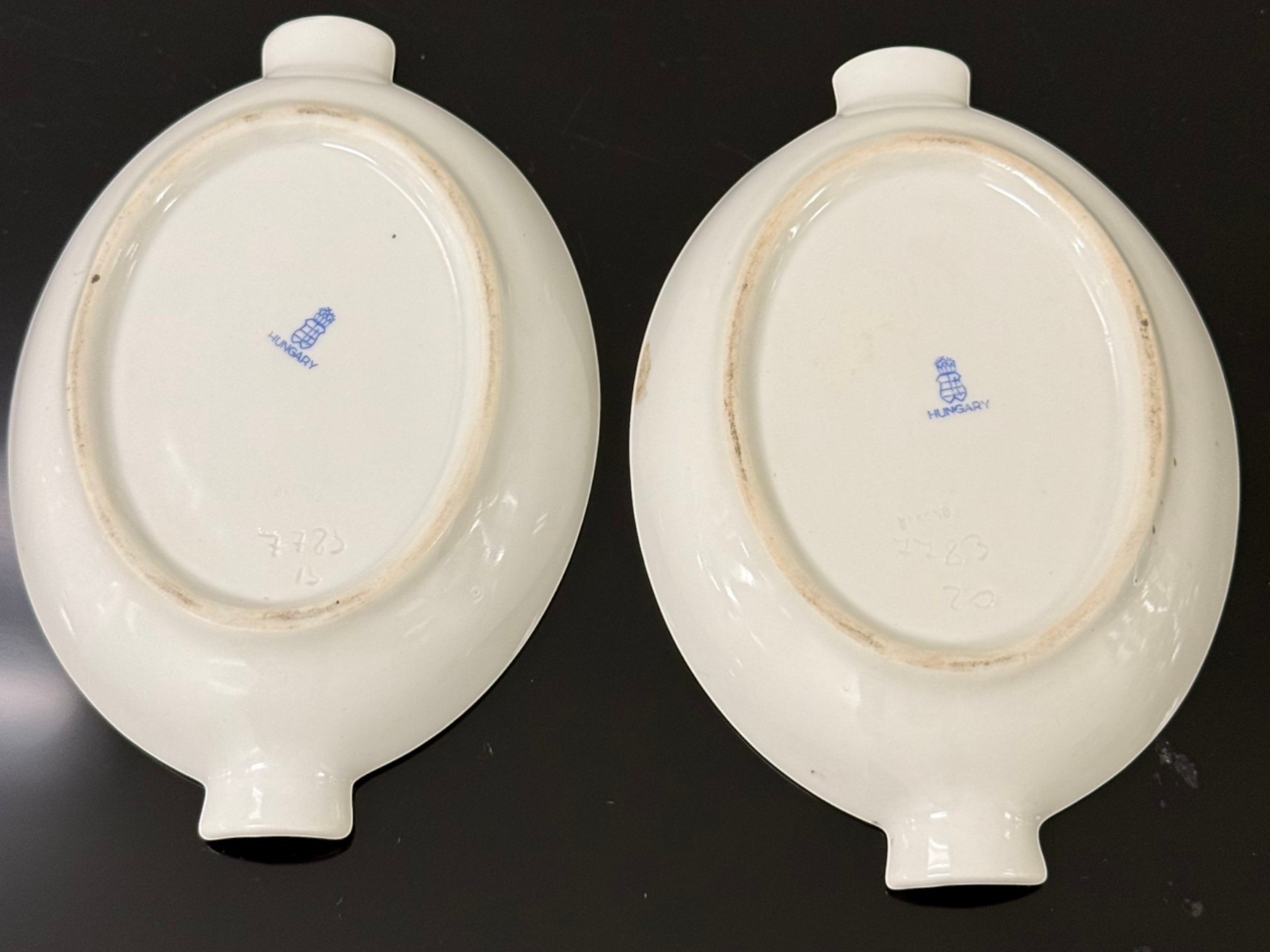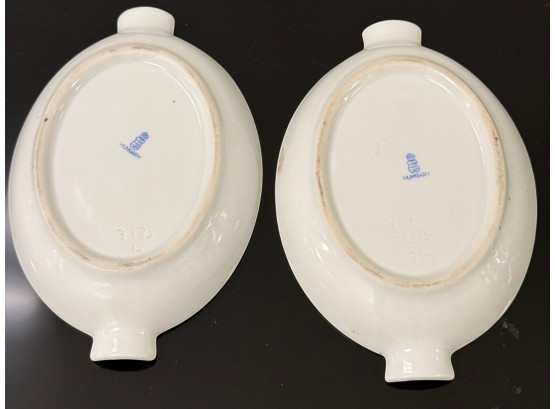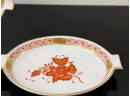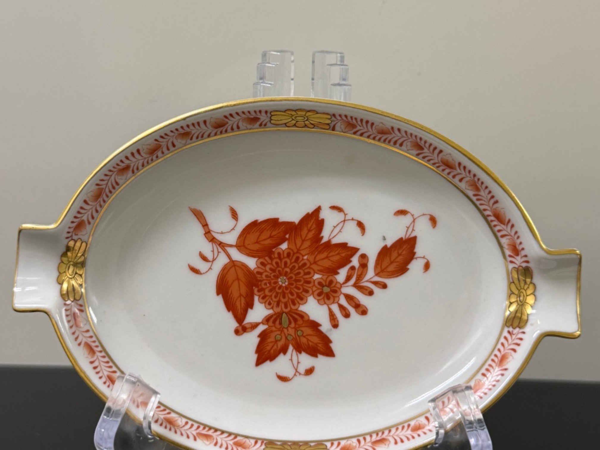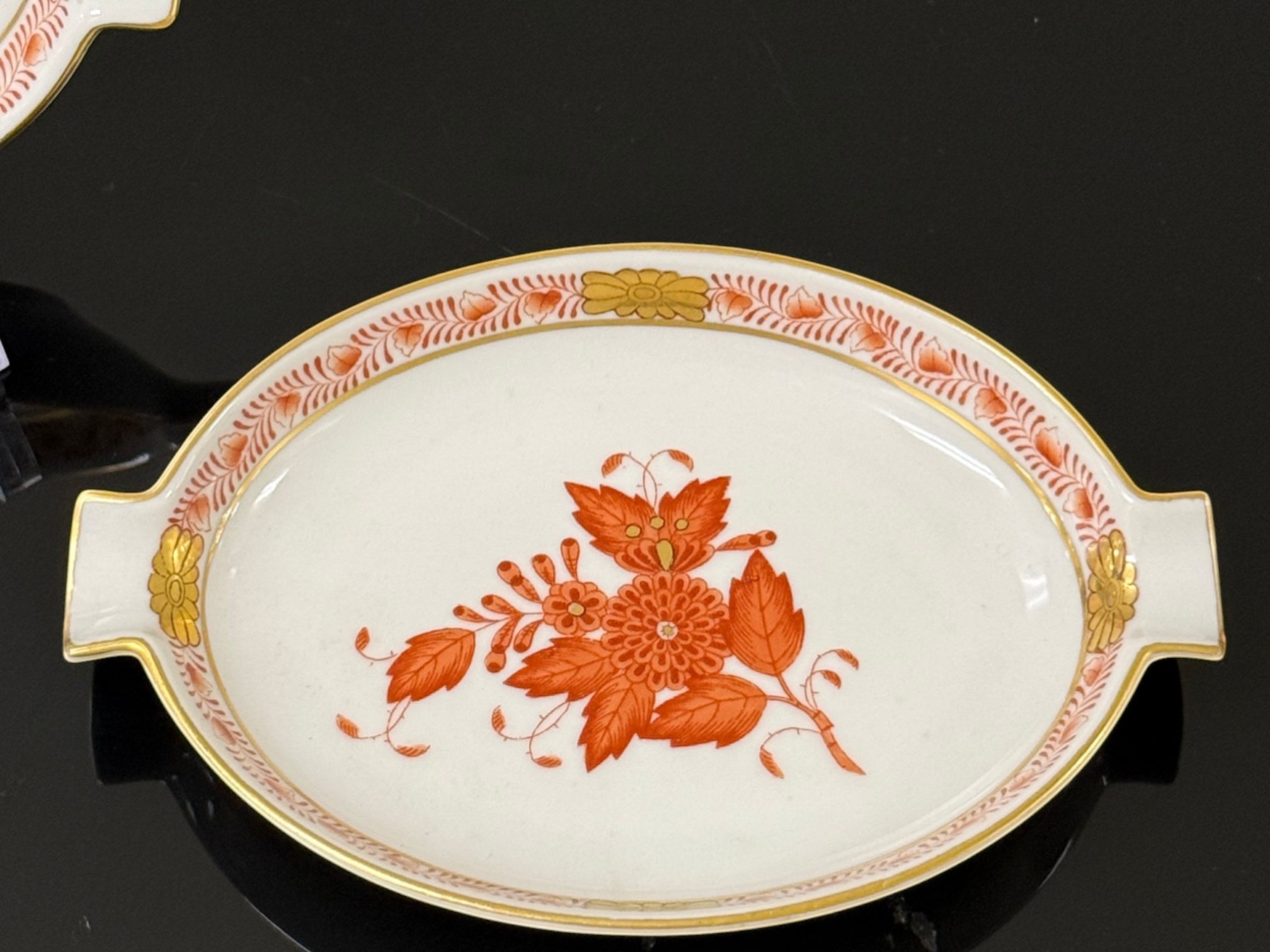 Pair of vintage (1930s) Herend (Hungary) small hand‑painted porcelain ashtrays in the "Apponyi" rust‑orange pattern (#7783), originally created for Hungarian statesman Albert Apponyi. Each oval‑shaped tray features 24‑karat gold accents and opposing cradles for cigarettes or cigars.