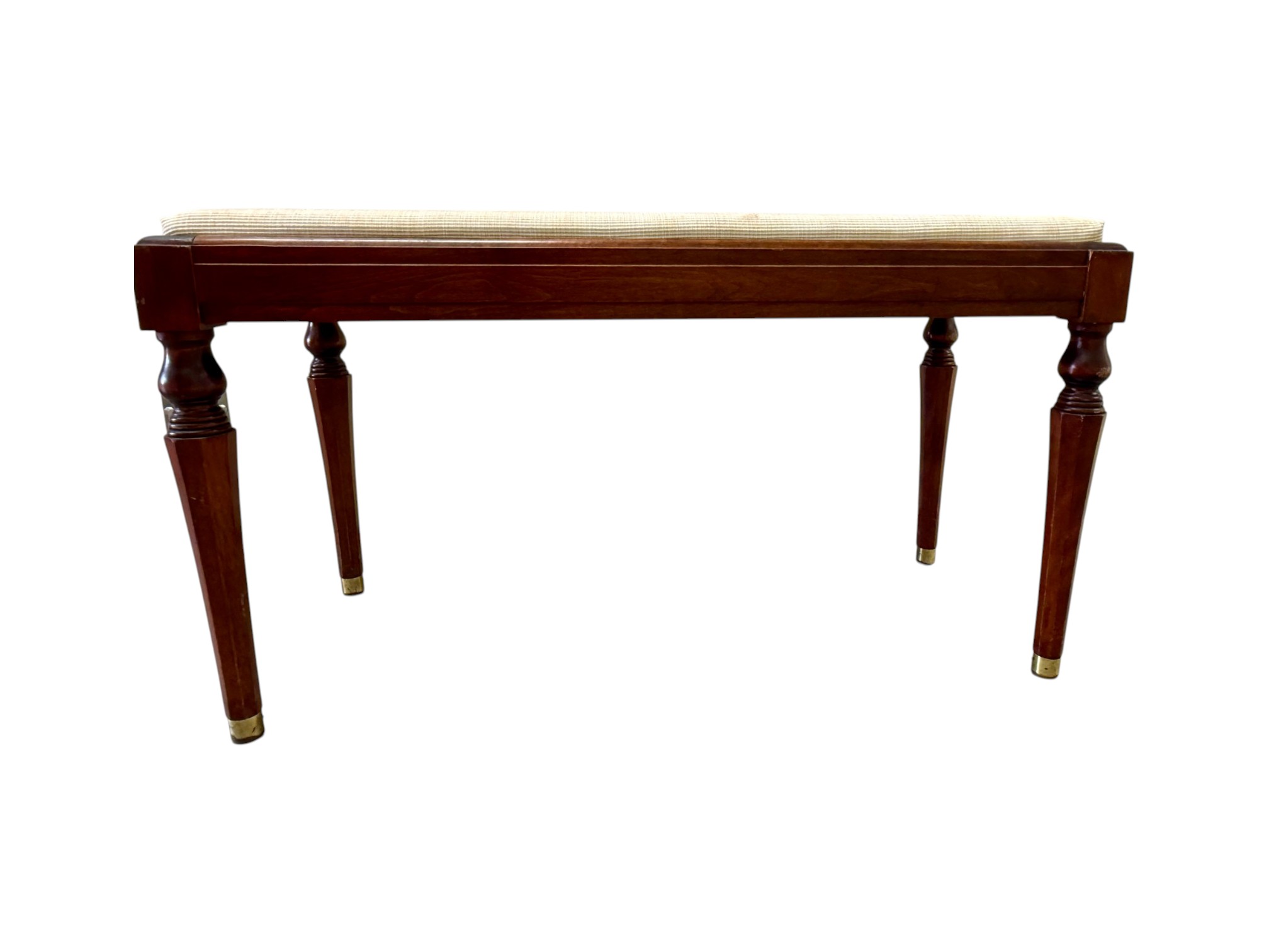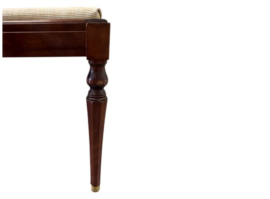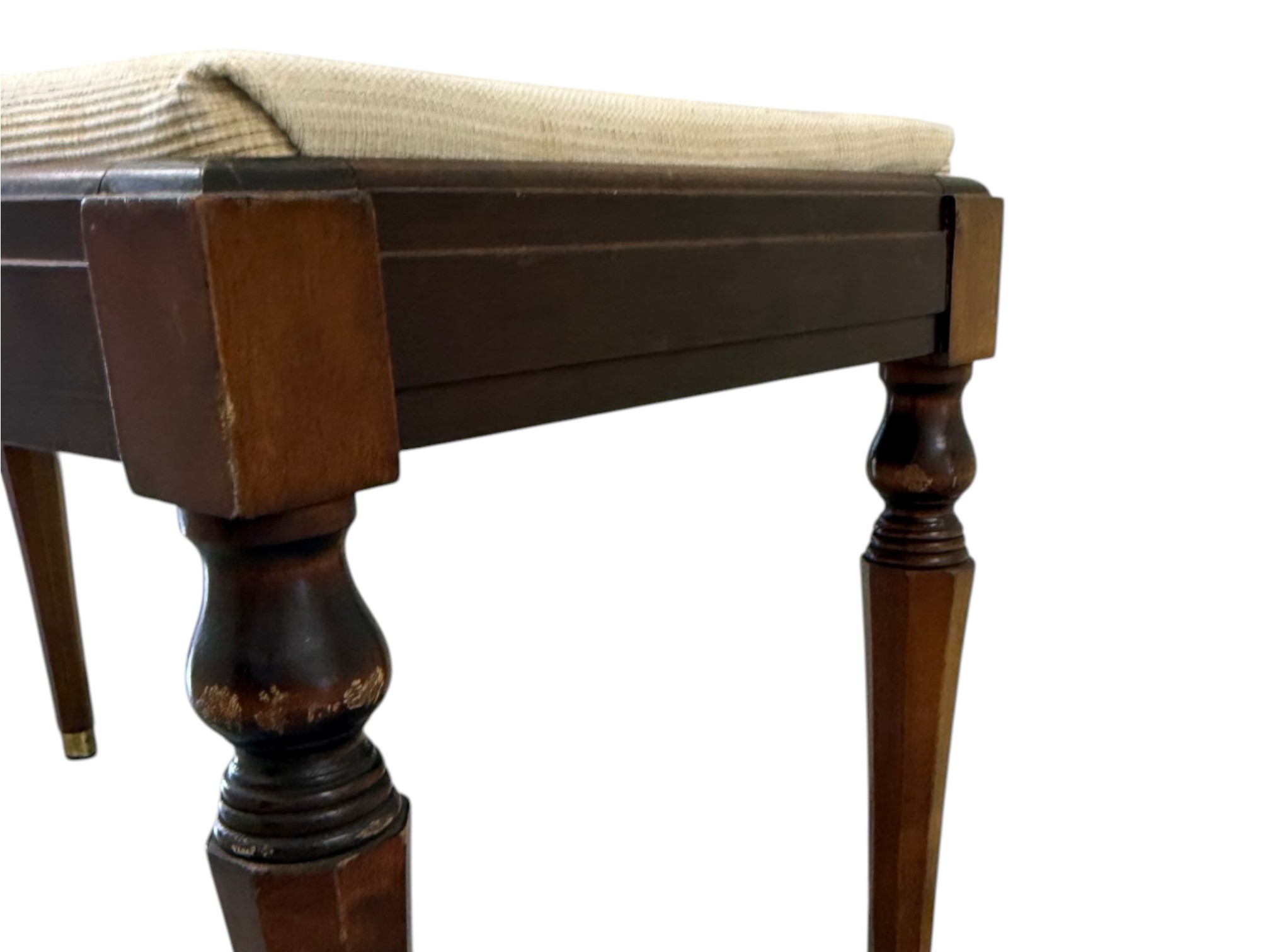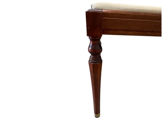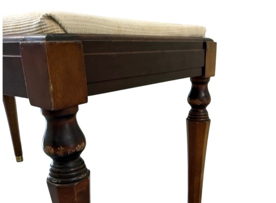 Vintage (19th-20th c.) Victorian-style upholstered mahogany piano bench, featuring turned legs and brass-capped feet.