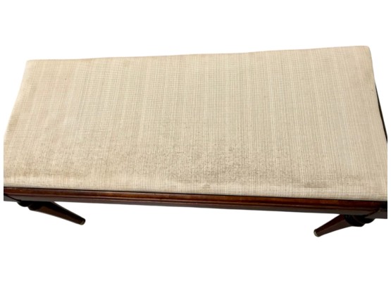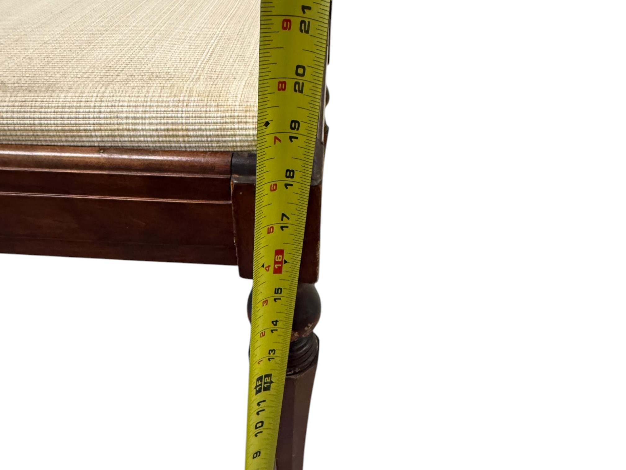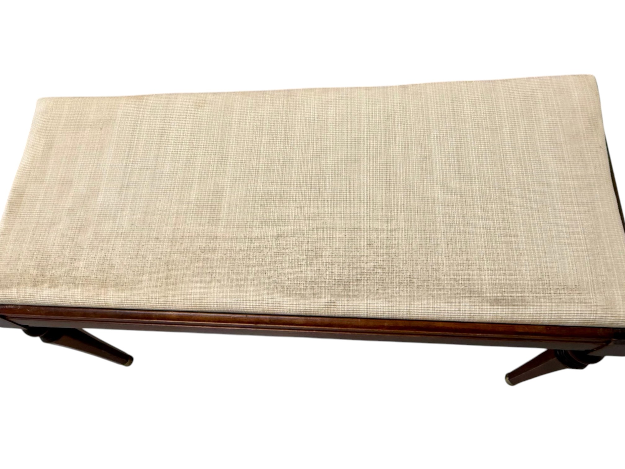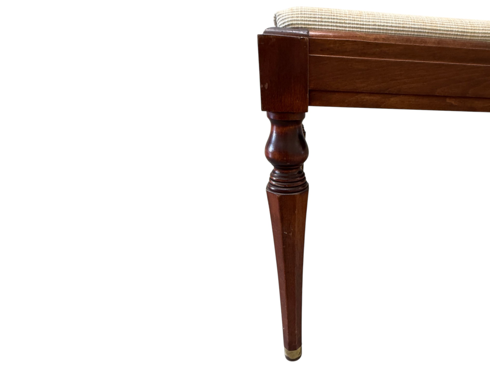 Vintage (19th-20th c.) Victorian-style upholstered mahogany piano bench, featuring turned legs and brass-capped feet.