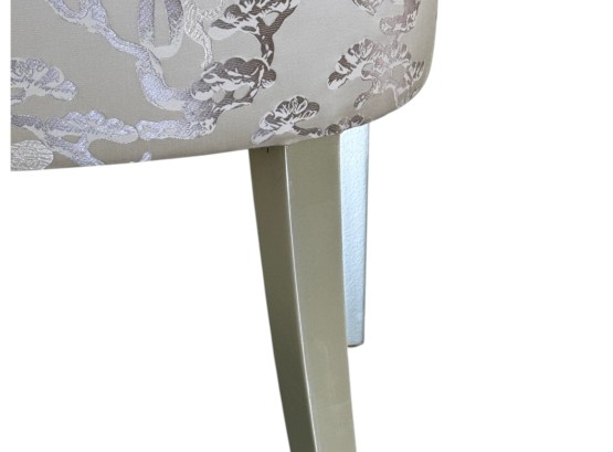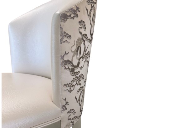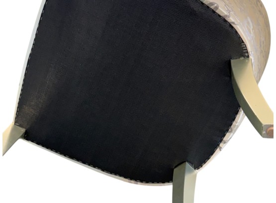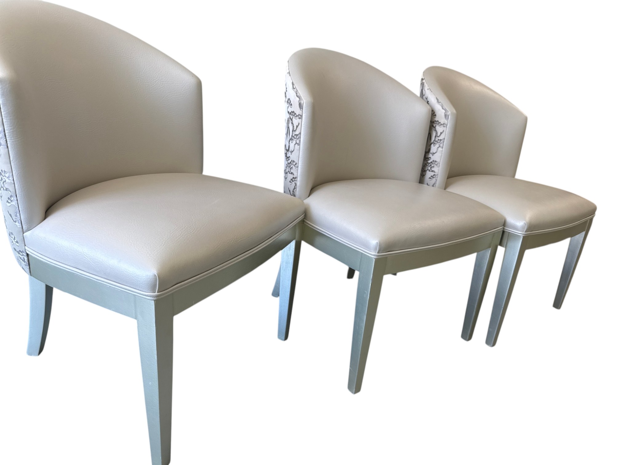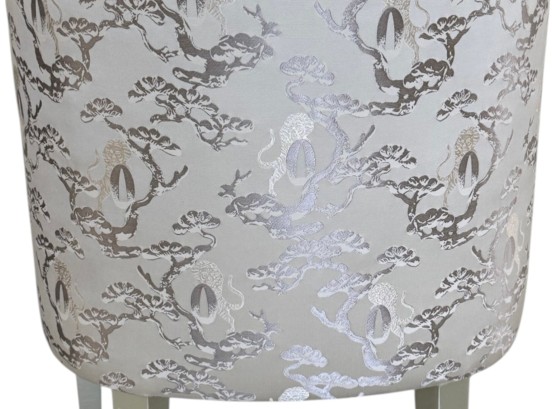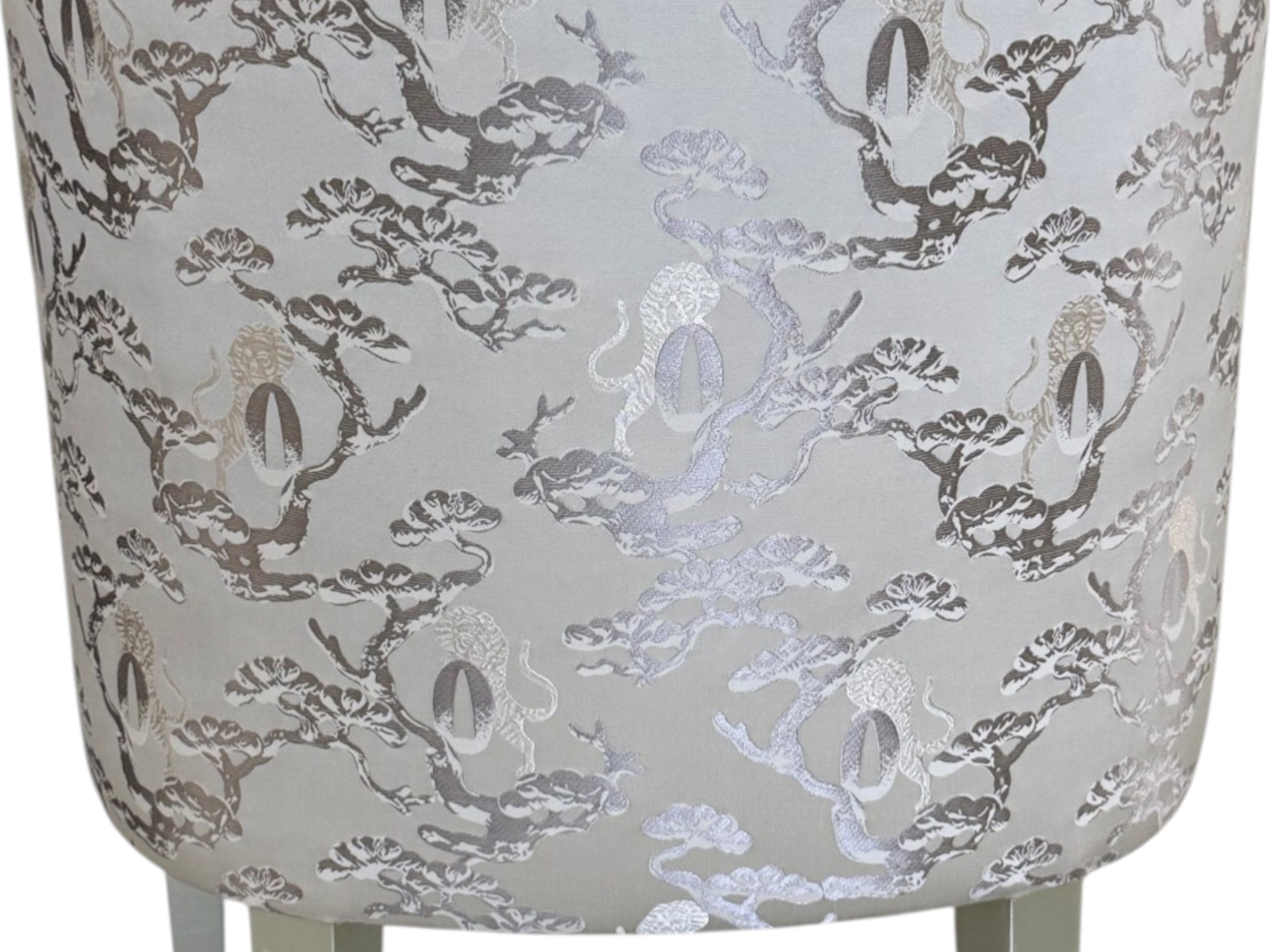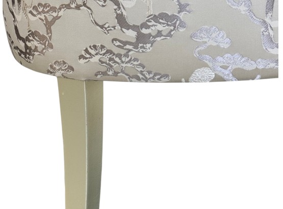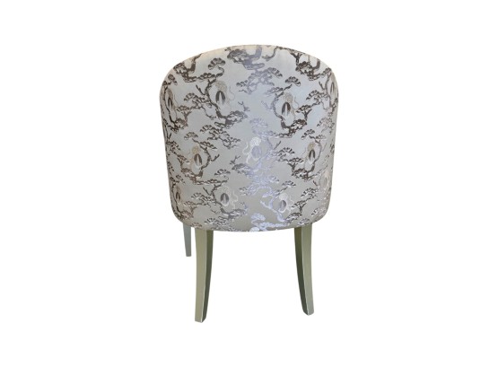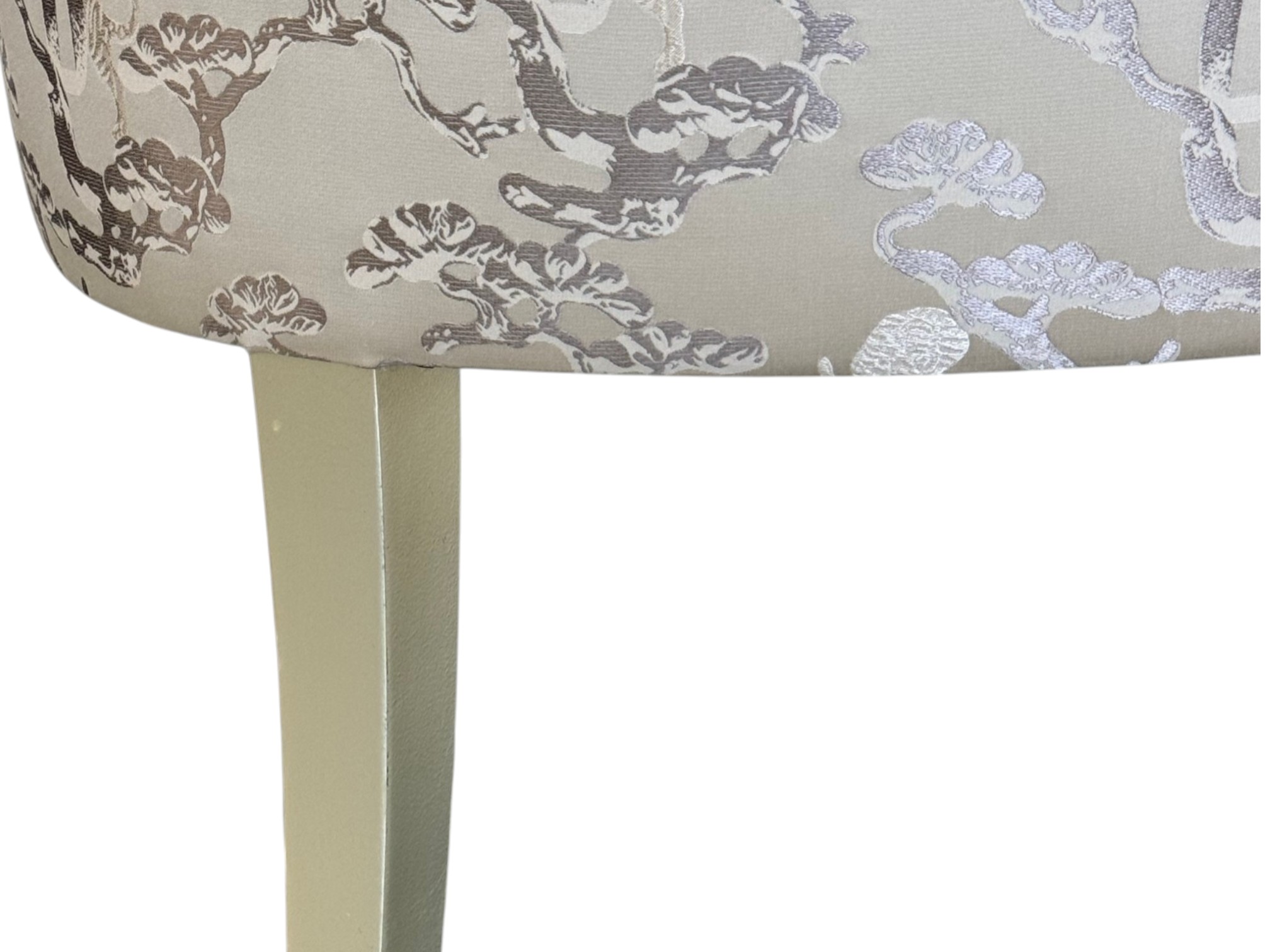 Set of six (6) upholstered accent chairs, featuring a curved backrest with a silver-toned Asian-inspired floral pattern on light grey fabric and tapered legs.