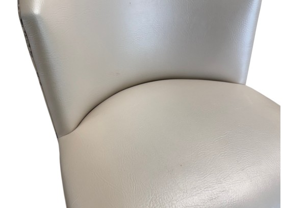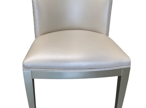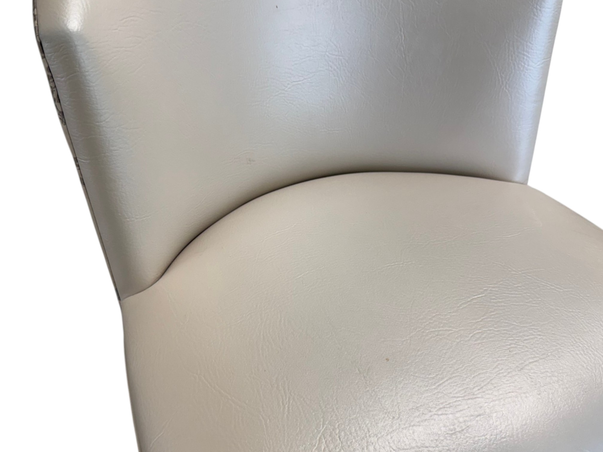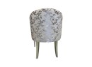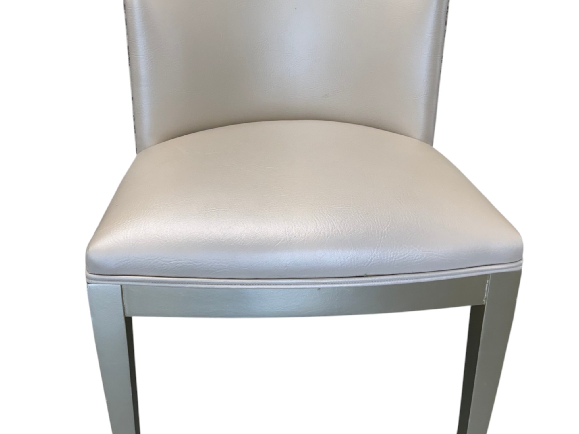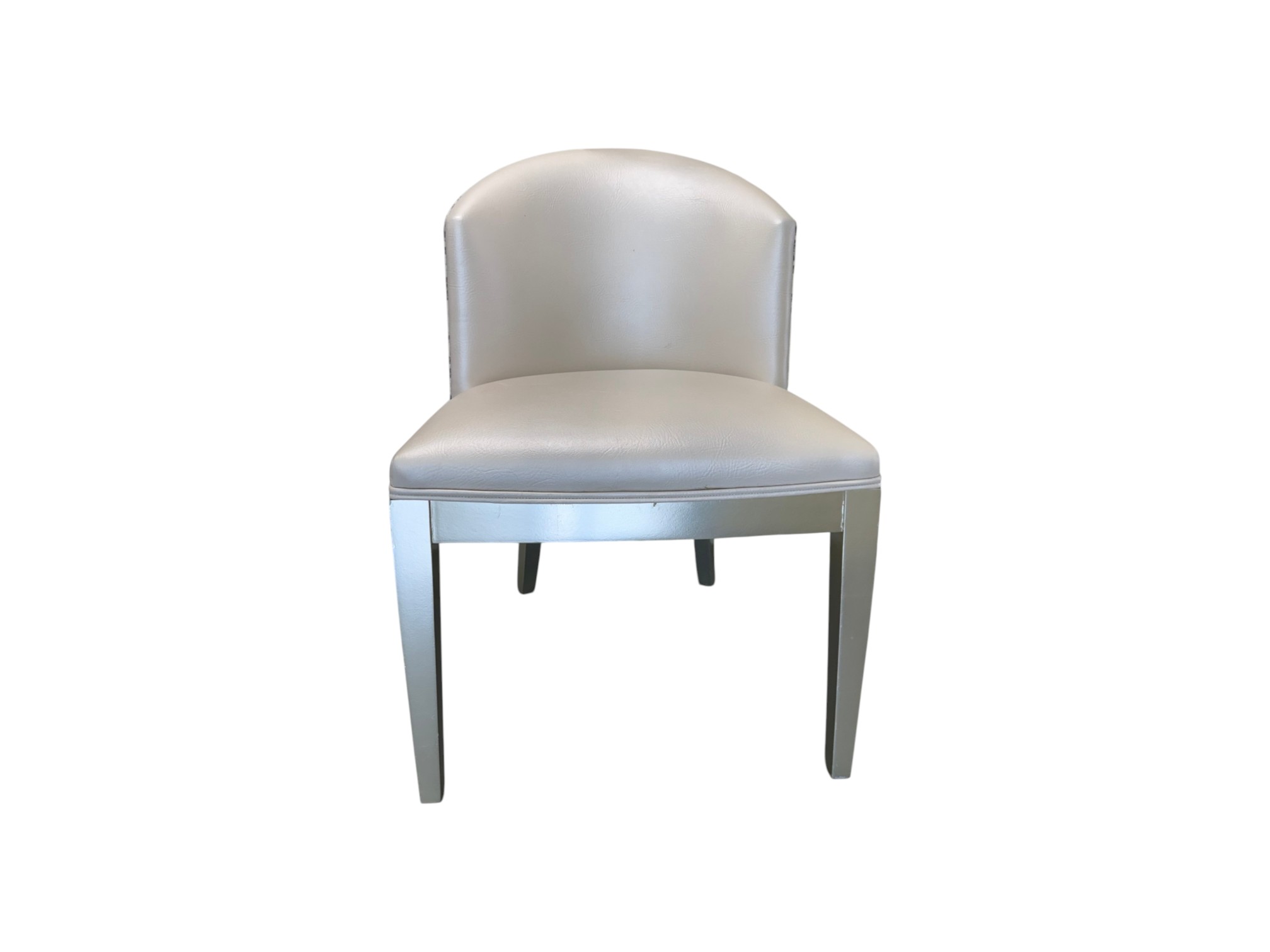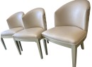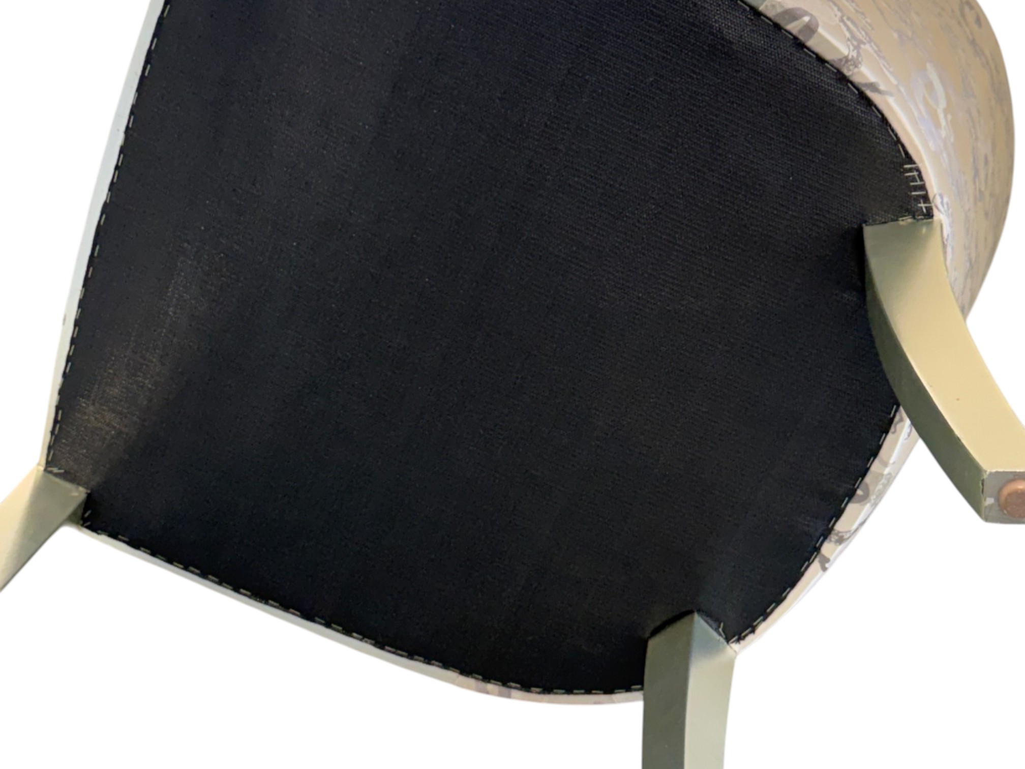 Set of six (6) upholstered accent chairs, featuring a curved backrest with a silver-toned Asian-inspired floral pattern on light grey fabric and tapered legs.