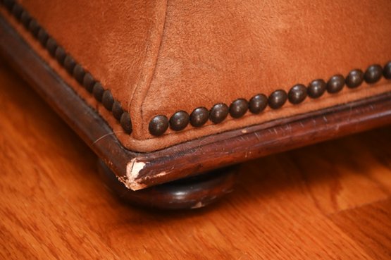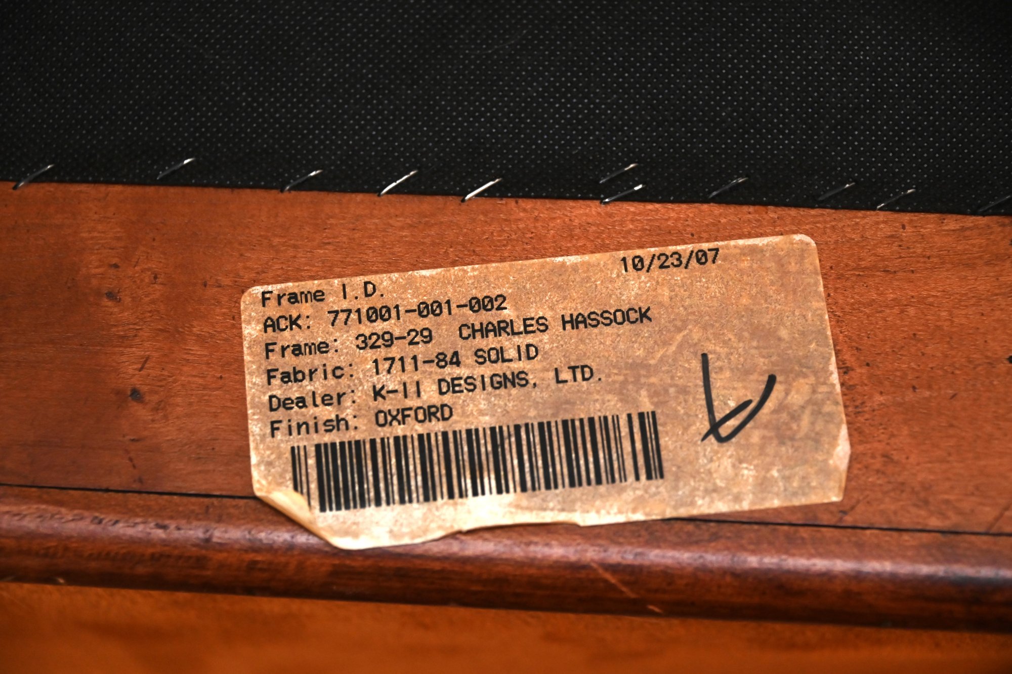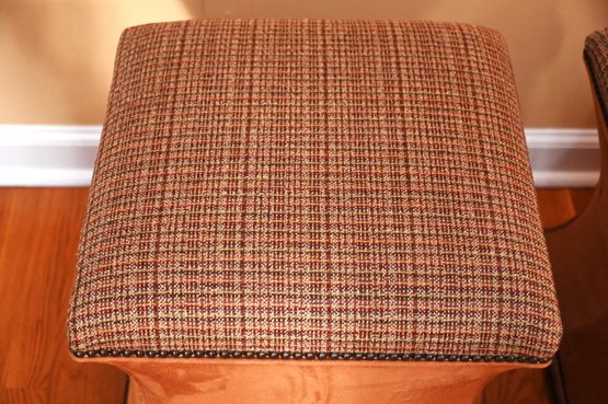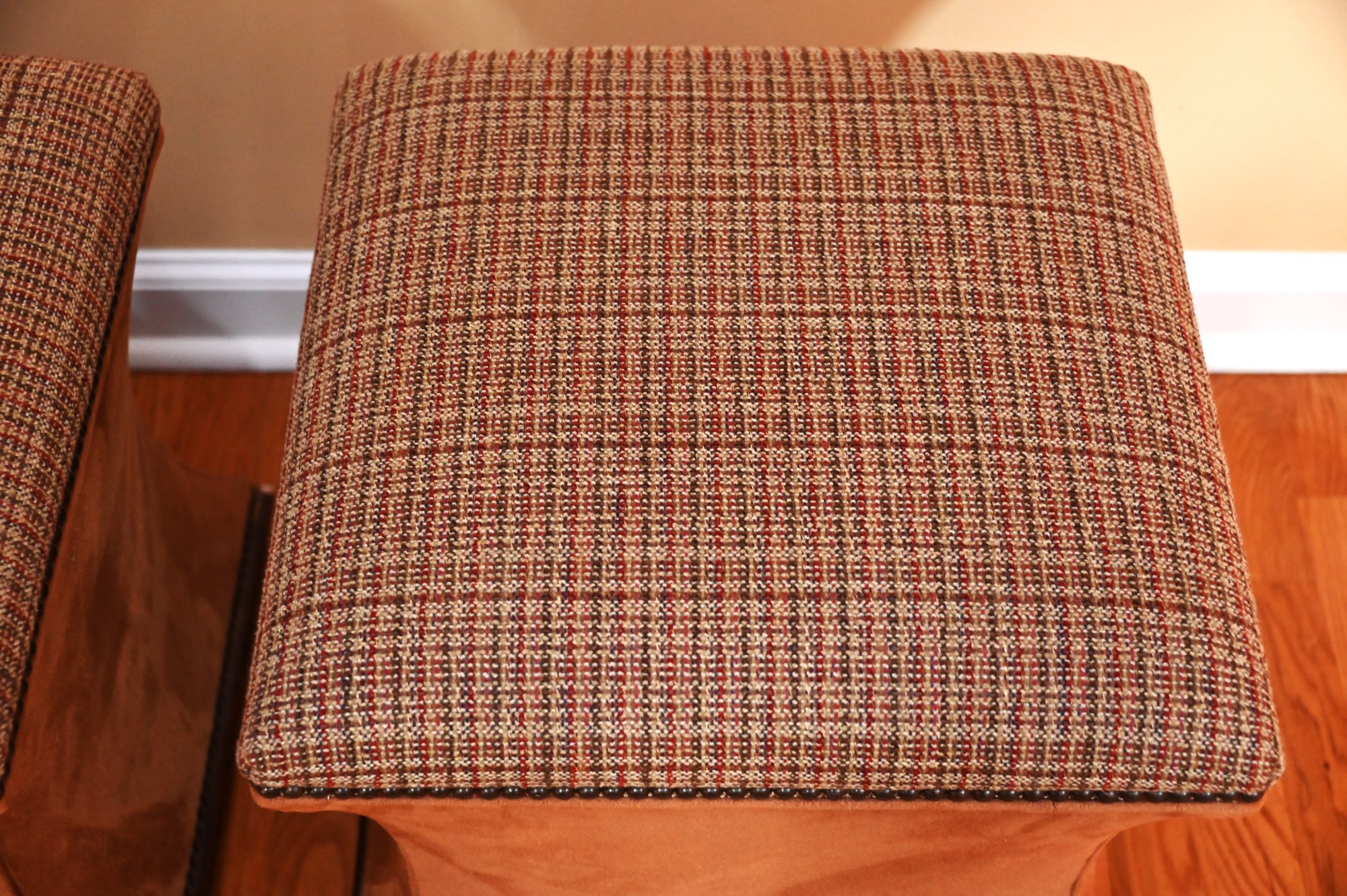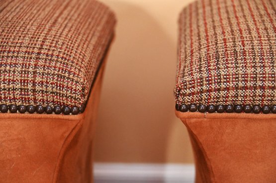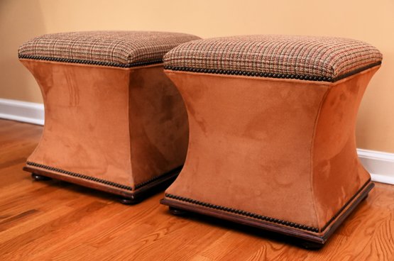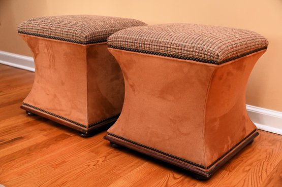 These Charles Hassock oxford covered ottomans feature a sophisticated blend of form and function. Their curvaceous silhouette gives them a sculptural presence, while the mix of materials adds richness and depth. The seats are upholstered in a refined plaid fabric with subtle earthy tones, providing a warm and classic aesthetic. The base is covered in a soft, suede-like material, complementing the top with a contrast in both texture and color.