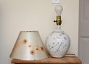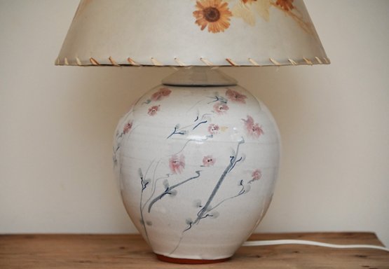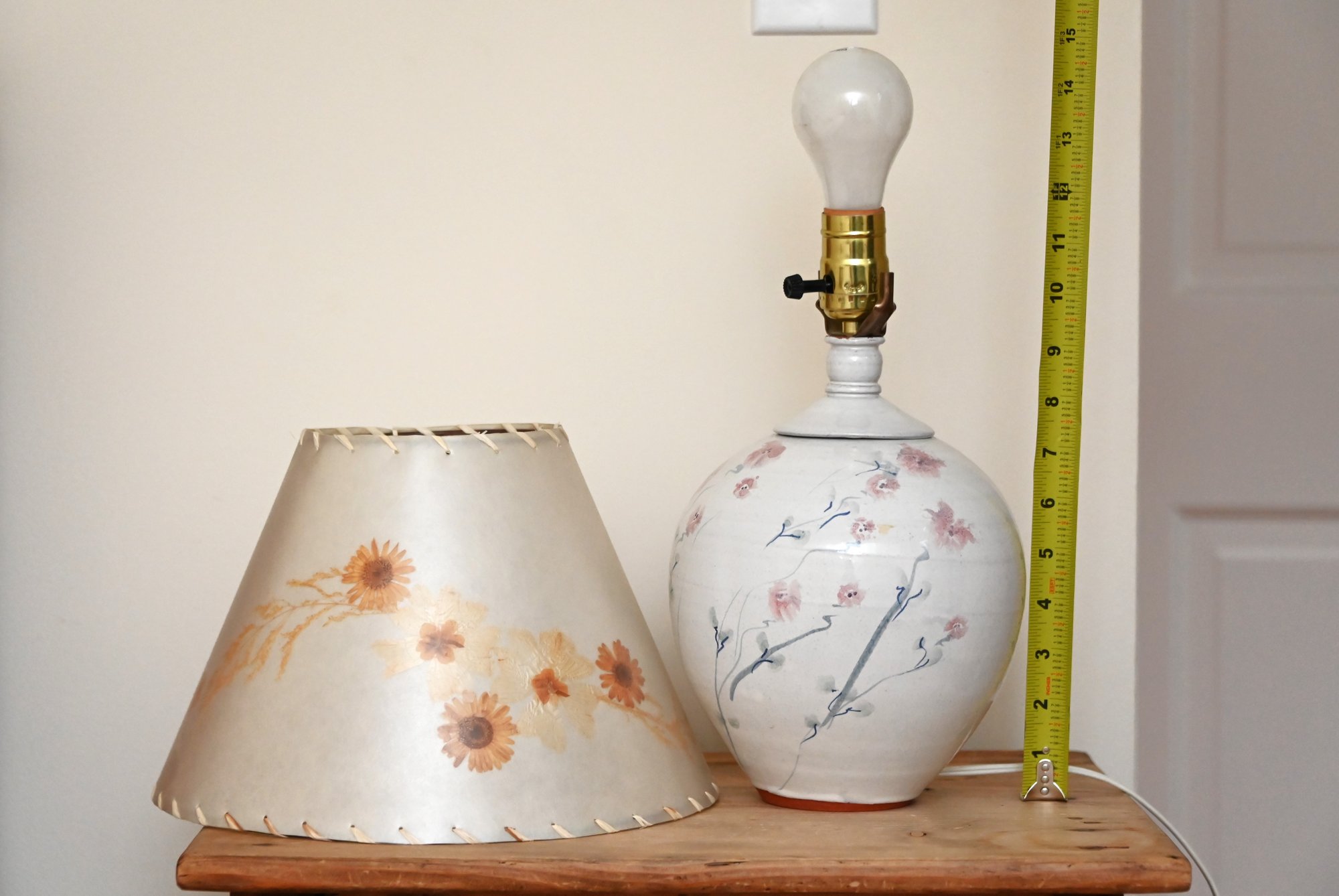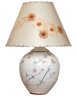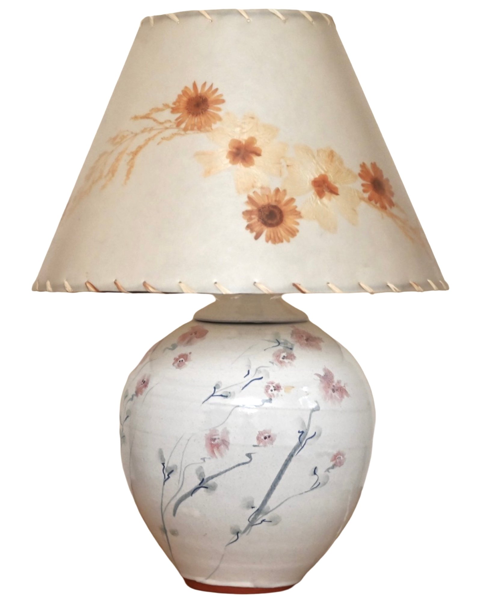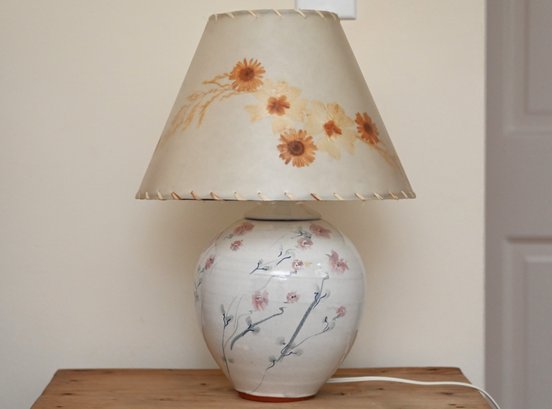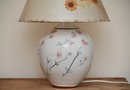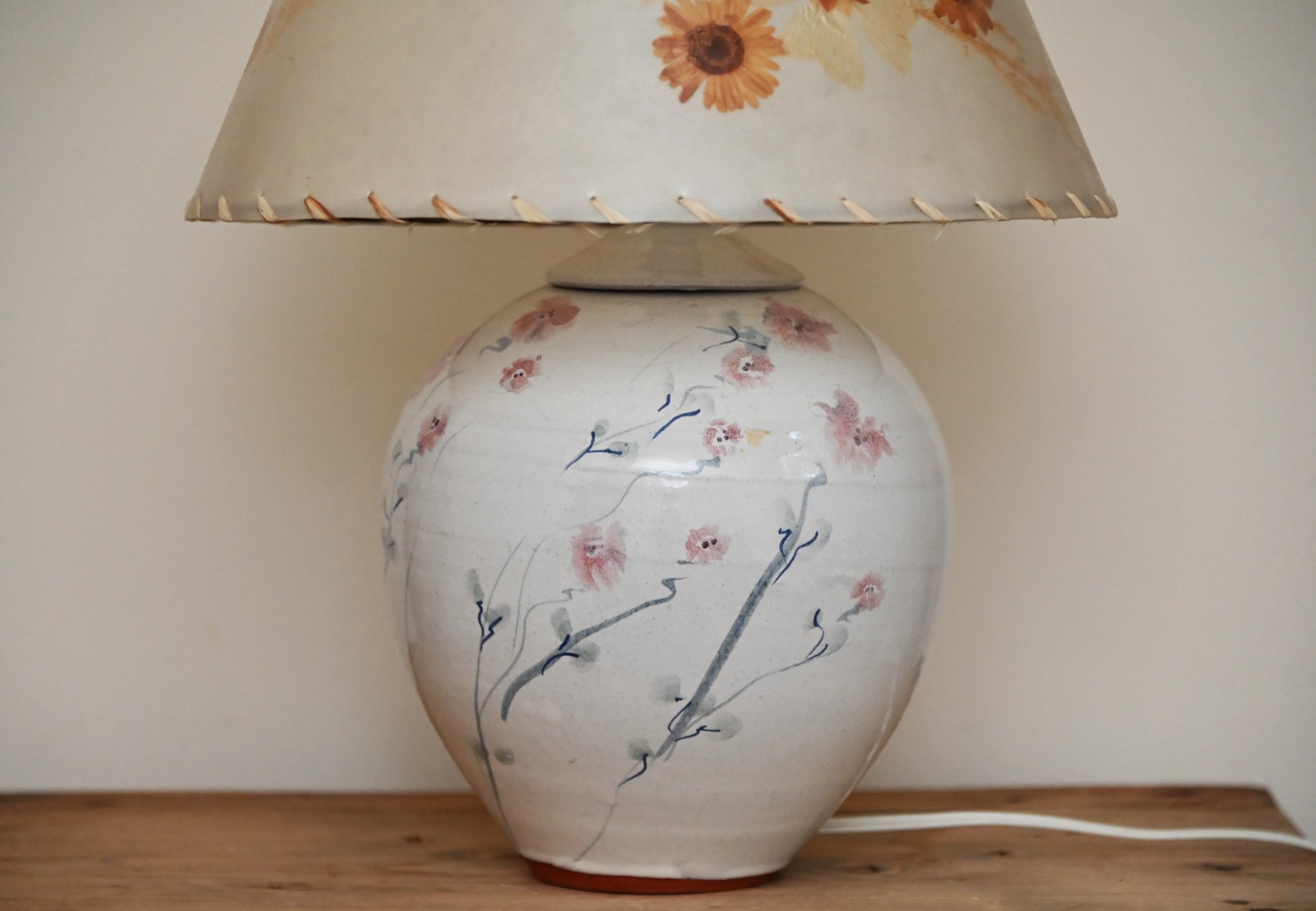 This is a charming vintage-style table lamp with a hand-painted ceramic base and a floral-adorned lampshade. The base is a rounded, vase-like ceramic piece with a glossy off-white glaze, delicately decorated with pink blossoms and fine blue branches, giving it a soft, organic aesthetic.