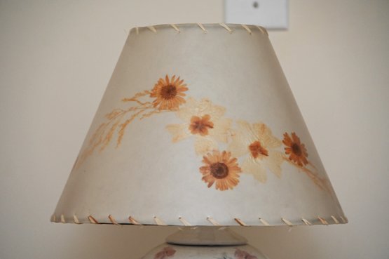 The shade is a unique parchment-style piece featuring pressed flowers embedded into its surface. The floral arrangement includes warm orange and yellow blooms, adding a natural and rustic touch. The shade is finished with a stitched trim along the edges, enhancing its handmade appeal.