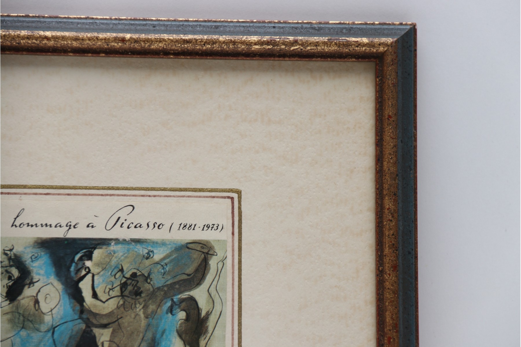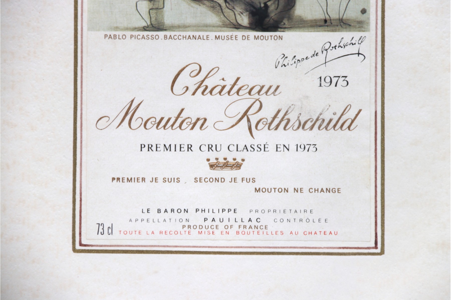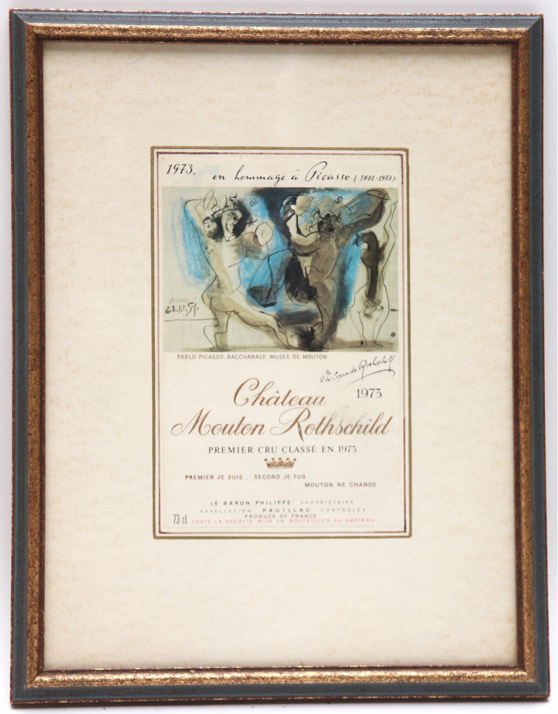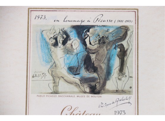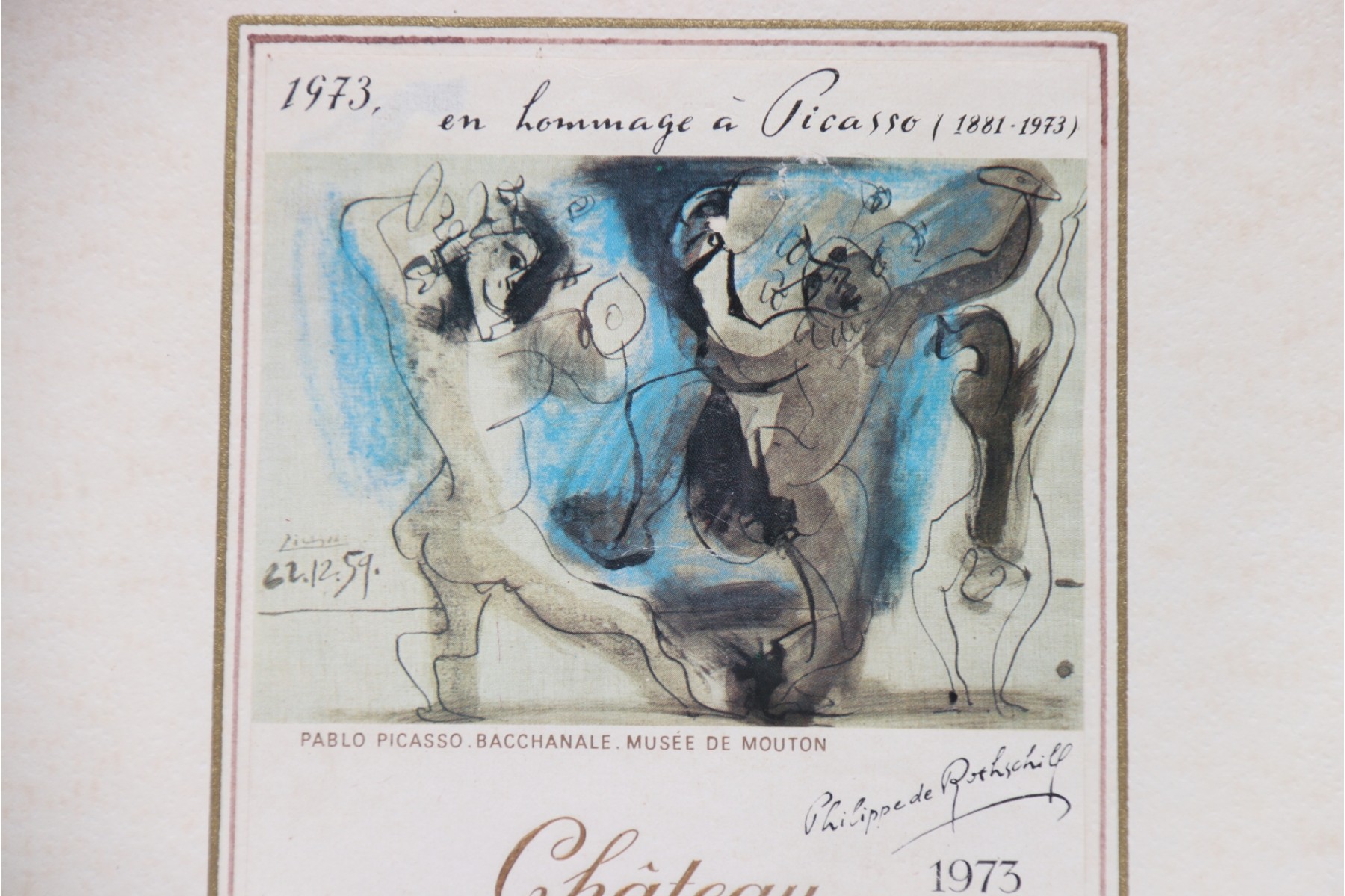 Picasso was commissioned by Baron Philippe de Rothschild to design the art for this wine label for his Chateau Mouton Rothschild Premier Cru Classe En 1973. Signed "1973, "en hommage a Picasso- measures 12 x 9