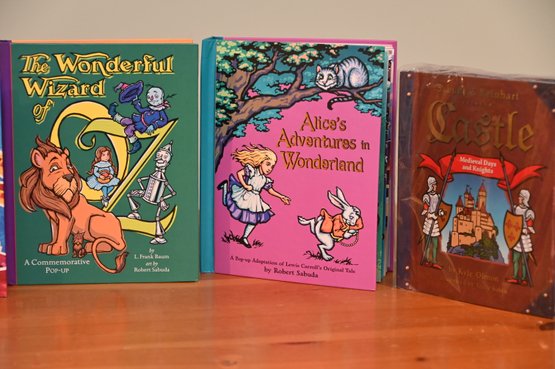 "Alice’s Adventures in Wonderland" by Robert Sabuda – A pink-covered book showcasing Alice and the White Rabbit, bringing Lewis Carroll’s classic story to life through intricate pop-ups.