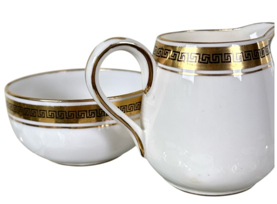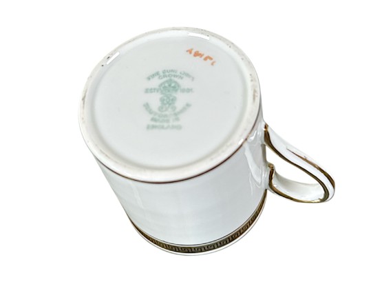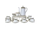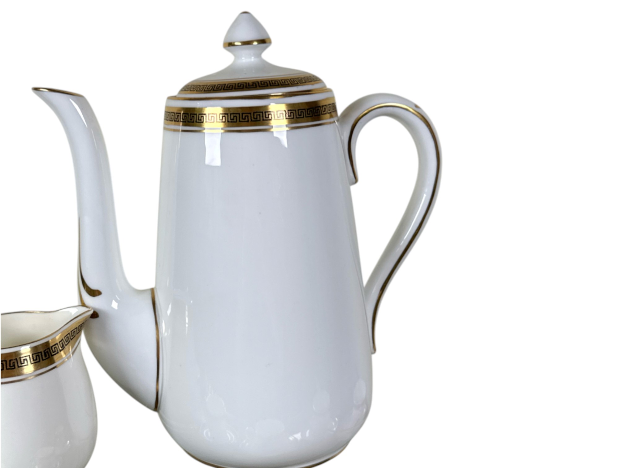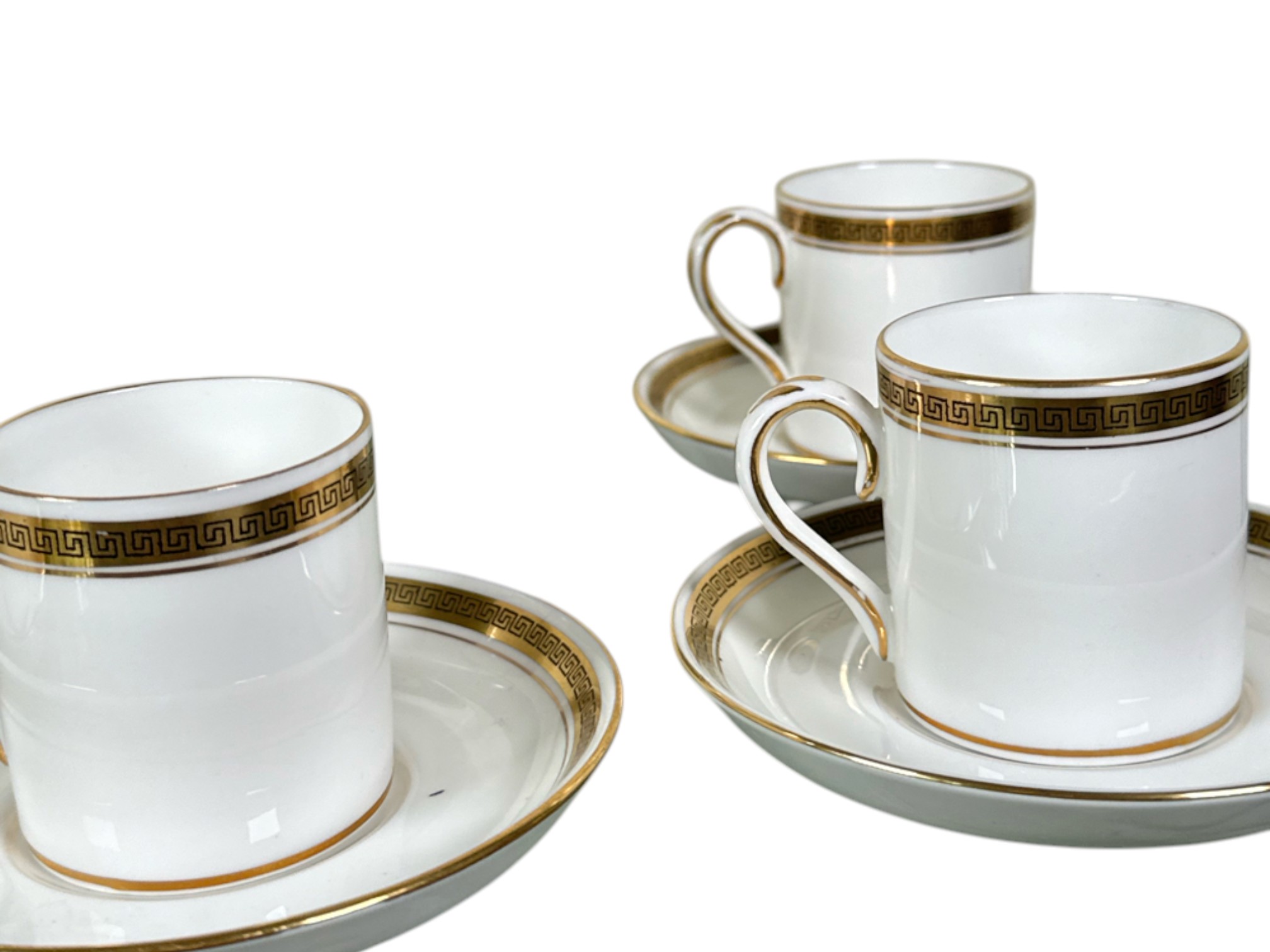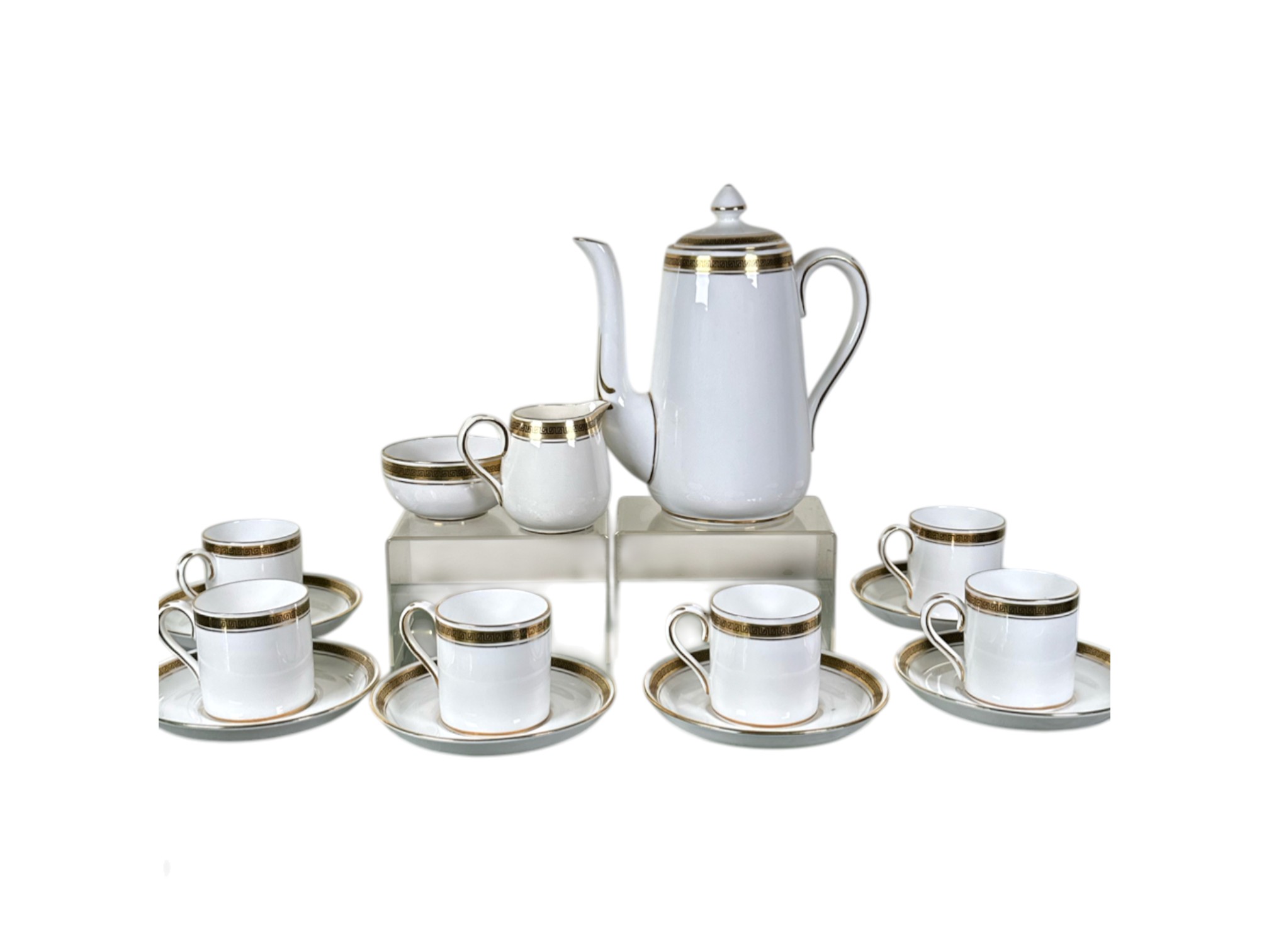 Crown Staffordshire "Greek Key" pattern coffee service, made of ivory fine china and accented with a gold band resembling a Grecian pattern. Full set includes service for six (6) guests: