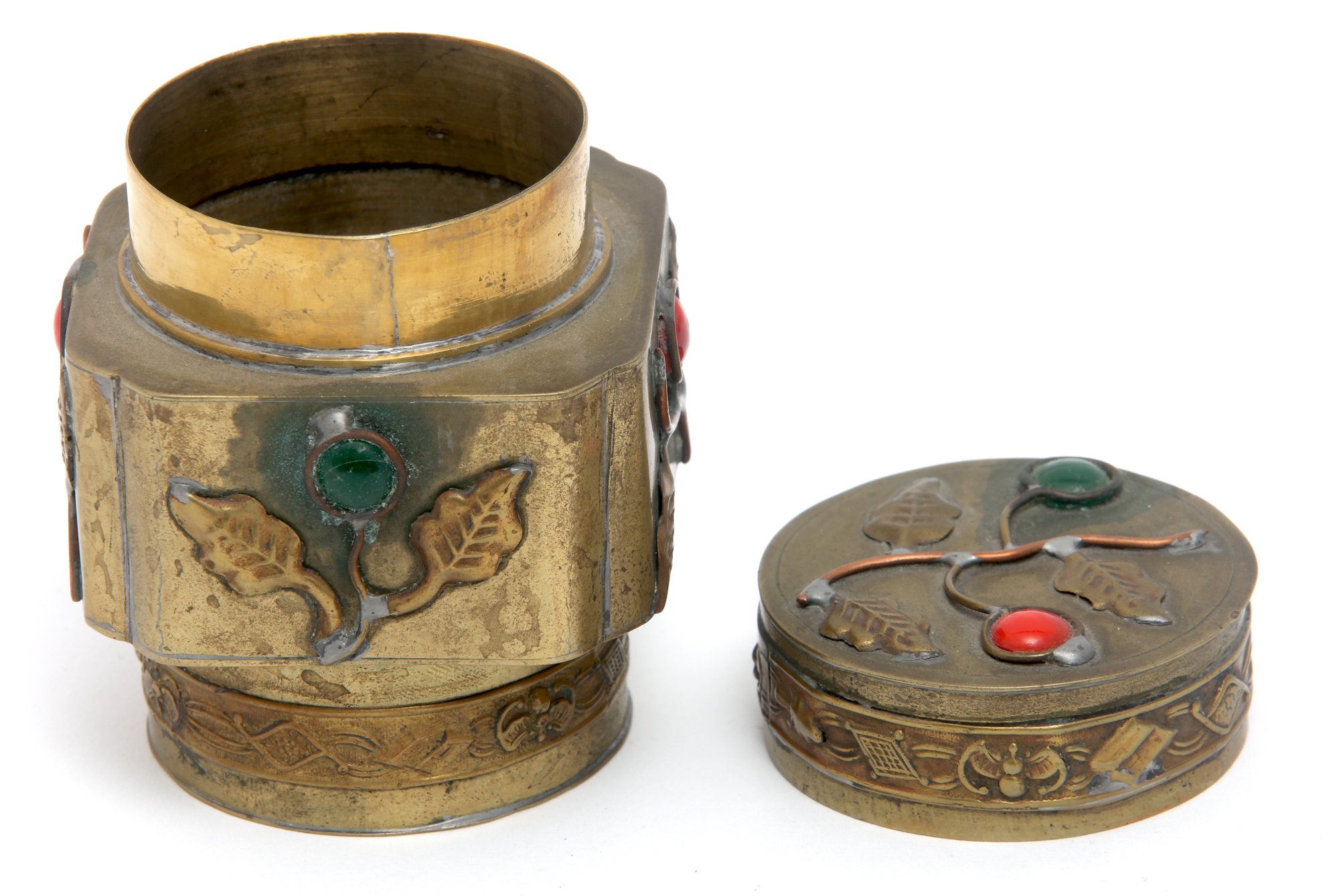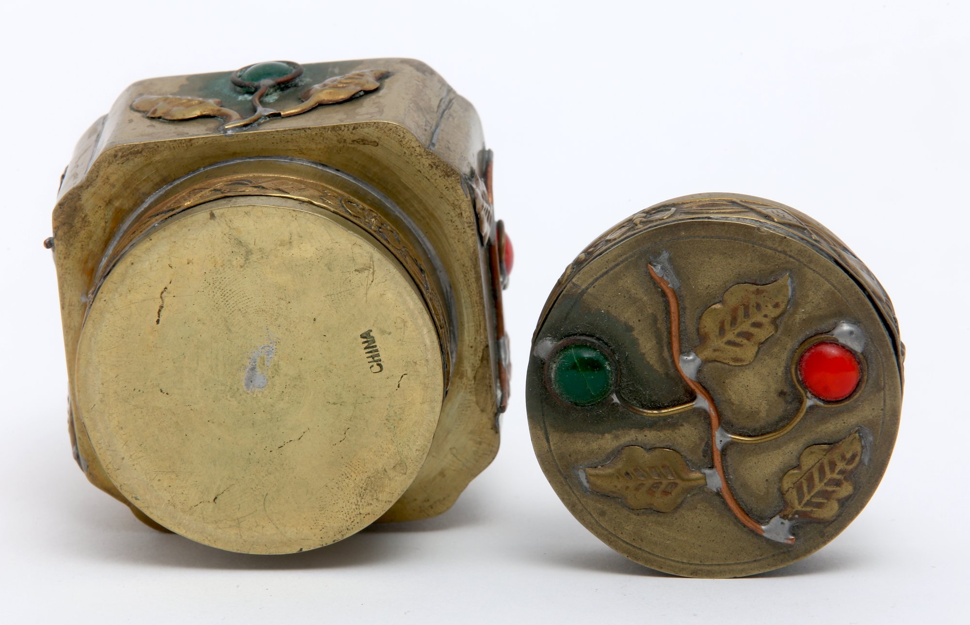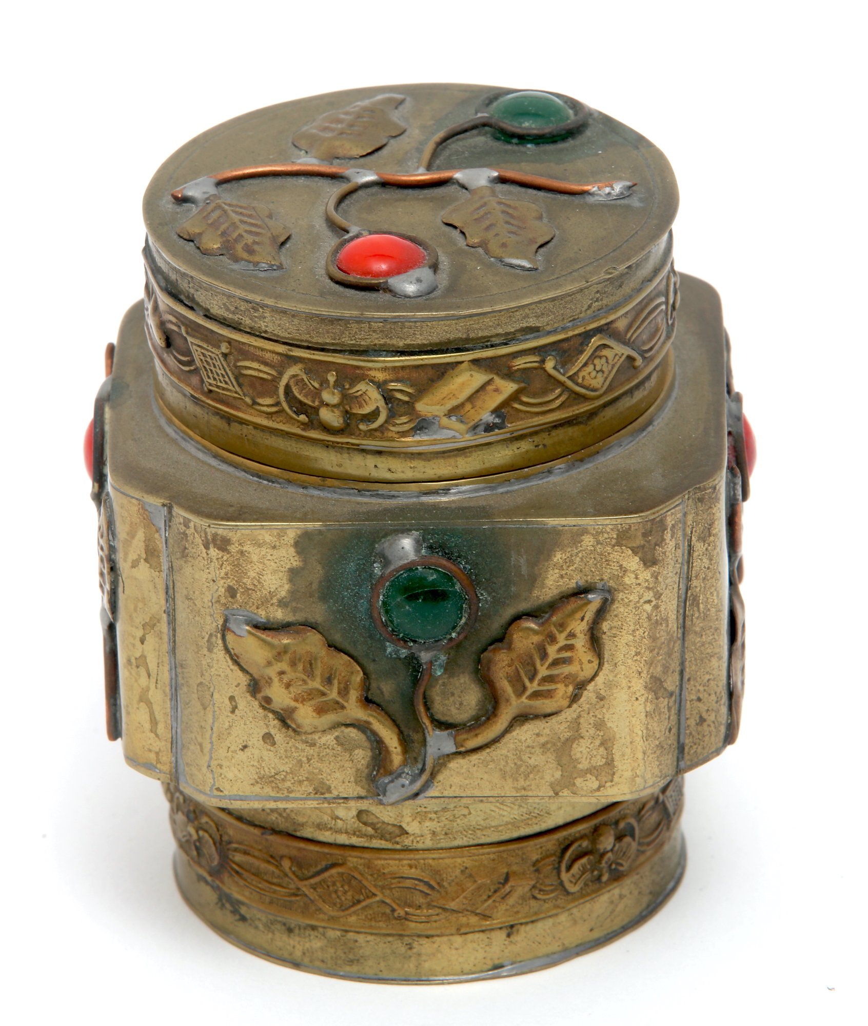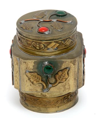Chinese lidded box/container in gilt metal. The design highlights branch tendrils which feature cabochon cut colored stones which represents the fruit. The box which has a China stamp on the bottom is from the first quarter of the 20th century. The tight fitting, ornamented lid would seem to lend itself to storing spices or things of that nature- measures - 3" H X 2.5" W