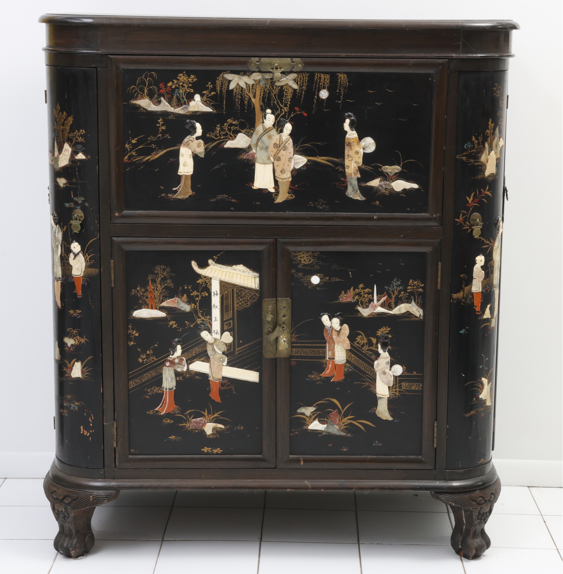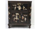 CHINESE BAR CABINET In black and gold lacquered wood with mother-of-pearl and hard stone applications, "figures in an daily scene". Small defects.