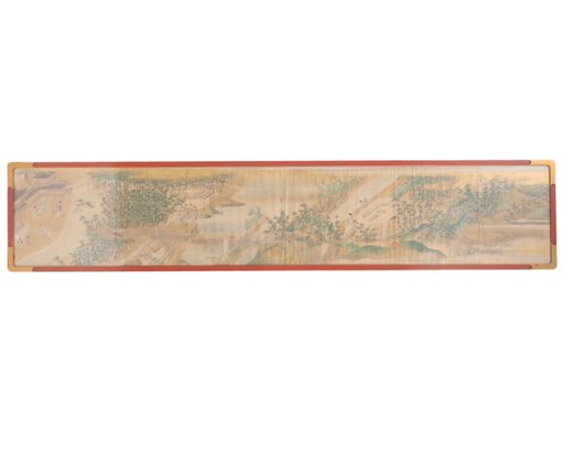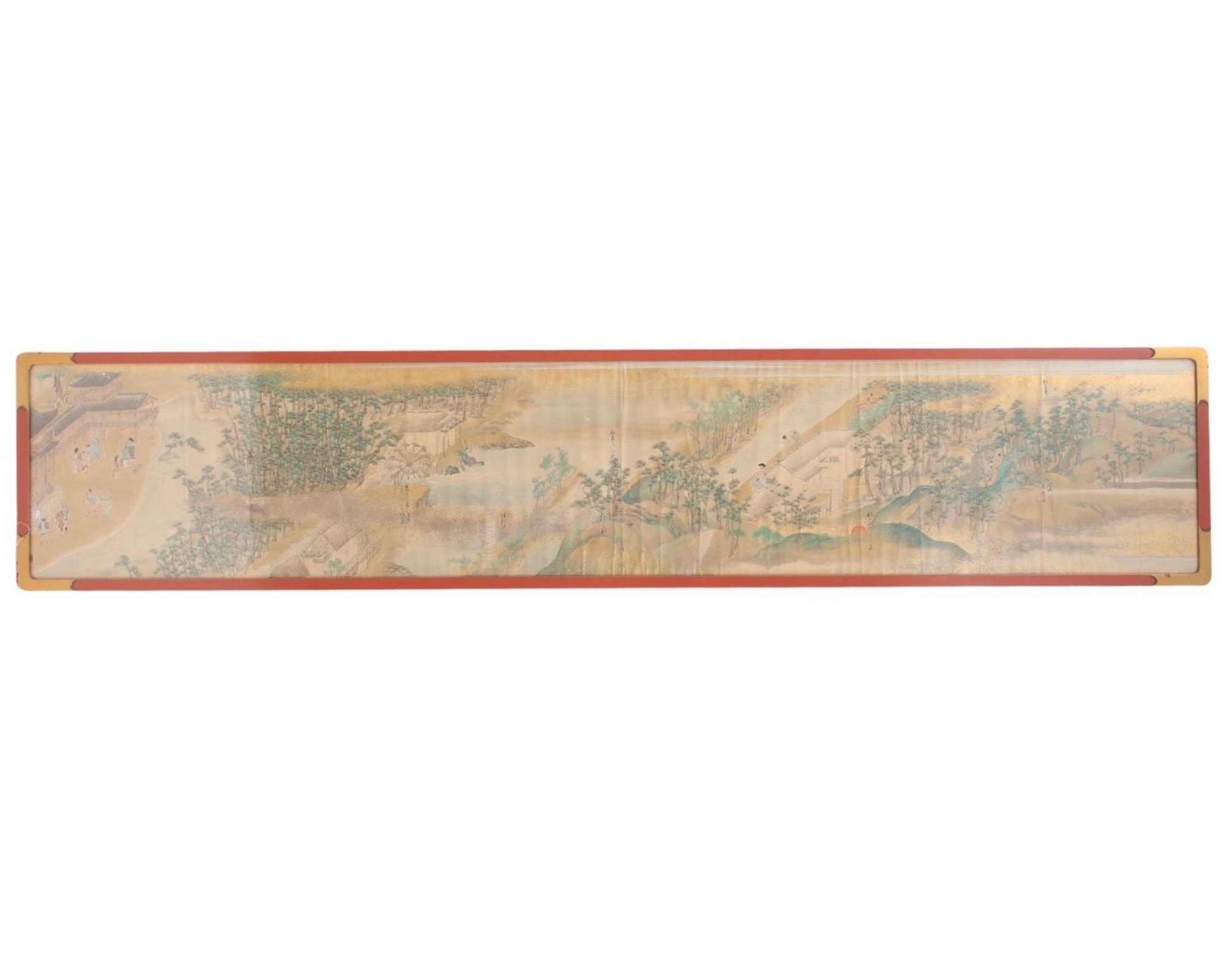 A Chinese watercolor and ink handscroll painting on silk with gold hues of twenty or more figures in a landscape scene attributed to Qiu Ying. Mounted by J. Pocker, New York. The painting has an inscription and two seals, and it is framed and measures 75.5 x 15.5"