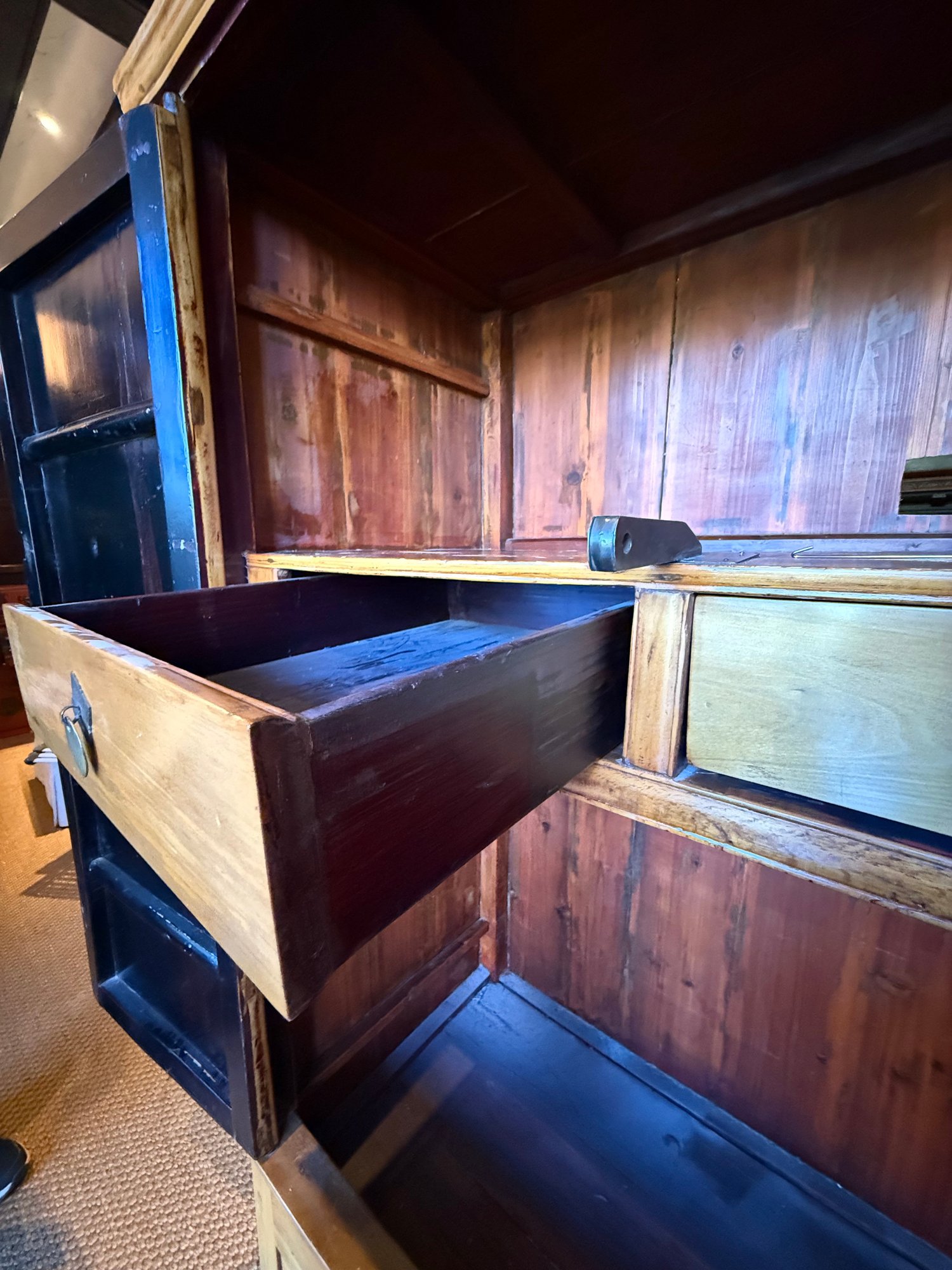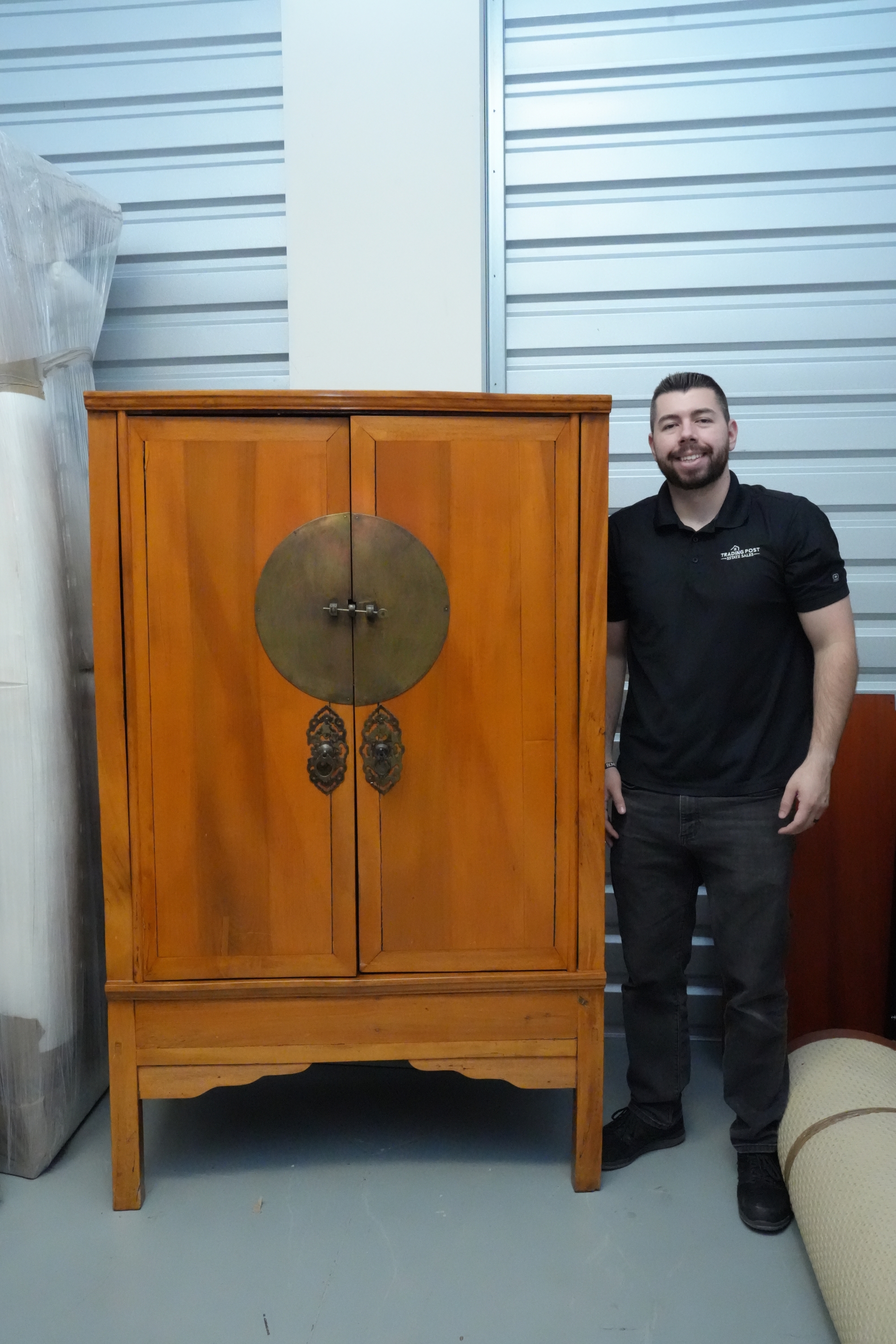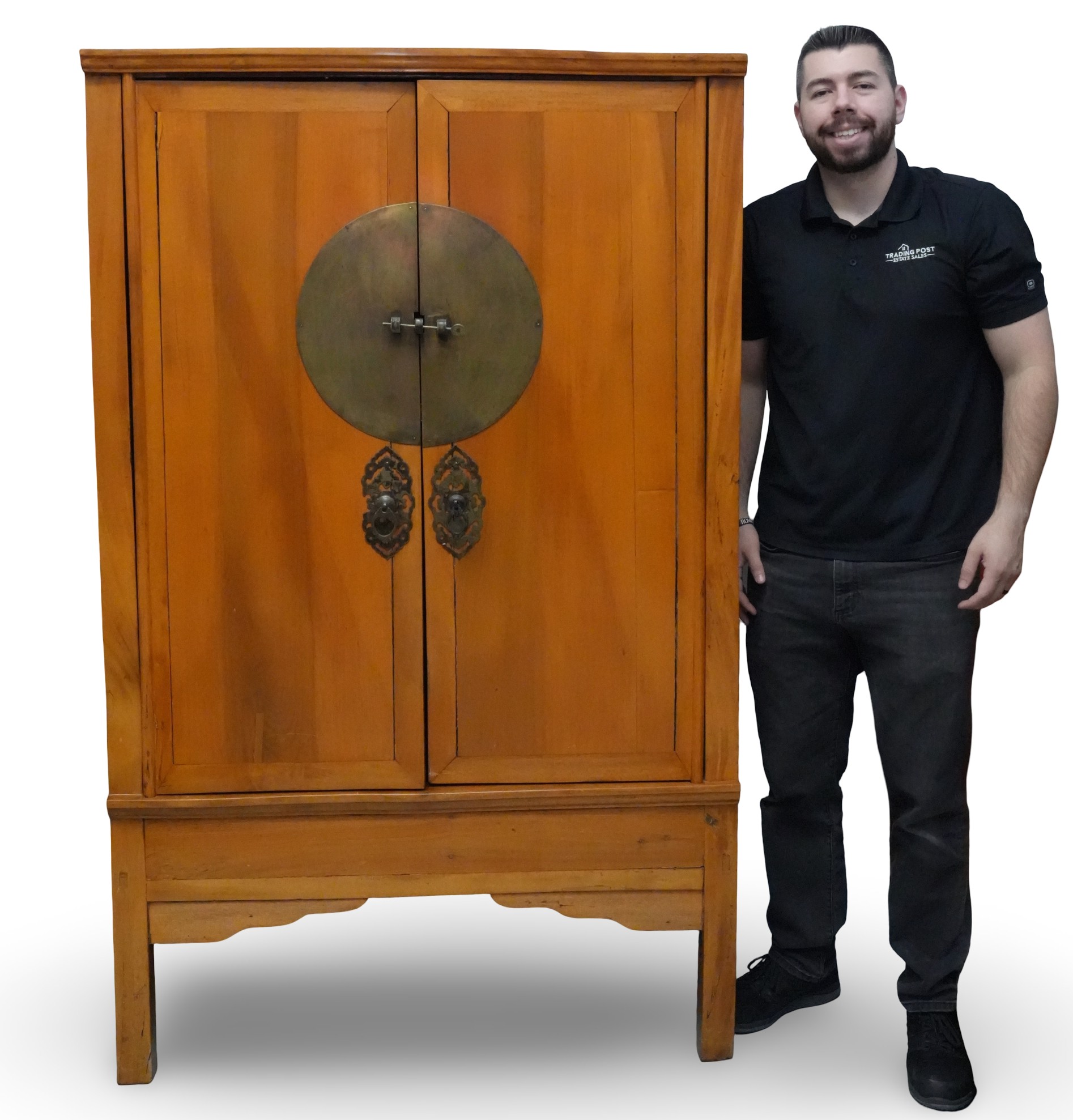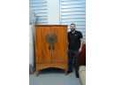 Chinese Qing Dynasty (9th-century) elmwood wedding cabinet or armoire featuring a large, round brass medallion and pulls on the front doors.