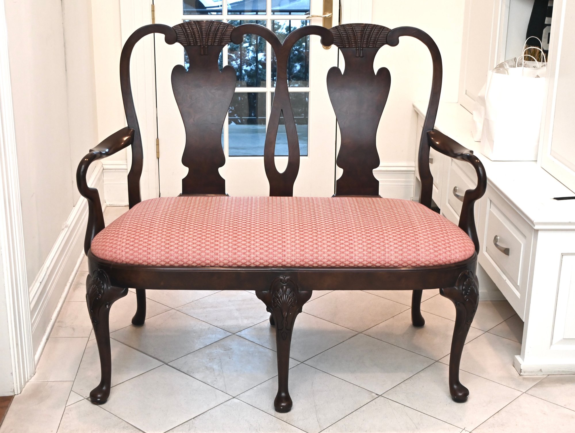 This beautifully crafted Chippendale-style settee showcases elegant design elements with a dark wood frame and intricate detailing. The backrest features two splats with classic urn-shaped cutouts, topped with a finely carved shell motif. Gracefully curved arms provide additional comfort and style, while the cabriole legs, adorned with subtle carved accents, enhance its refined aesthetic. The seat is upholstered in a red and cream geometric-patterned fabric, offering a sophisticated contrast to the dark wood.