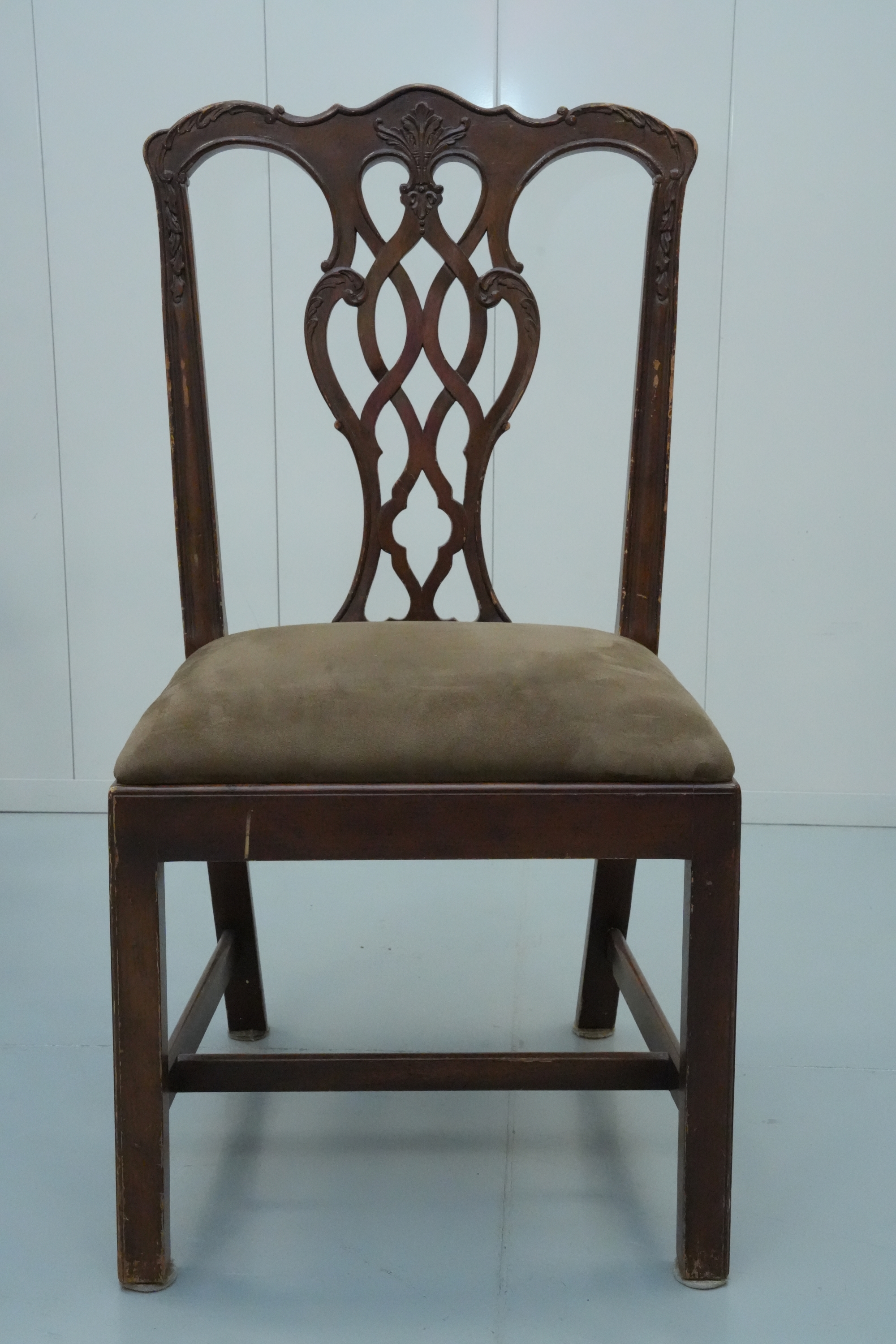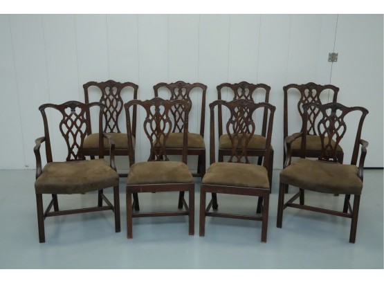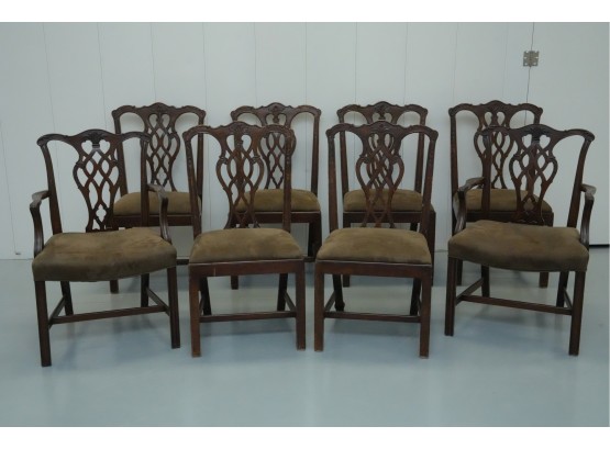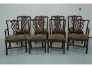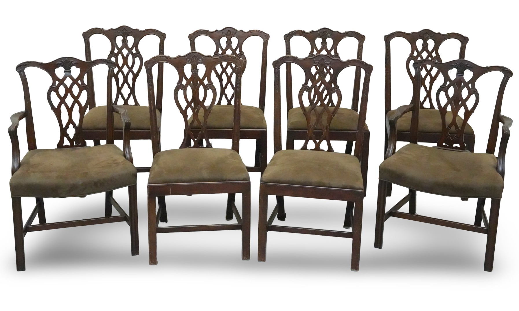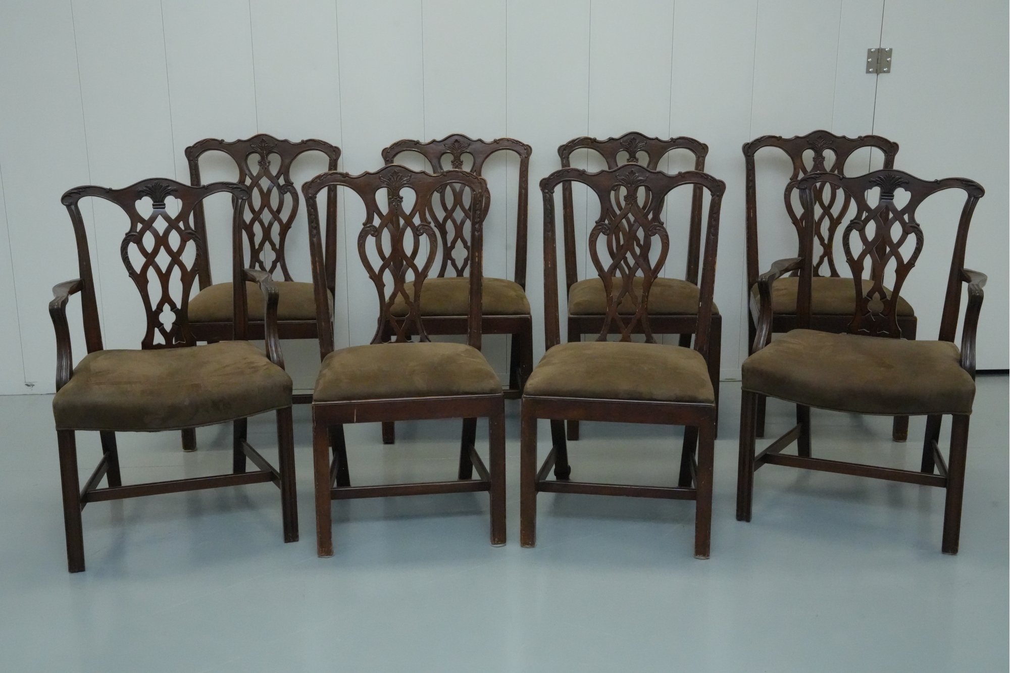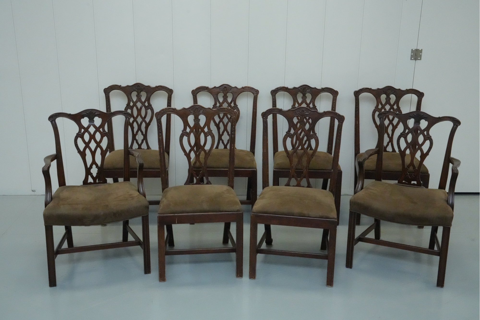 Set of eight Chippendale-style mahogany dining chairs with upholstered fabric seats, six side chairs and two armchairs. Some signs of wear due to age and use.